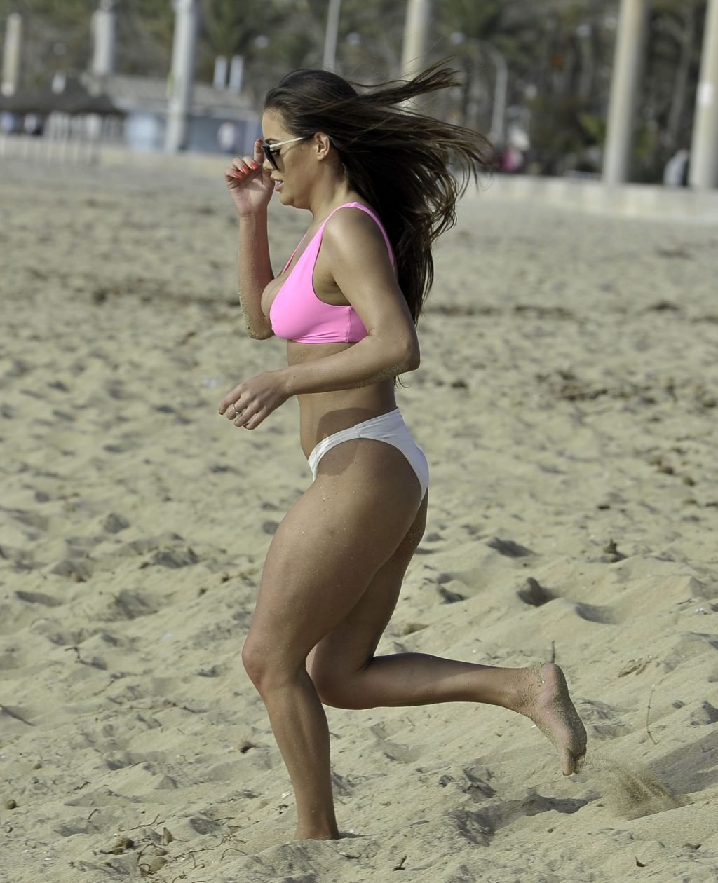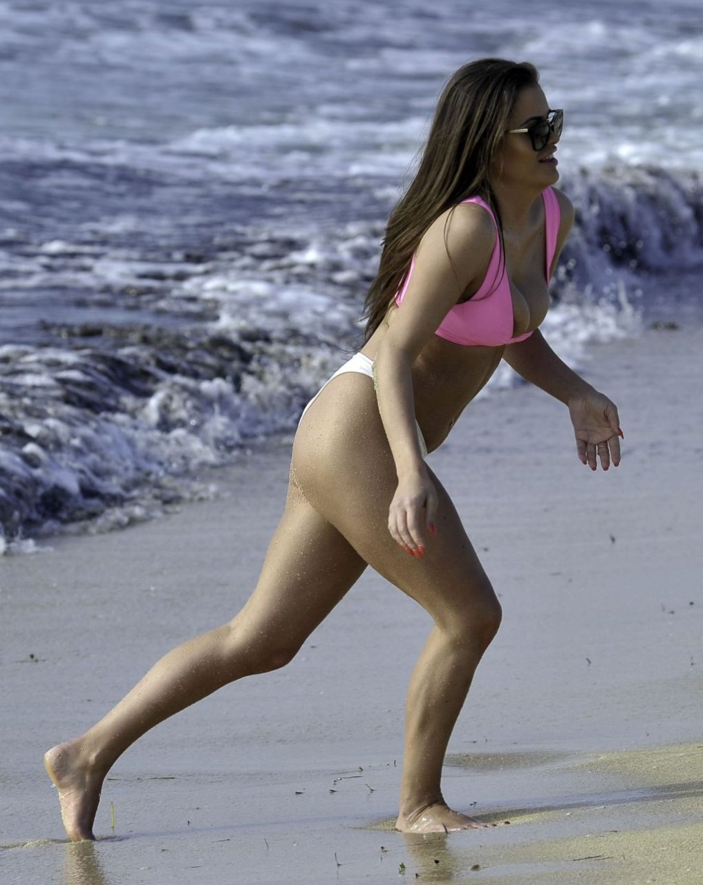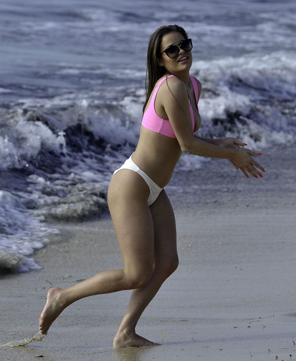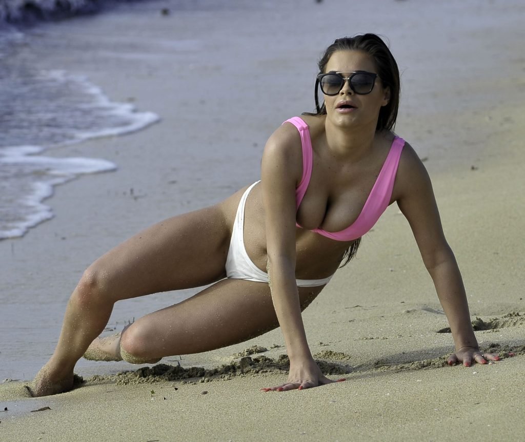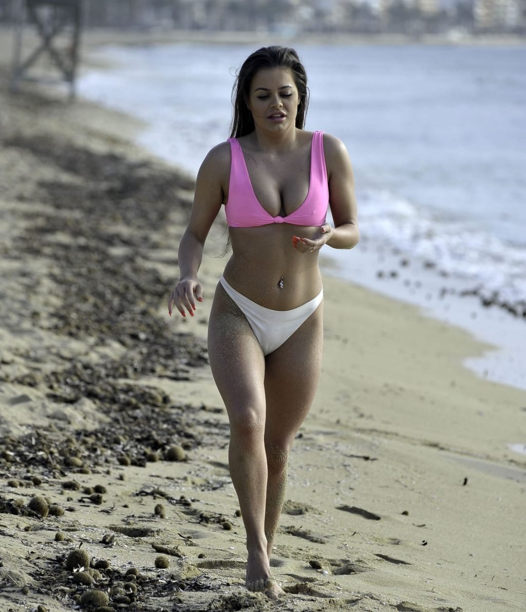 “Ex on the Beach” S9 Rhianne Saxby lucha por contener sus atributos mientras estalla de su bikini rosa brillante durante una escapada en solitario a España, mientras juega en la playa mostrando sus enormes atributos, 01/08/2019.