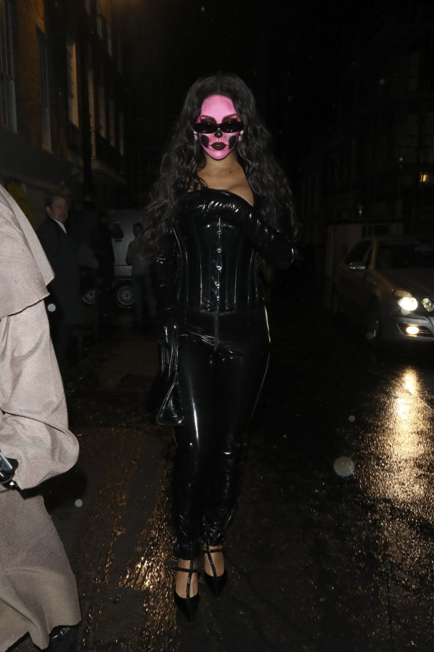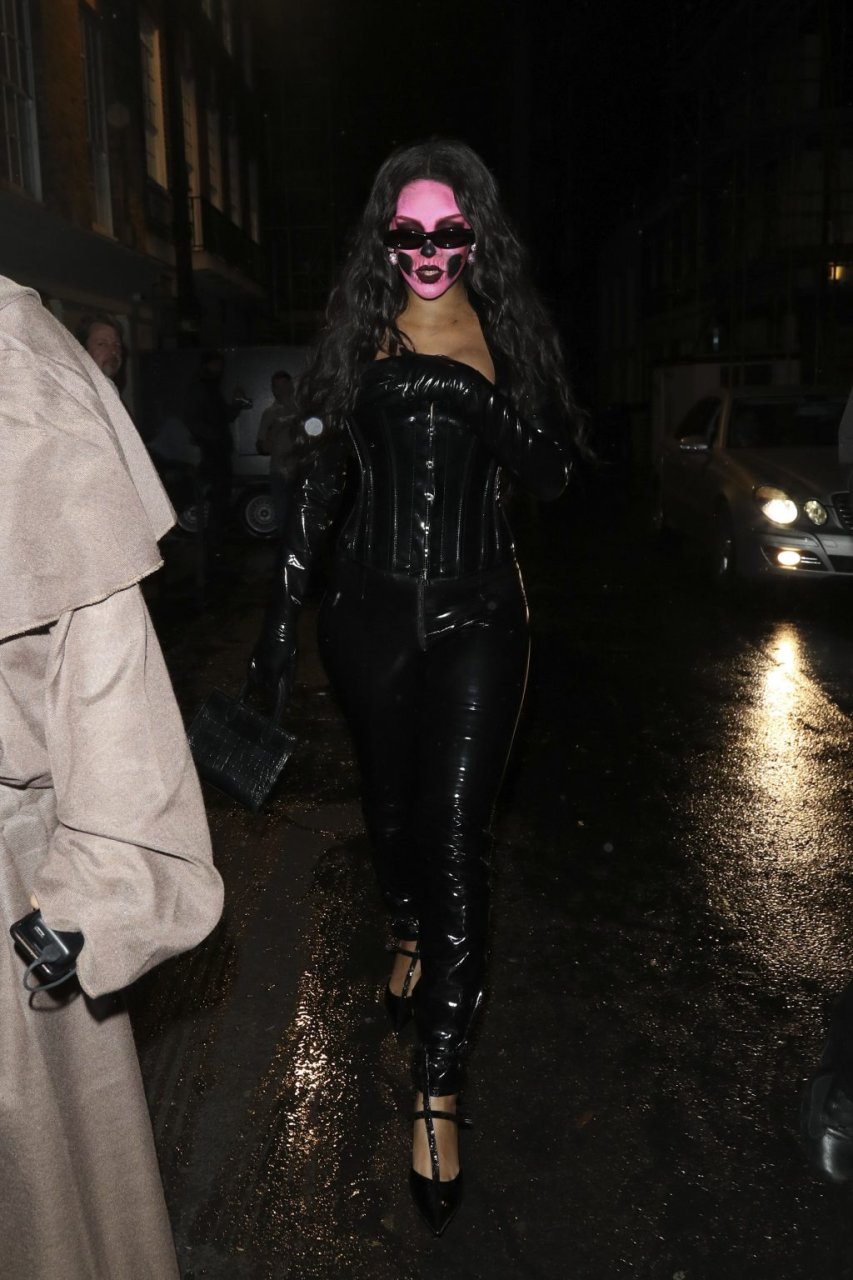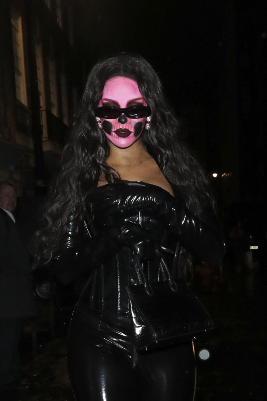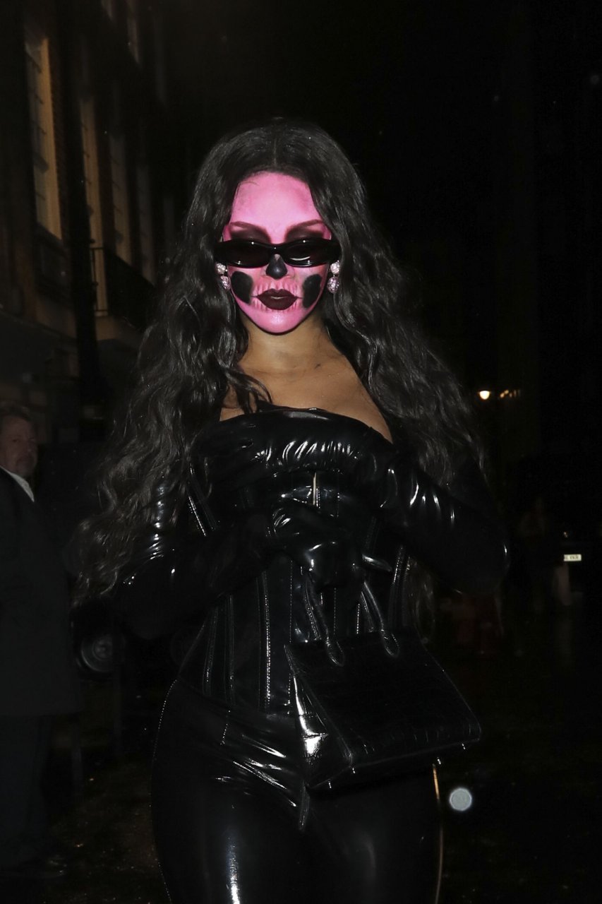 Rihanna luce una apariencia voluptuosa en una fiesta de Halloween en Londres, 31/10/2018. La cantante barbadense mostró sus curvas con un bustier de cuero negro patentado y medias, con maquillaje facial de calaveras rosas y tacones puntiagudos.