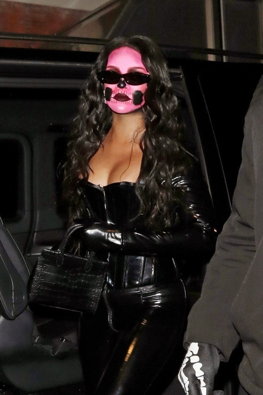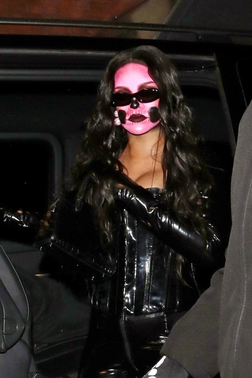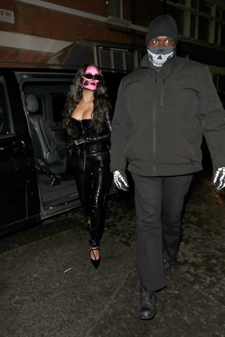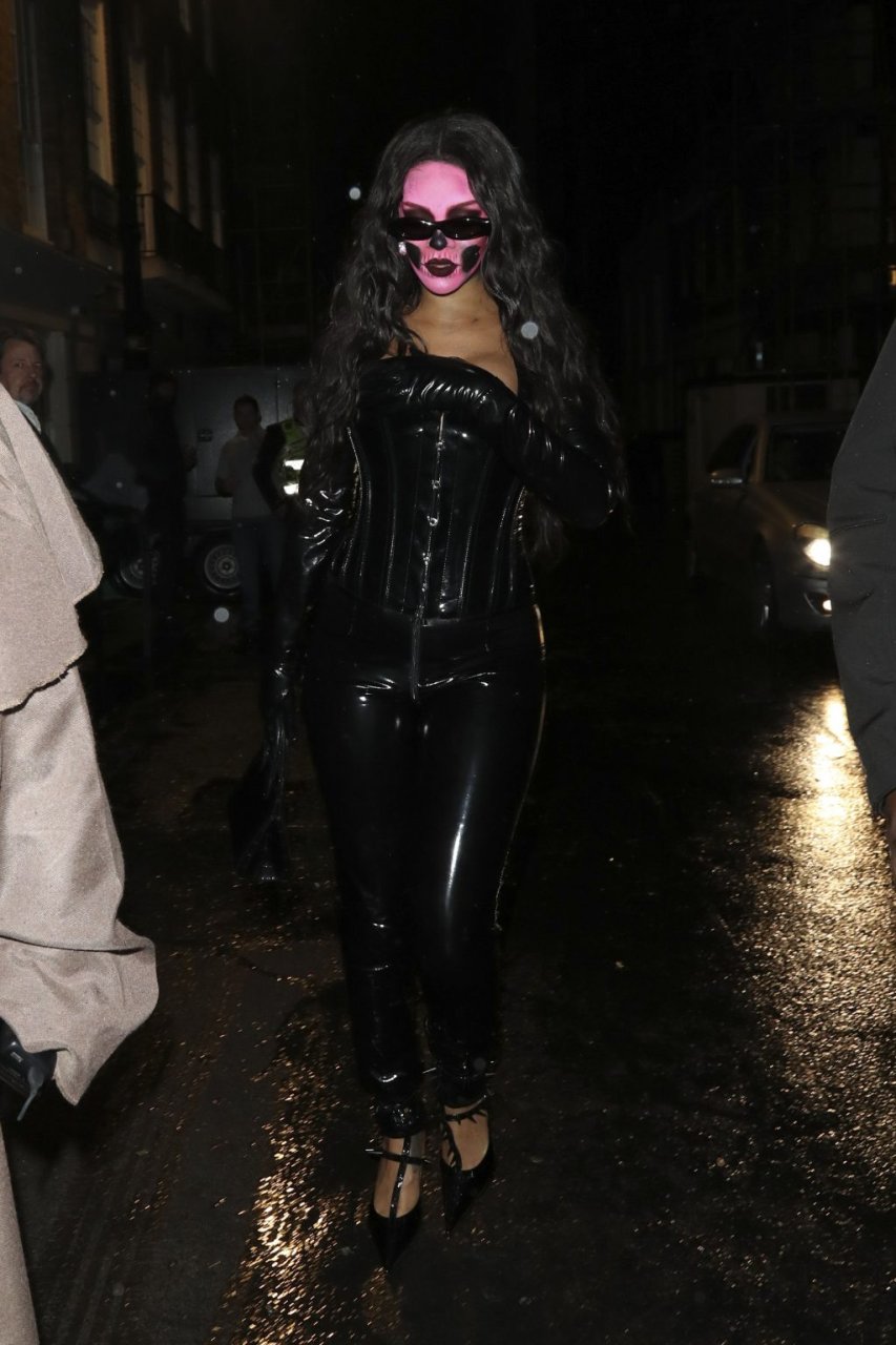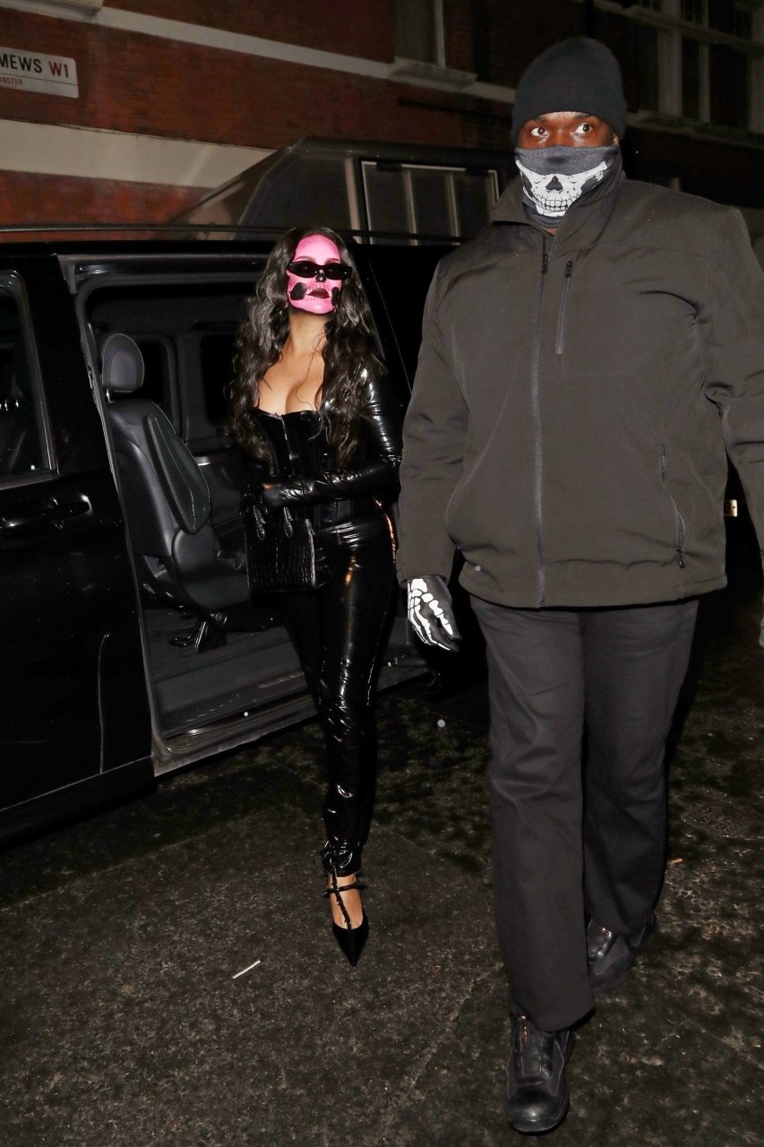 Rihanna luce una apariencia voluptuosa en una fiesta de Halloween en Londres, 31/10/2018. La cantante barbadense mostró sus curvas con un bustier de cuero negro patentado y medias, con maquillaje facial de calaveras rosas y tacones puntiagudos.