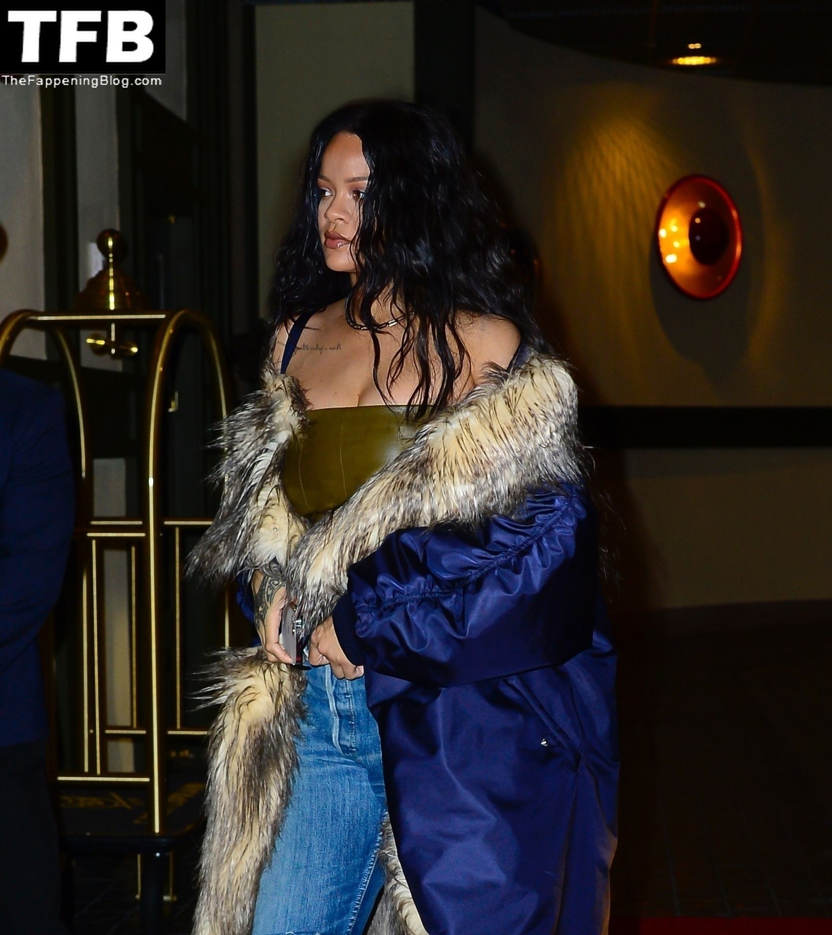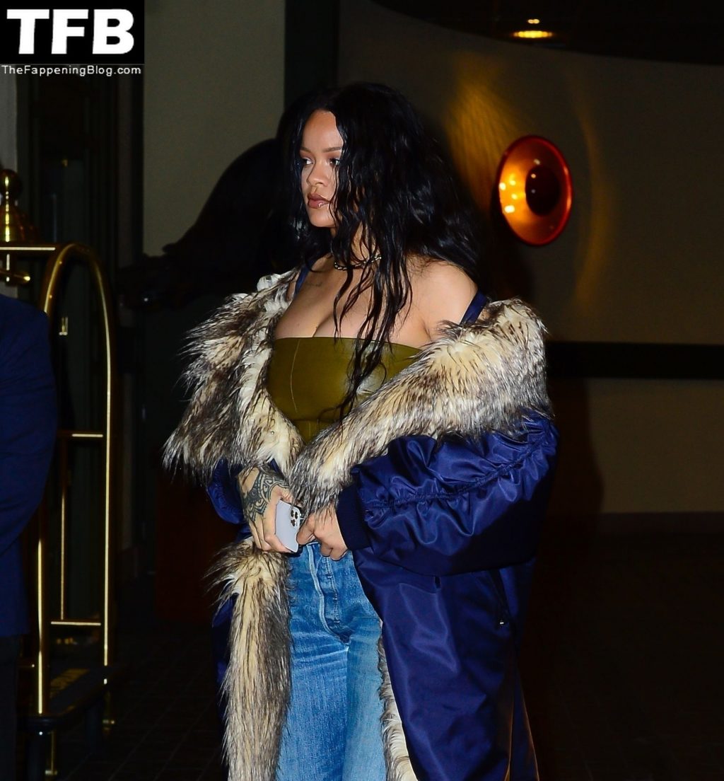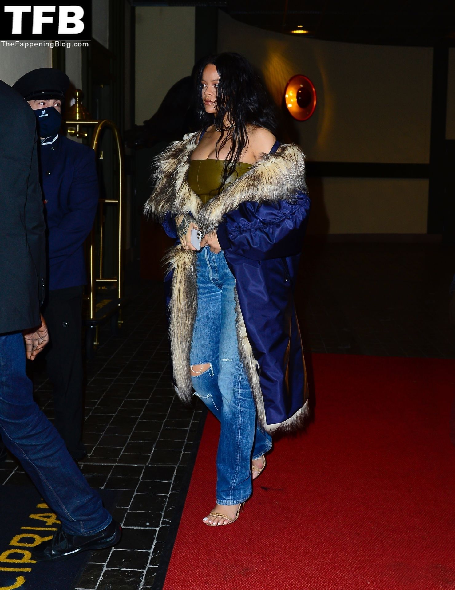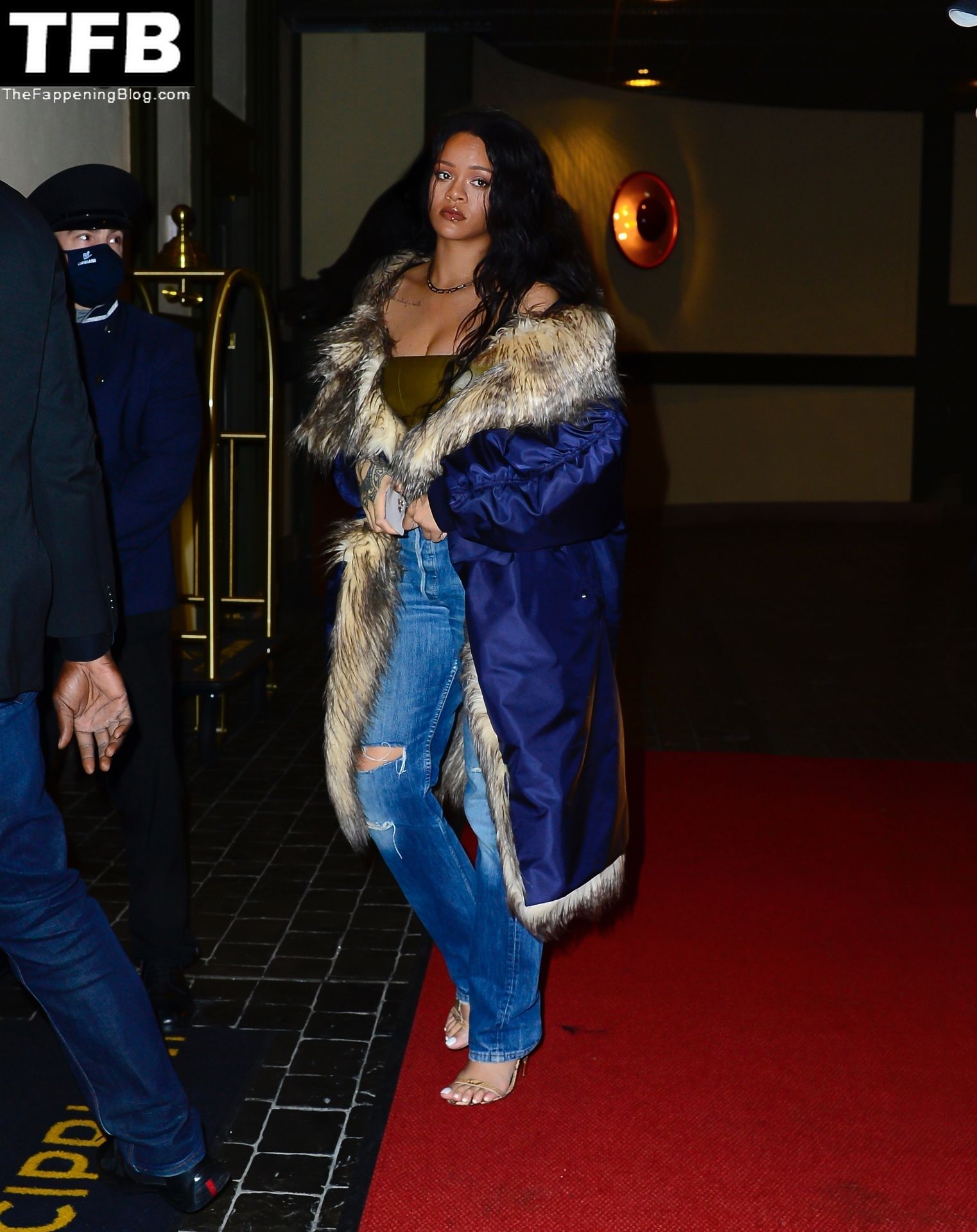 La estrella de The Fappening Rihanna roba la escena luciendo un abrigo llamativo combinado con jeans mientras cena en NYC antes de volar a Los Ángeles, 11/04/2021.
