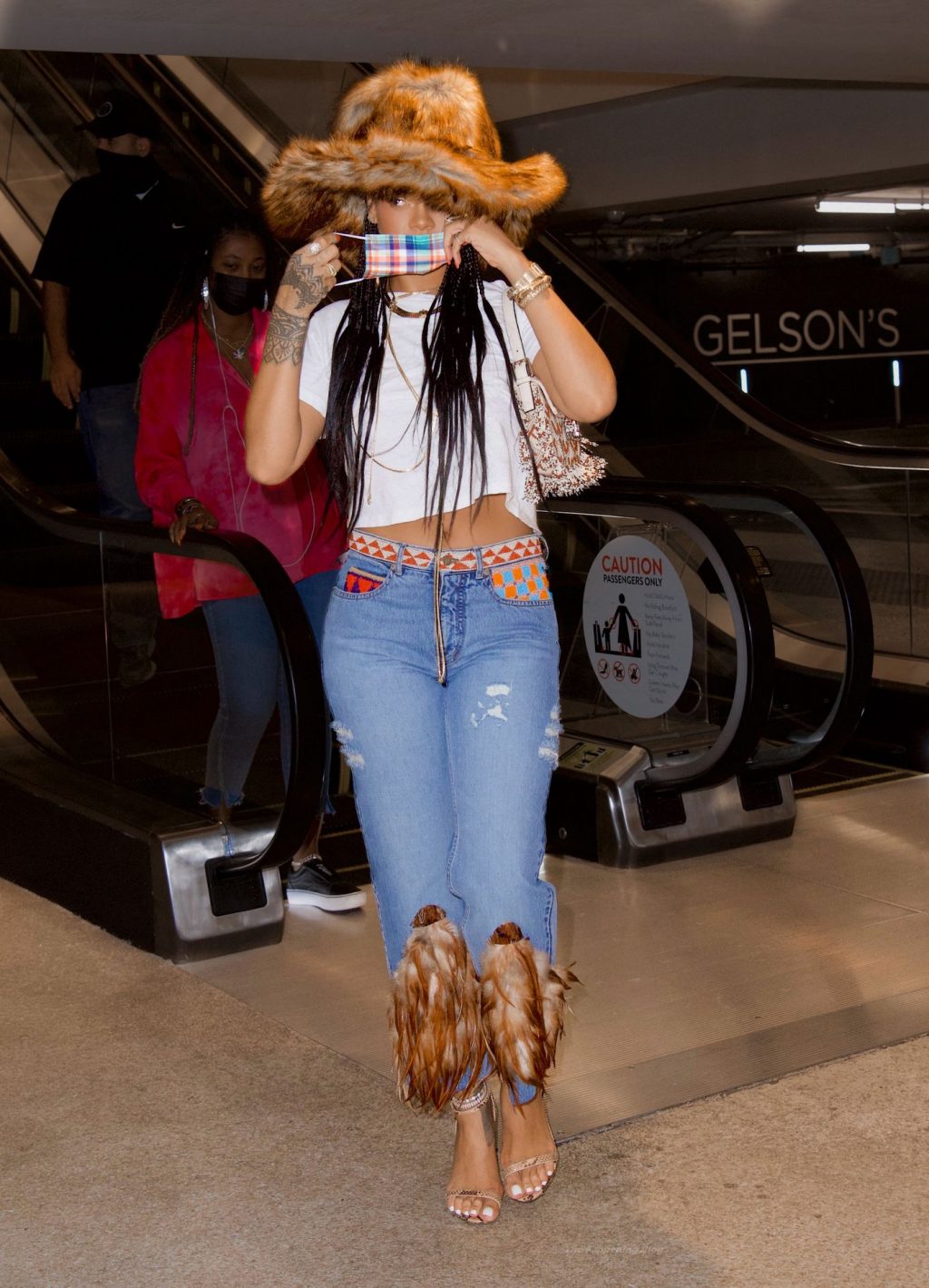 La creadora de tendencias de moda llevaba un enorme sombrero de piel de Marc Jacobs y un par de jeans vintage Gucci by Tom Ford con plumas valorados en más de $15,000. La cantante de 33 años, número uno en las listas, llevaba un vibrante lápiz labial rojo que se podía ver cuando se colocaba la mascarilla.