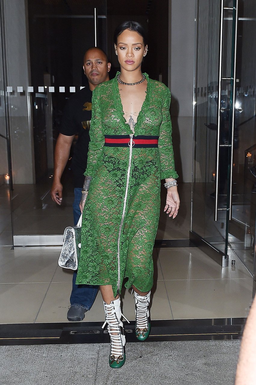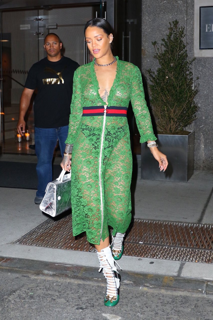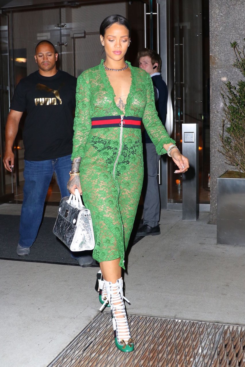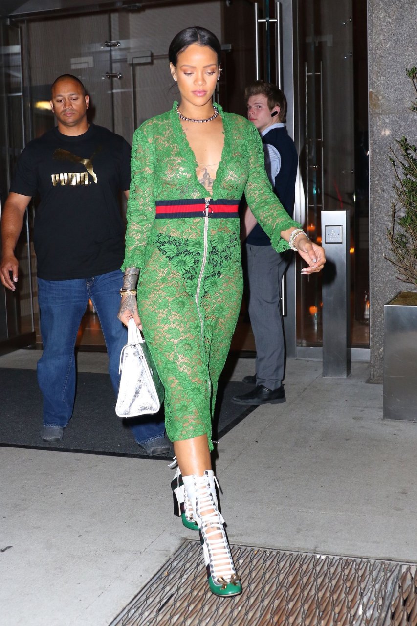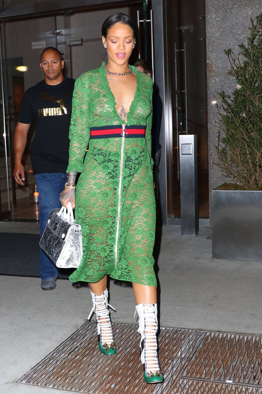Rihanna vista con vestido de encaje verde en Nueva York, 25/05/2016. ¡Sin sujetador de nuevo! Rihanna es una cantante y diseñadora de moda estadounidense. Edad: 28 (20 de febrero de 1988).