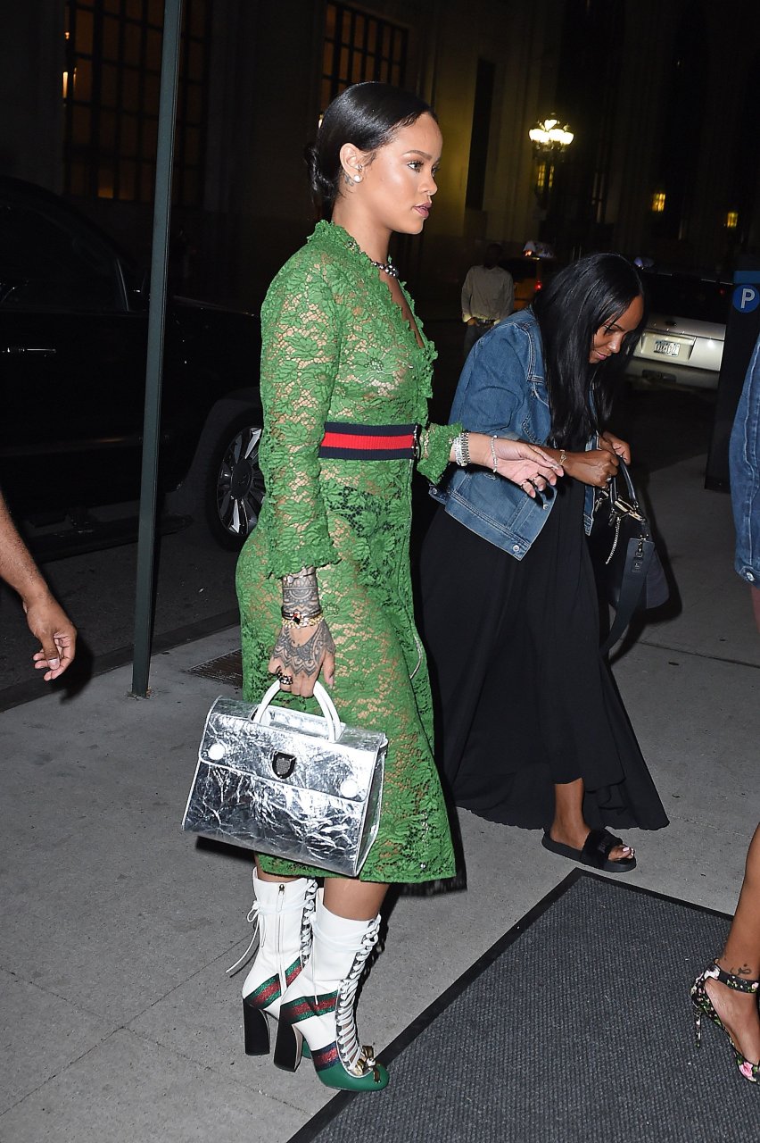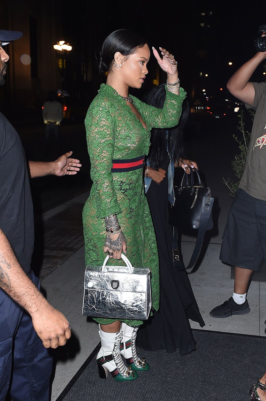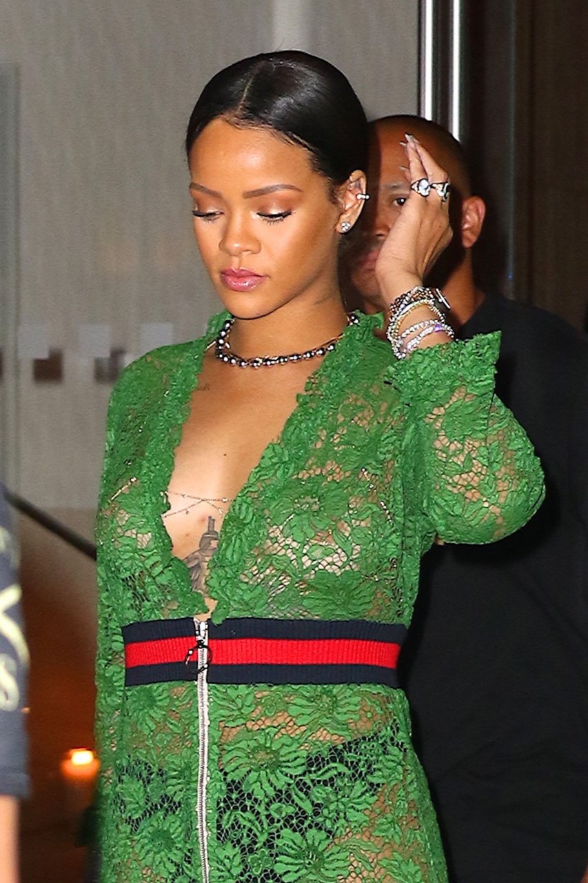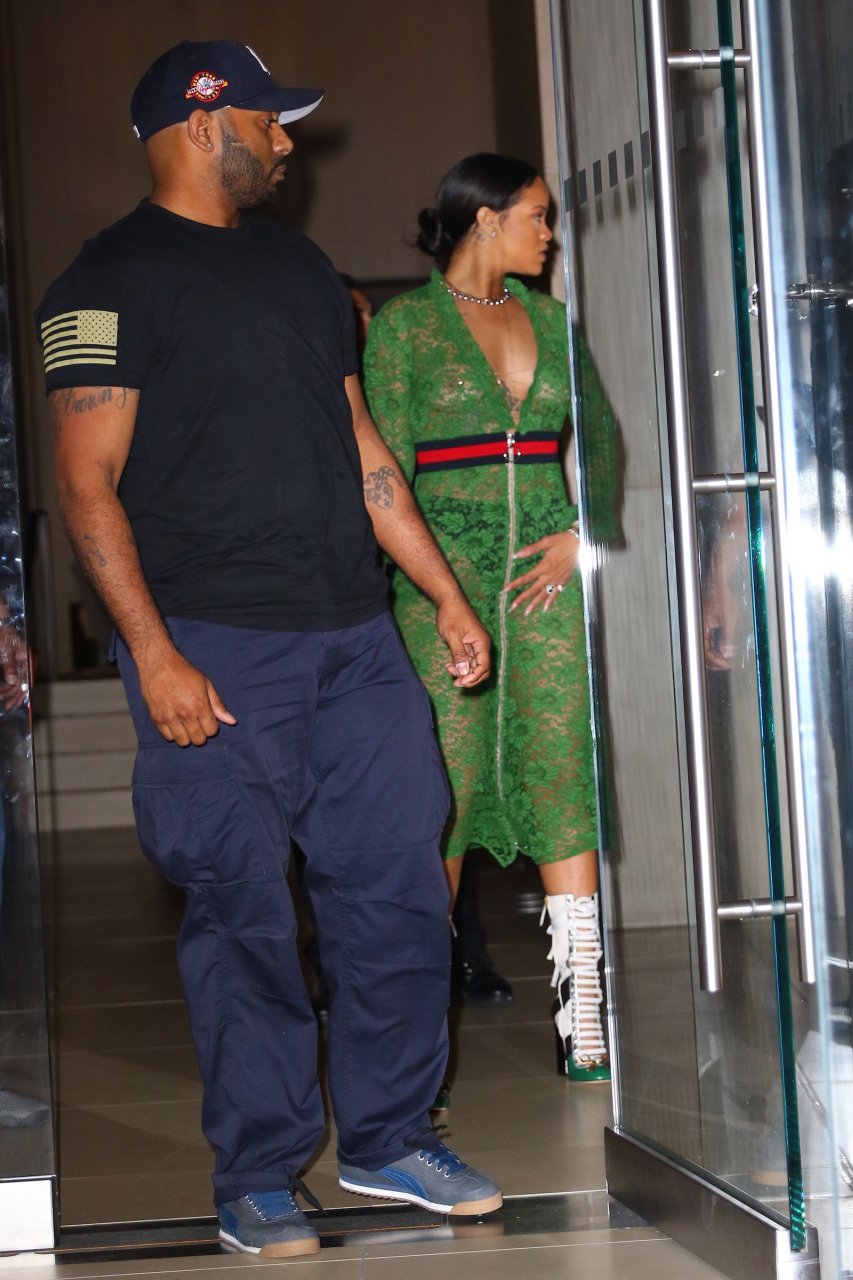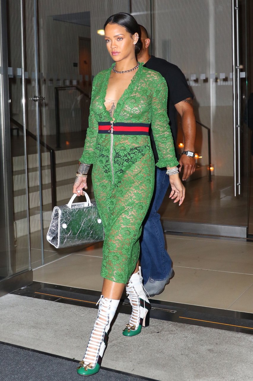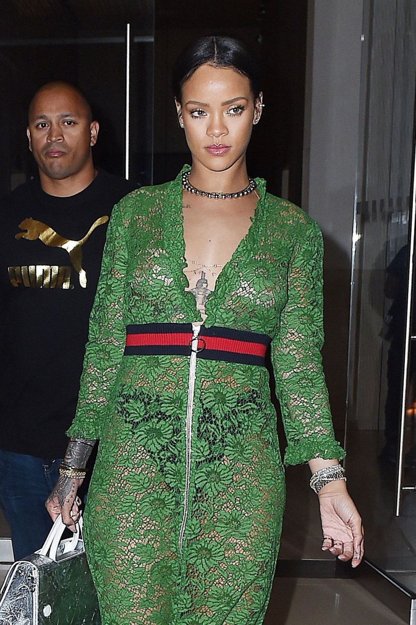 Rihanna vista con vestido de encaje verde en Nueva York, 25/05/2016. ¡Sin sujetador de nuevo! Rihanna es una cantante y diseñadora de moda estadounidense. Edad: 28 (20 de febrero de 1988).