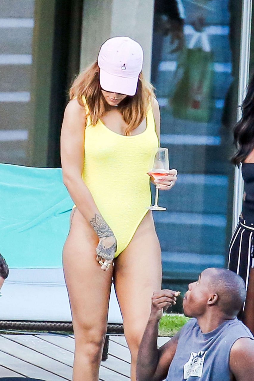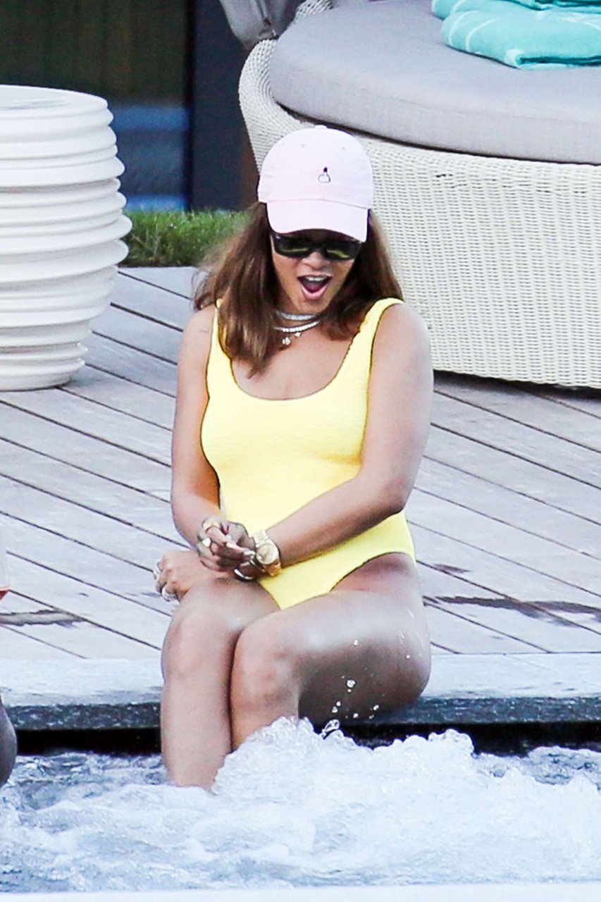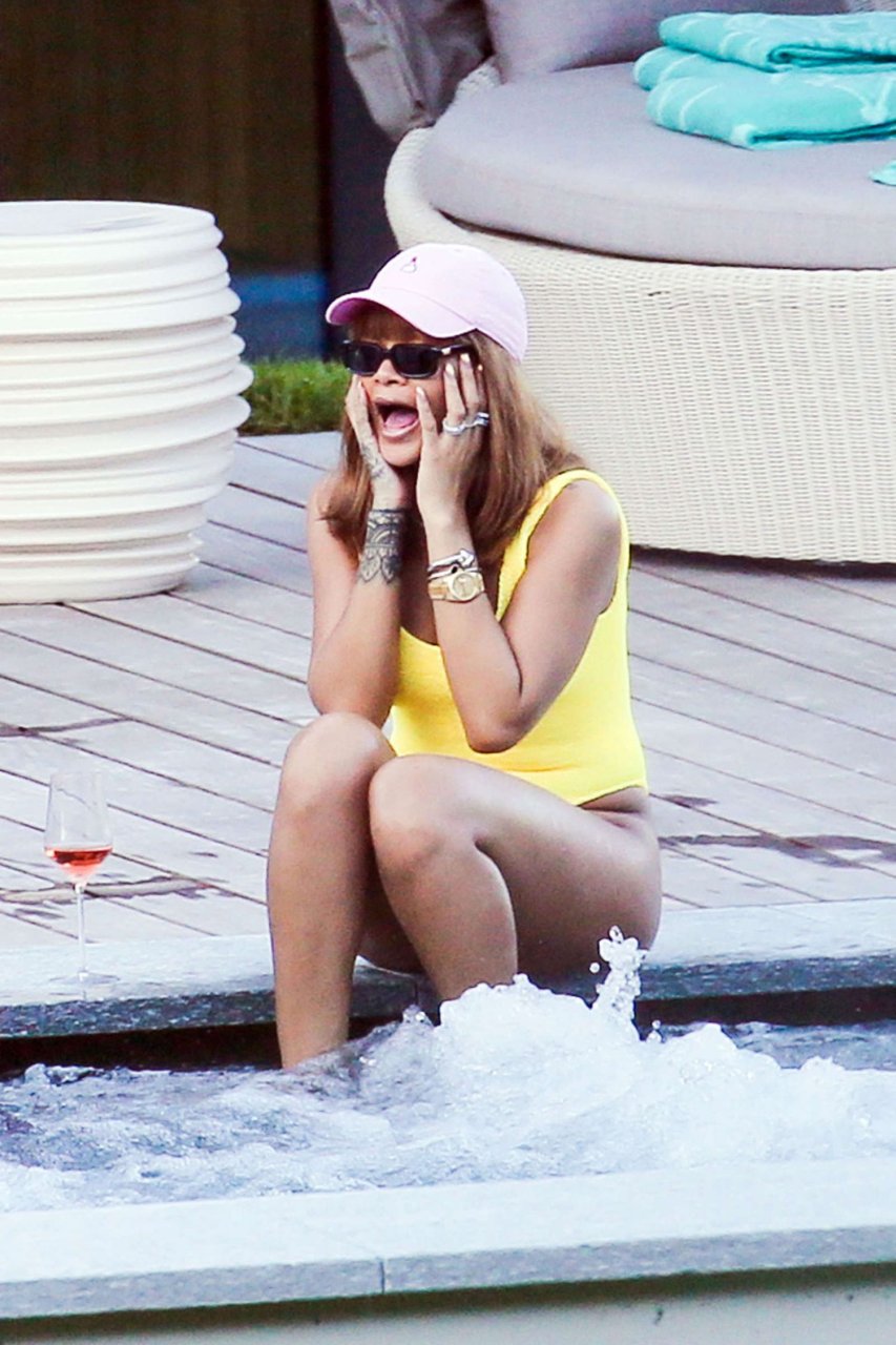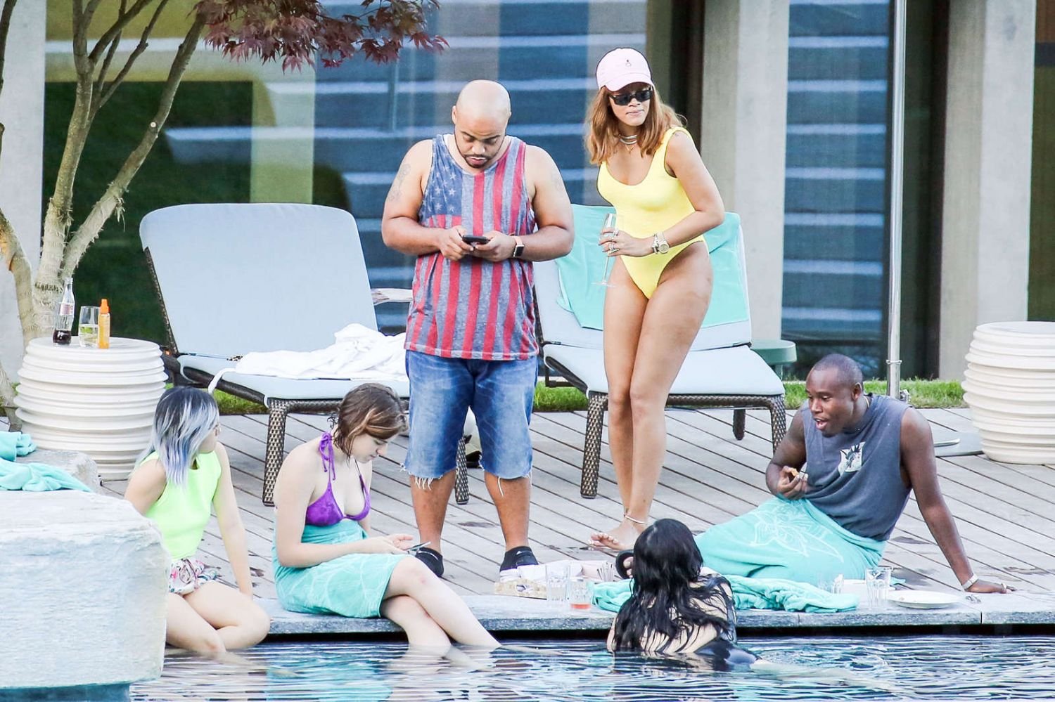 Rihanna disfrutó de un merecido descanso mientras se relajaba junto a la piscina en su casa en Zúrich (agosto de 2016). ¡El amarillo es el nuevo negro! Rihanna es una cantante y diseñadora de moda estadounidense. Edad: 28 (20 de febrero de 1988).