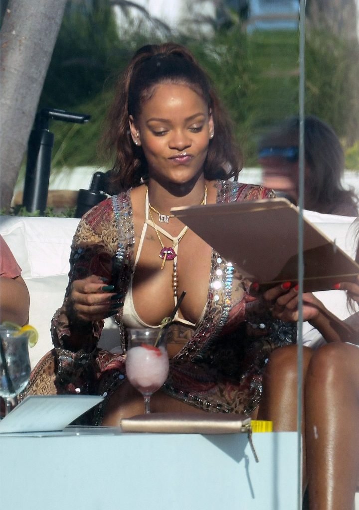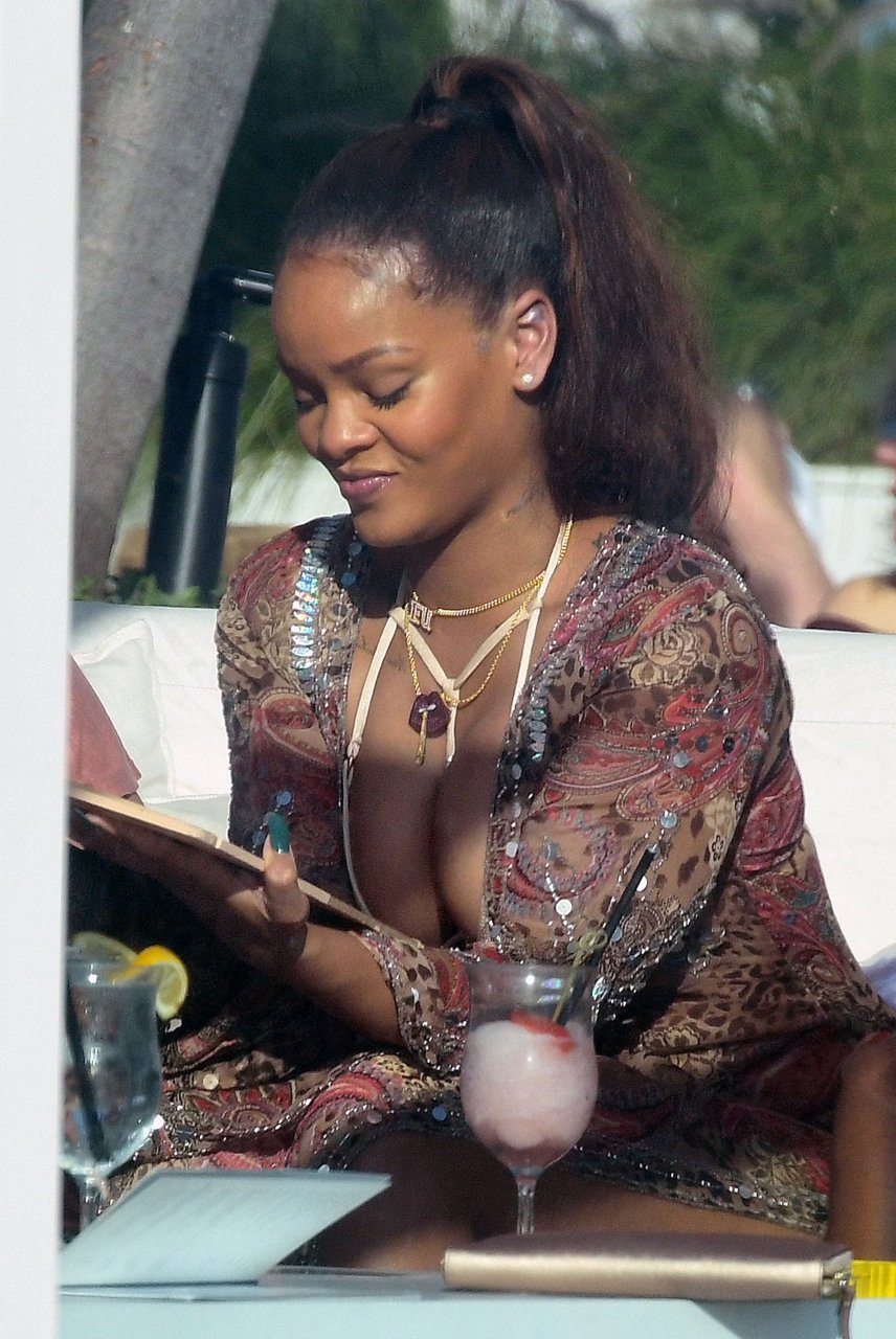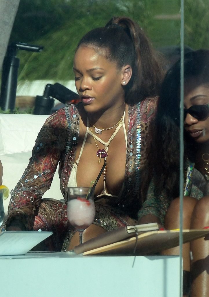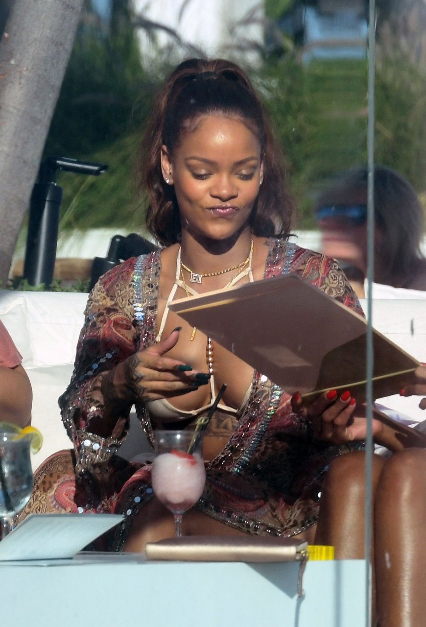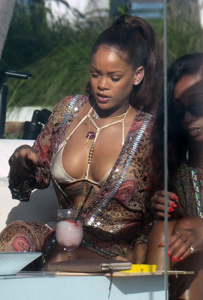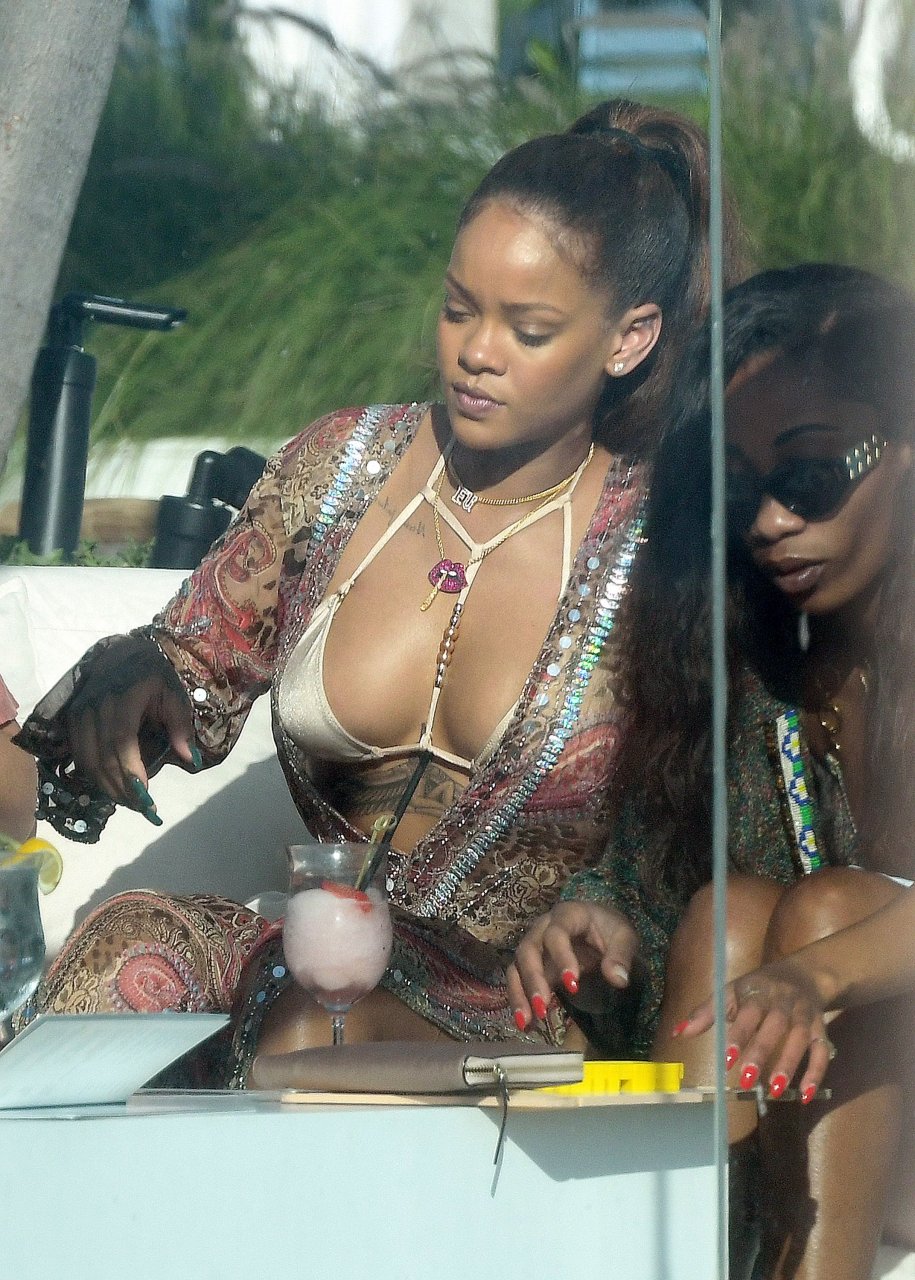 Rihanna presume de escote en un bikini sexy mientras la cantante de busto generoso se relaja junto a la piscina en Miami, 03/08/2017. Robyn Rihanna Fenty es una cantante, compositora y actriz barbadense. Edad: 29.