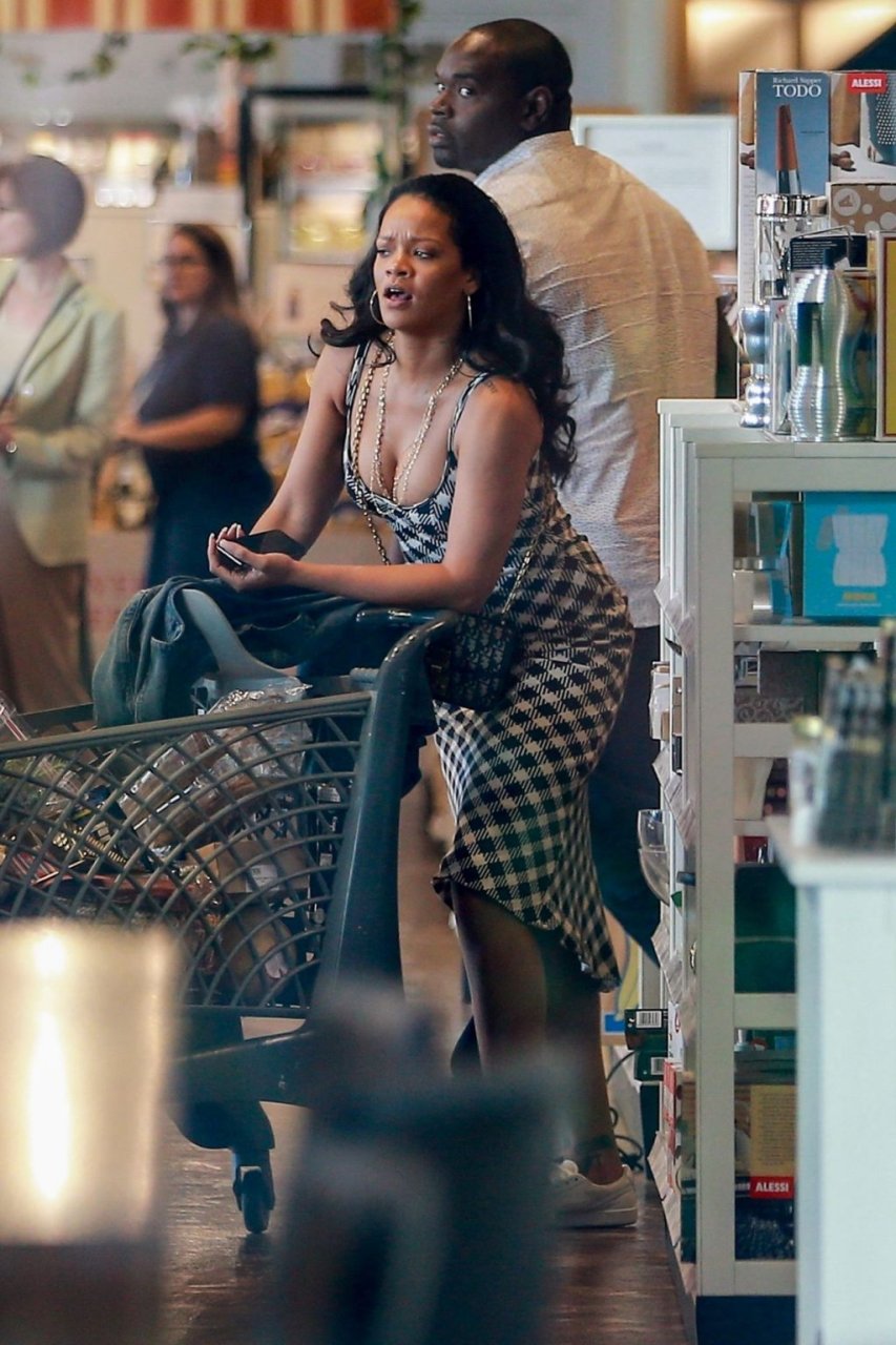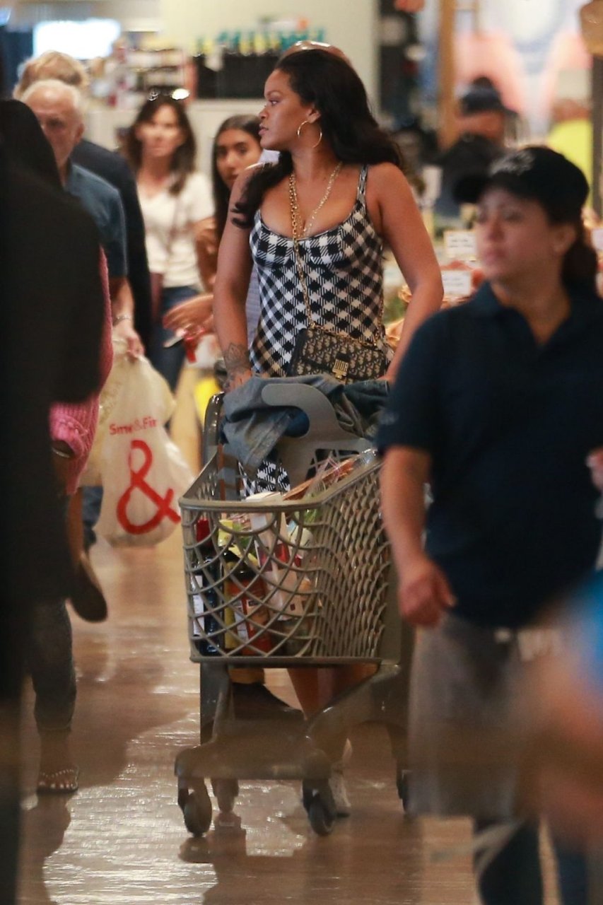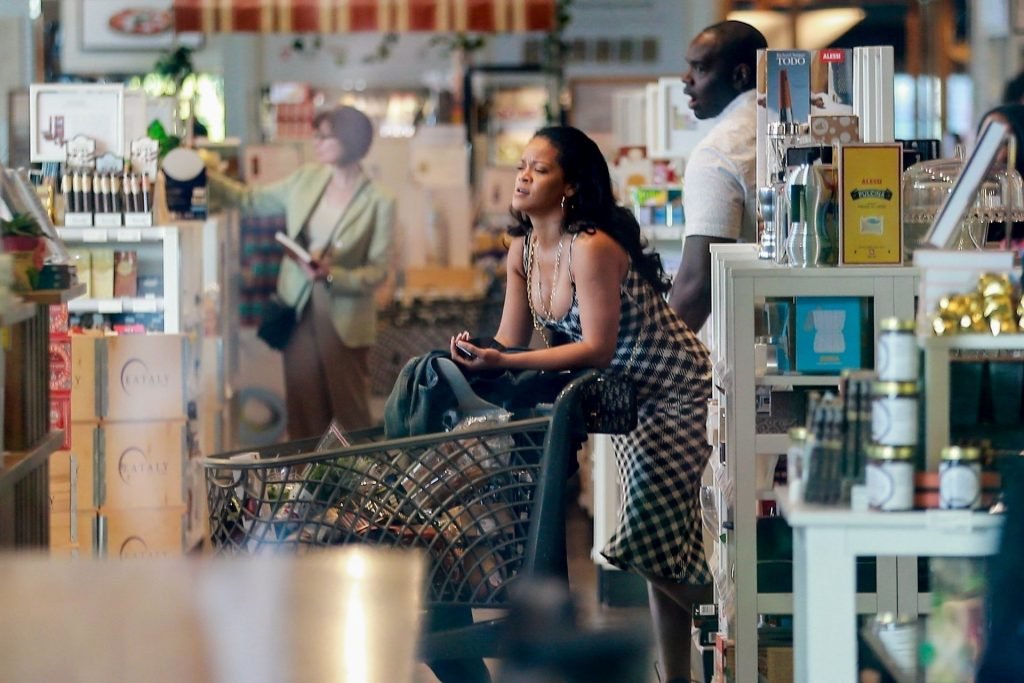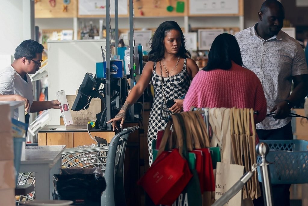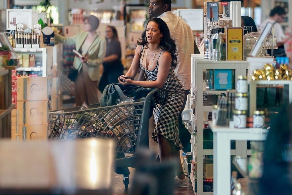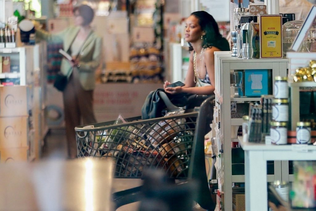 Rihanna puede valer 600 millones de dólares, pero parece que aún puede hacer sus propias compras de supermercado. La cantante fue vista empujando un carrito de compras por Eataly en el Westfield Mall con su amiga y un par de guardaespaldas, donde cargó vino, albahaca y otros productos gourmet, 08/08/2019.