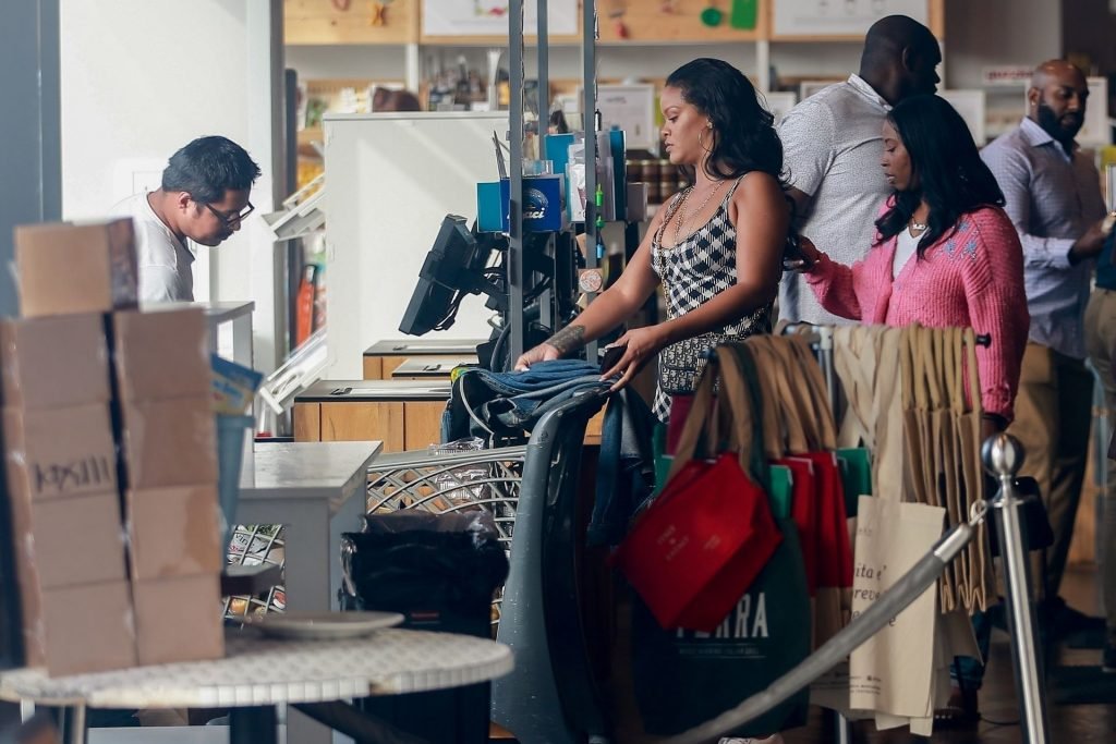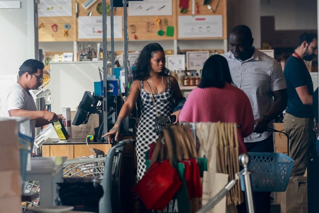 Rihanna lucía un vestido blanco y negro con escote pronunciado, probó delicias y pidió una pizza en su restaurante, que terminó felizmente.