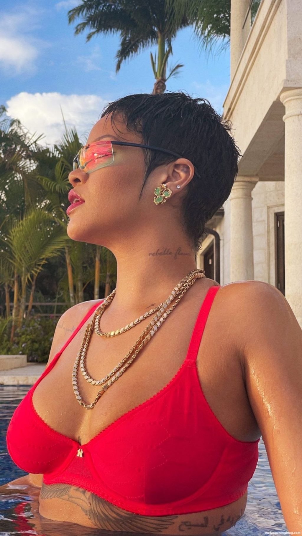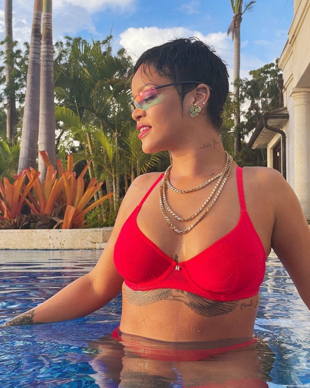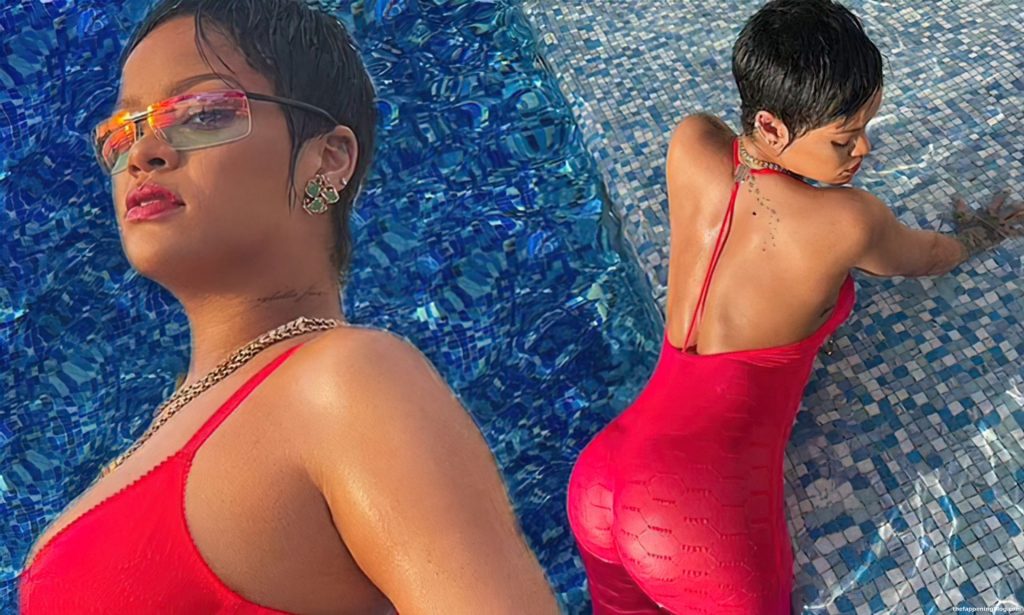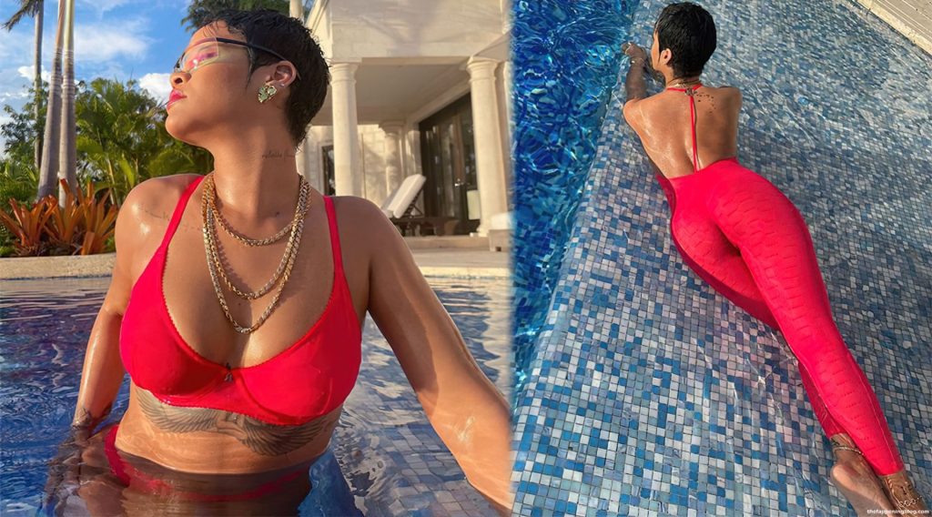 Rihanna aparece posando con un sujetador y ropa interior rojos en la piscina (agosto de 2021). Ella deslumbra con un body rojo intenso de Savage X Fenty mientras se refresca con un chapuzón en la piscina.