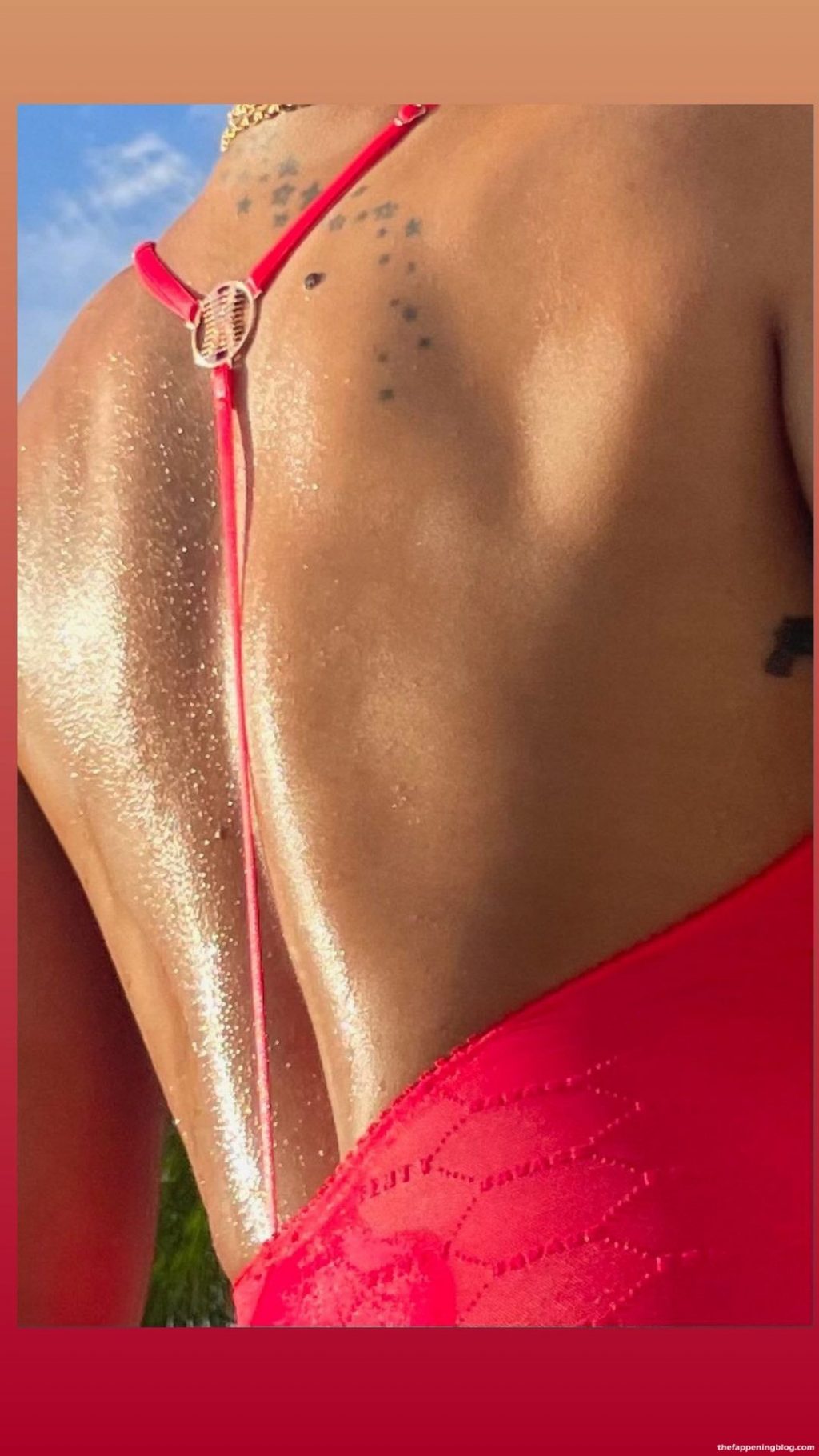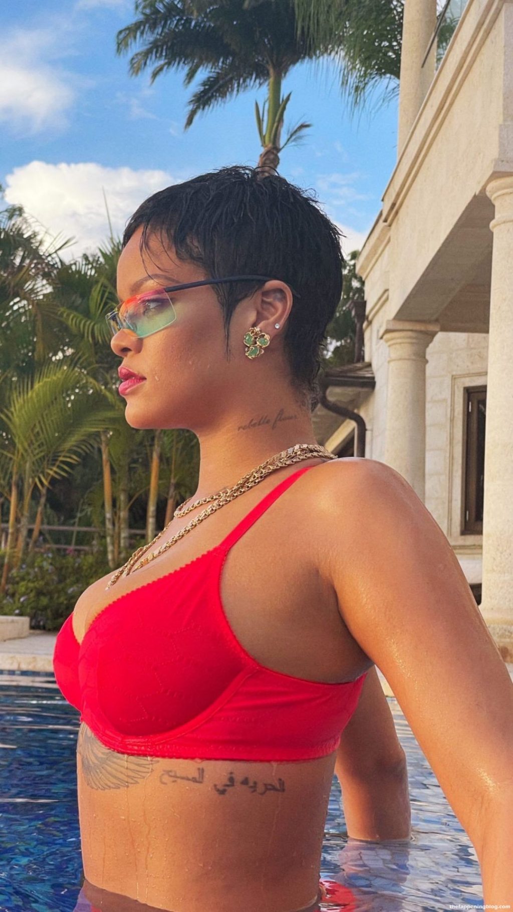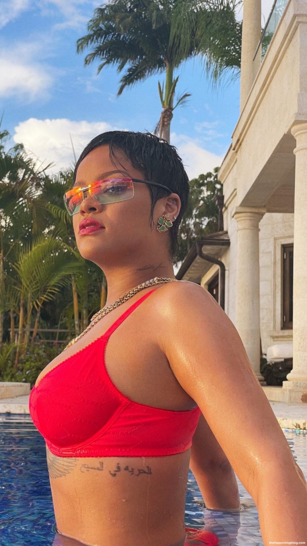 Rihanna aparece posando con un sujetador y ropa interior rojos en la piscina (agosto de 2021). Ella deslumbra con un body rojo intenso de Savage X Fenty mientras se refresca con un chapuzón en la piscina.