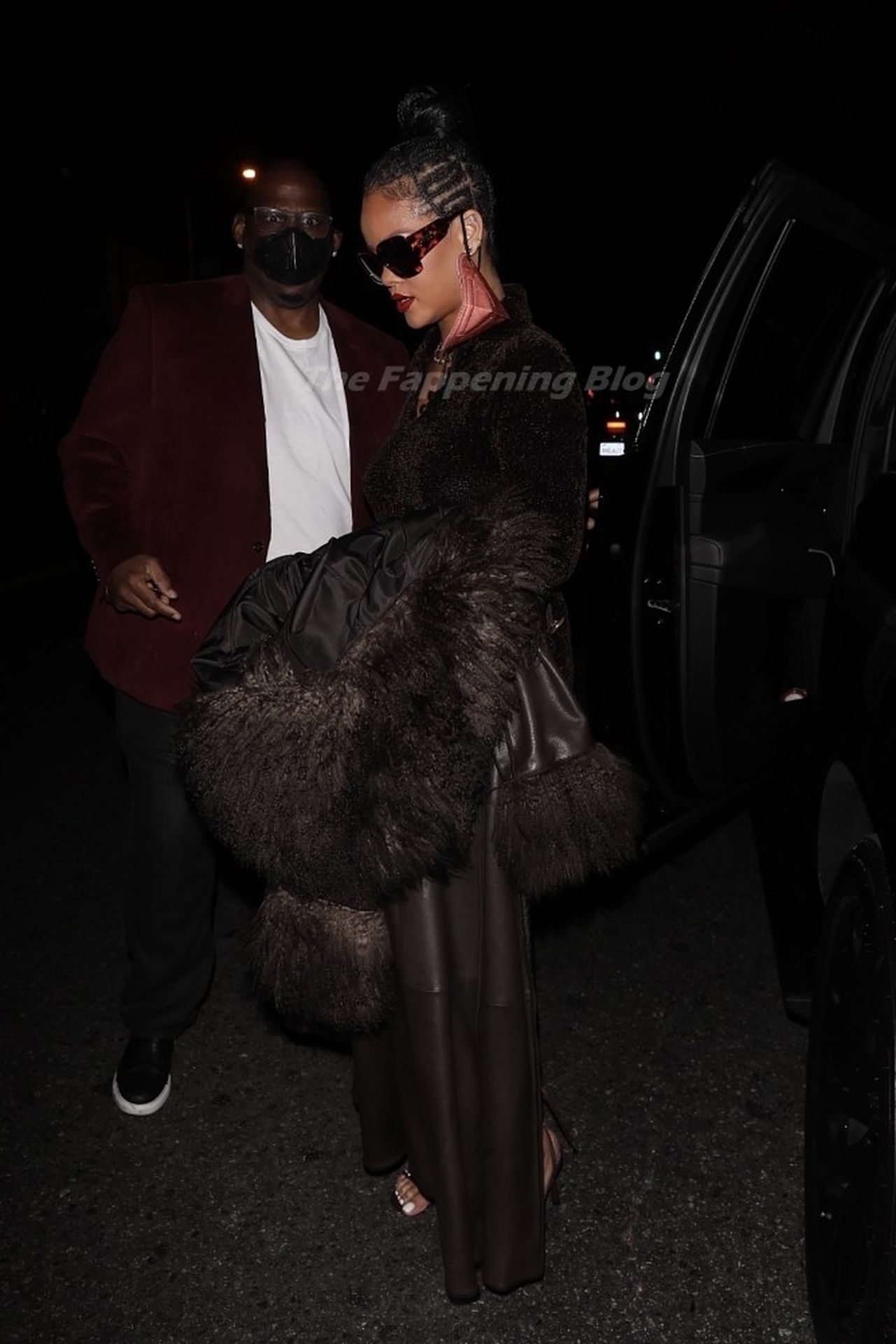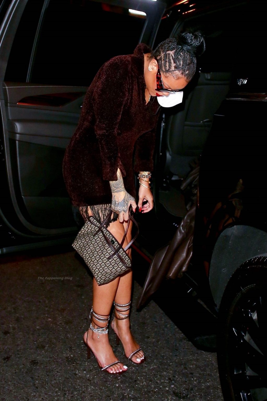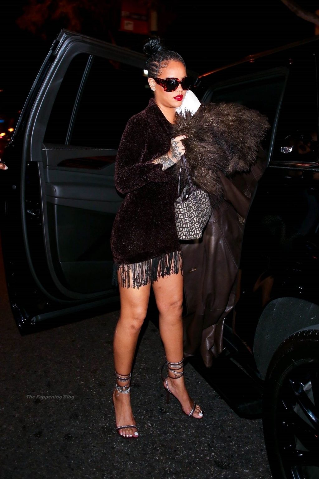 La estrella de The Fappening Rihanna destaca sus curvas bien formadas con un minivestido mientras sale de una fiesta privada con A$AP Rocky.