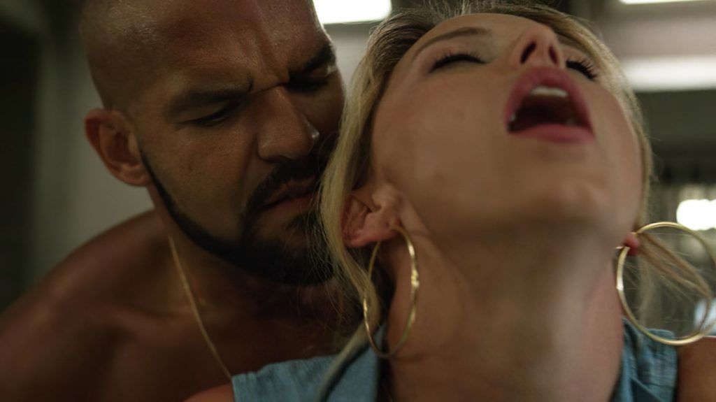 Riley Voelkel is lying on her back on a prison table as a man has hard sex with her. Her legs are up with her feet over his shoulder. The man then turns her around and has sex with her from behind, holding her by her ponytail. Riley’s dress is hiked up to her waist and unbuttoned in front to reveal her bra.