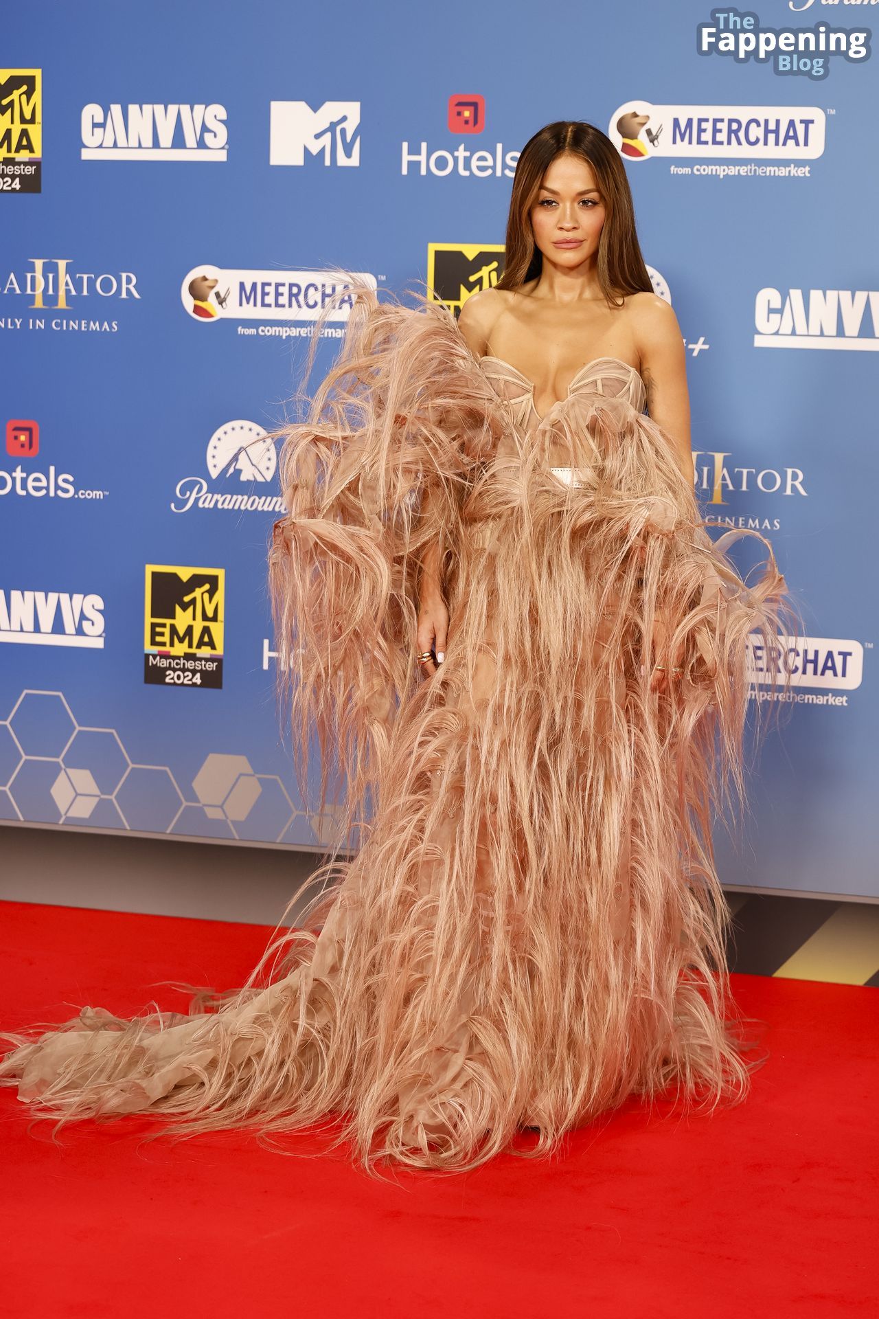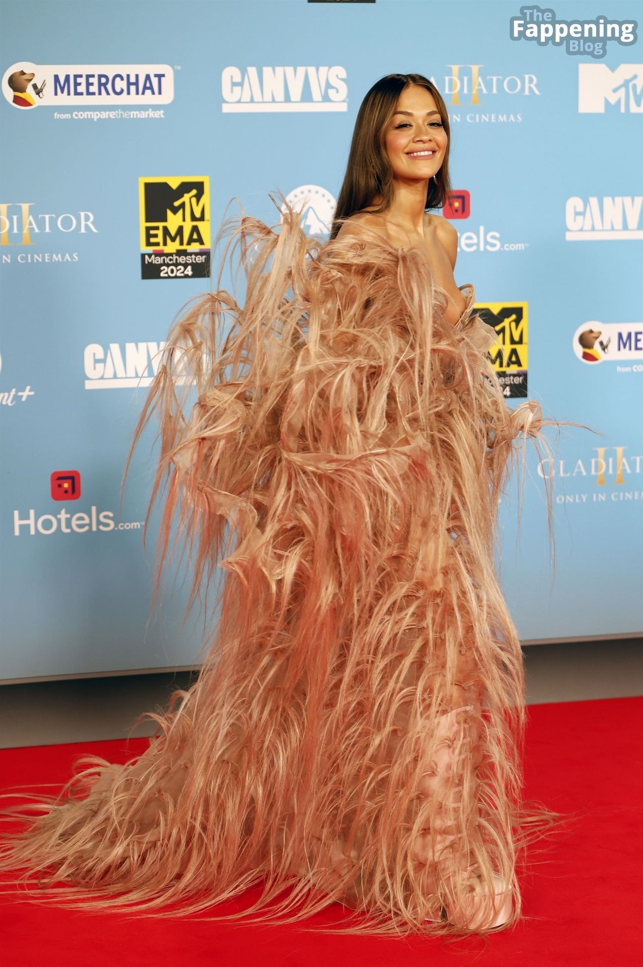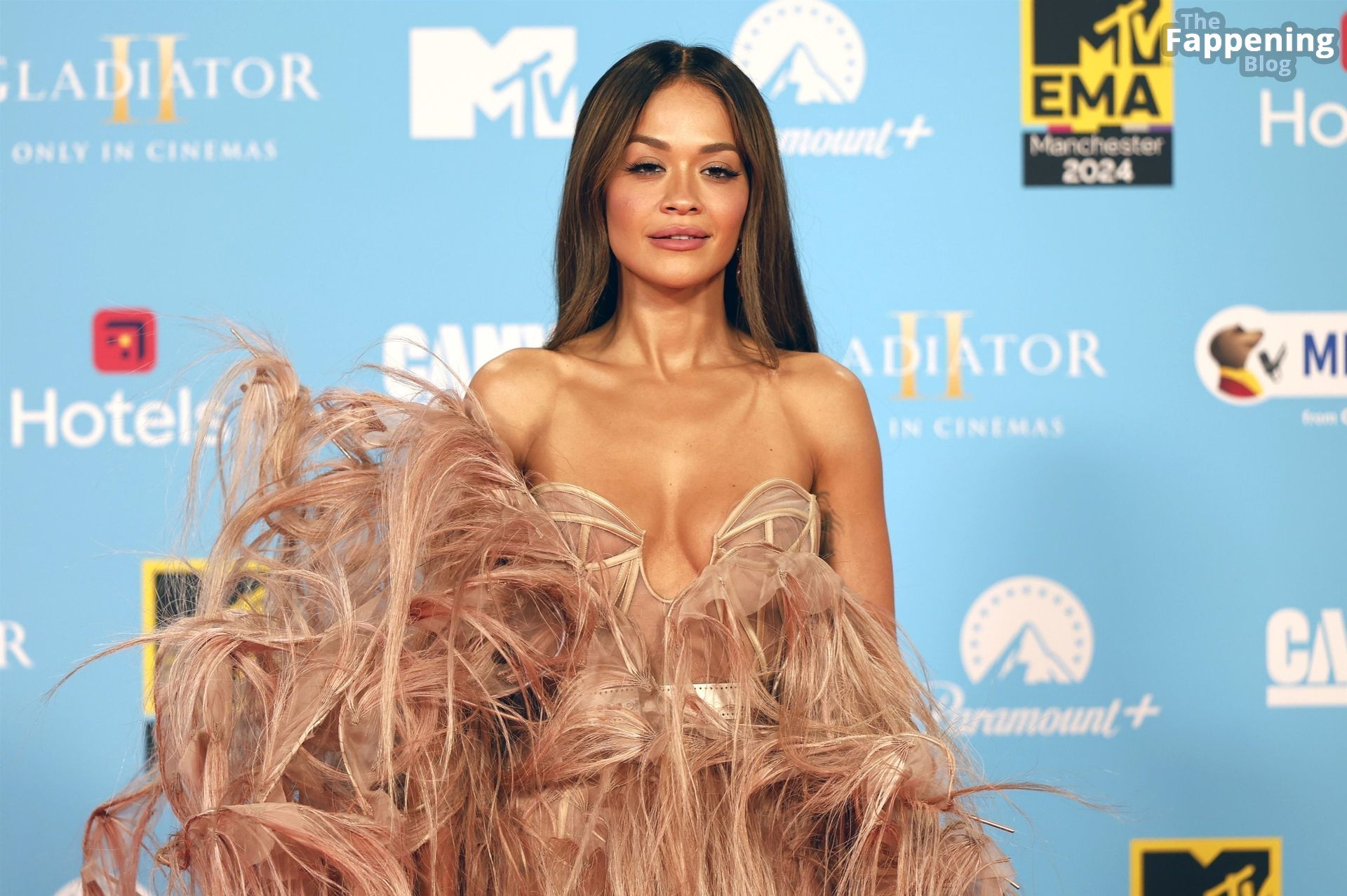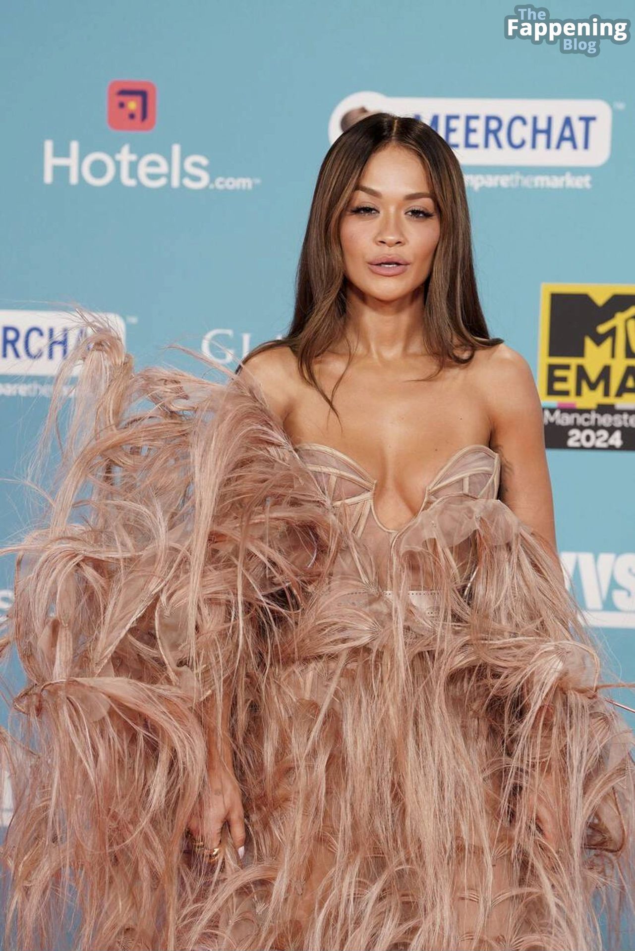 Rita Ora deslumbra con su profundo escote y vestido de plumas en los MTV EMAs 2024 en el Co-op Live Arena de Manchester, aportando una mezcla de glamour y sensualidad con un atrevido look en la alfombra roja.