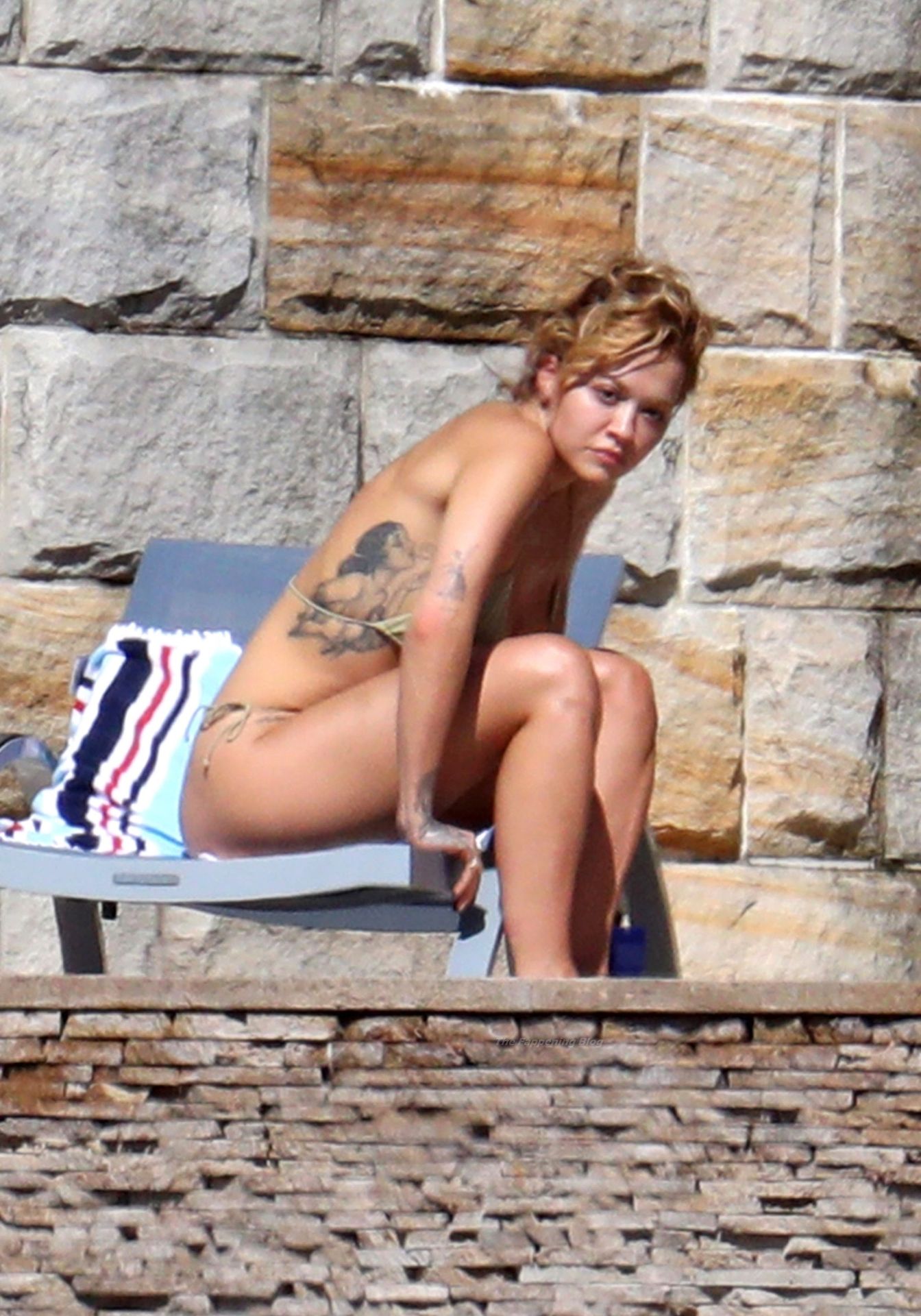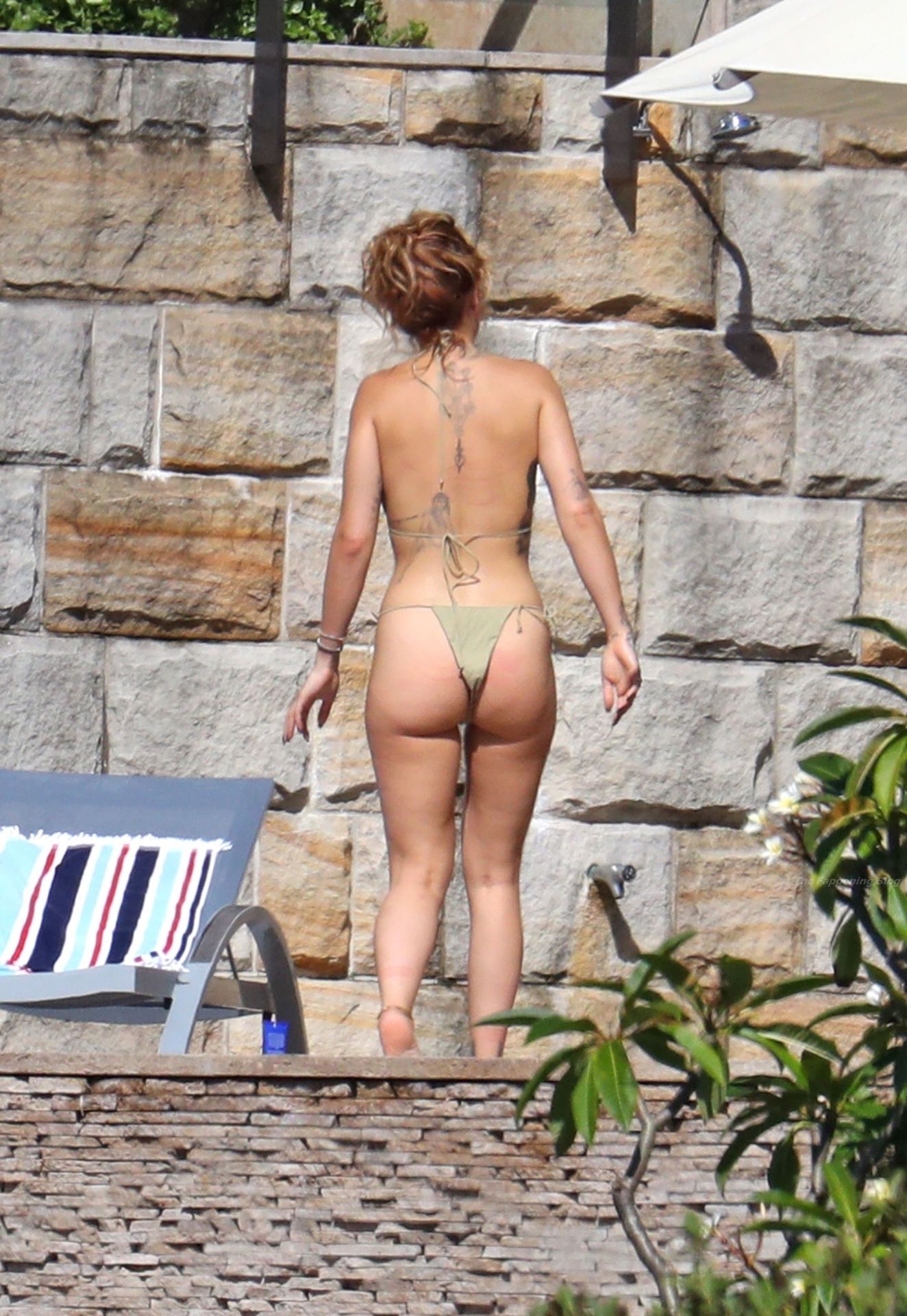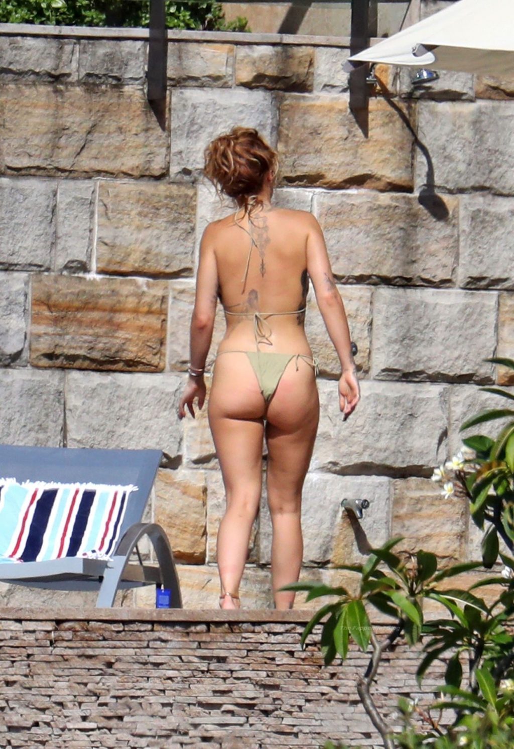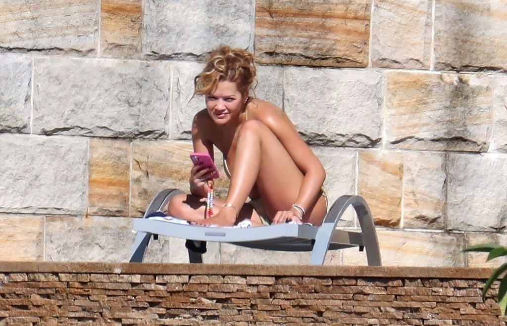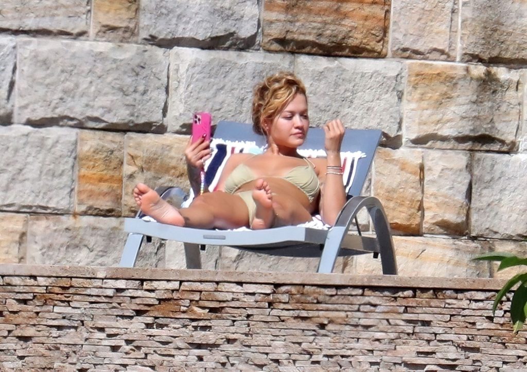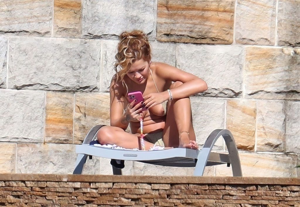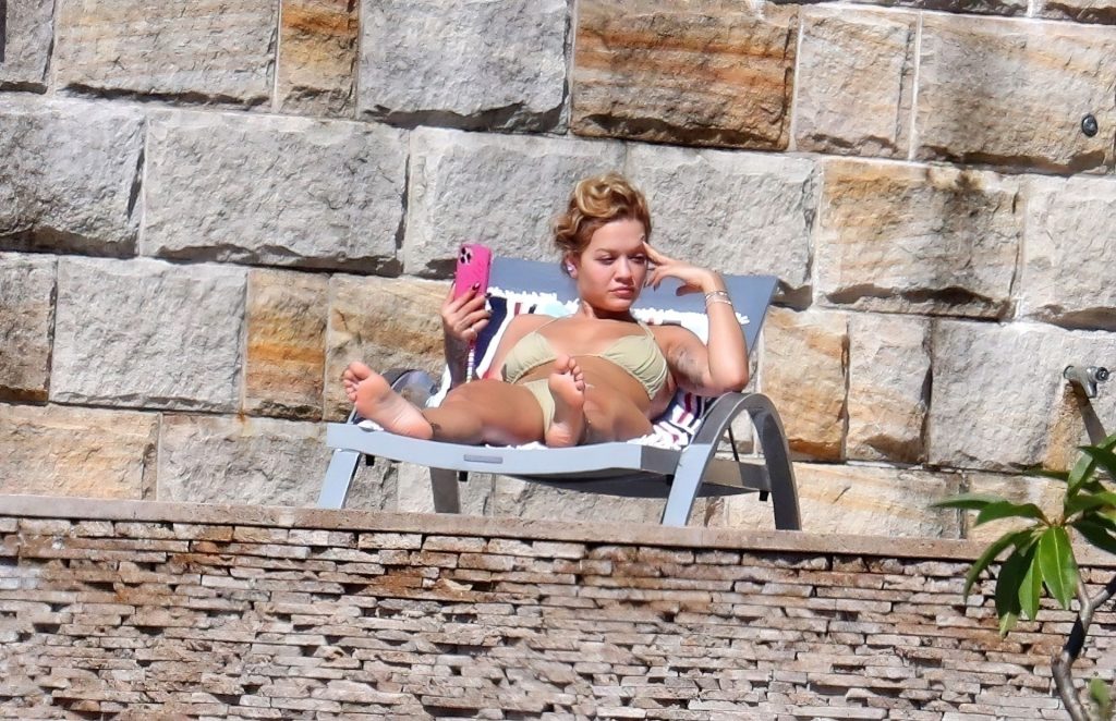 La cantante Rita Ora se ve ‘Caliente Ahora Mismo’ mientras se relaja junto a la piscina con un bikini verde y mostrando sus pechos desnudos para nosotros – Sídney, 31/03/2021.