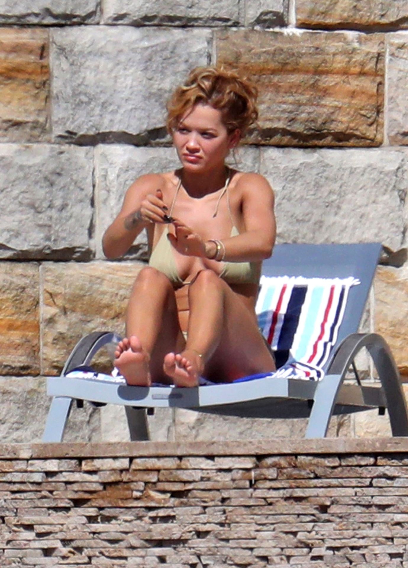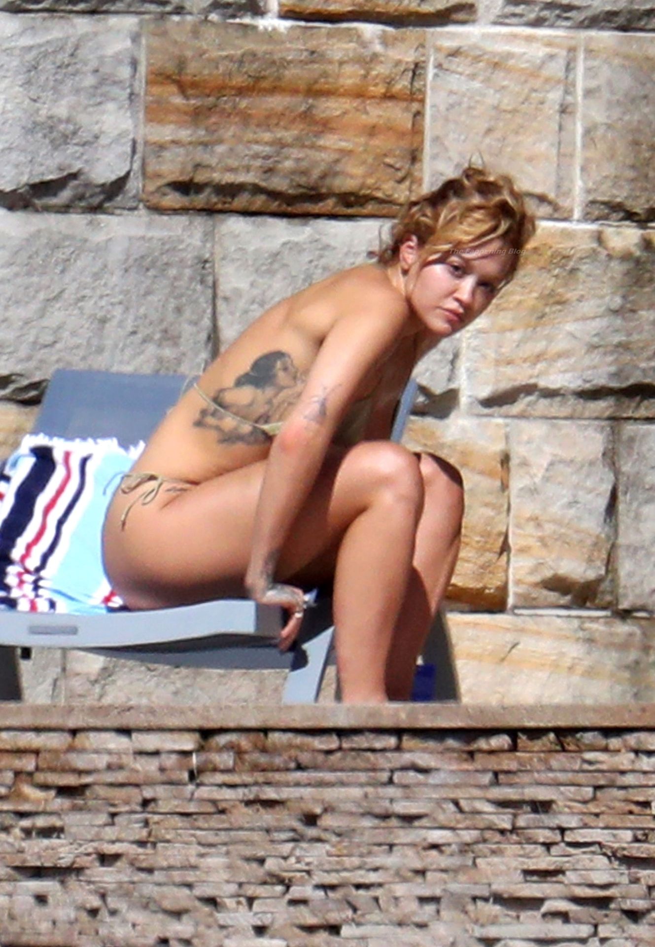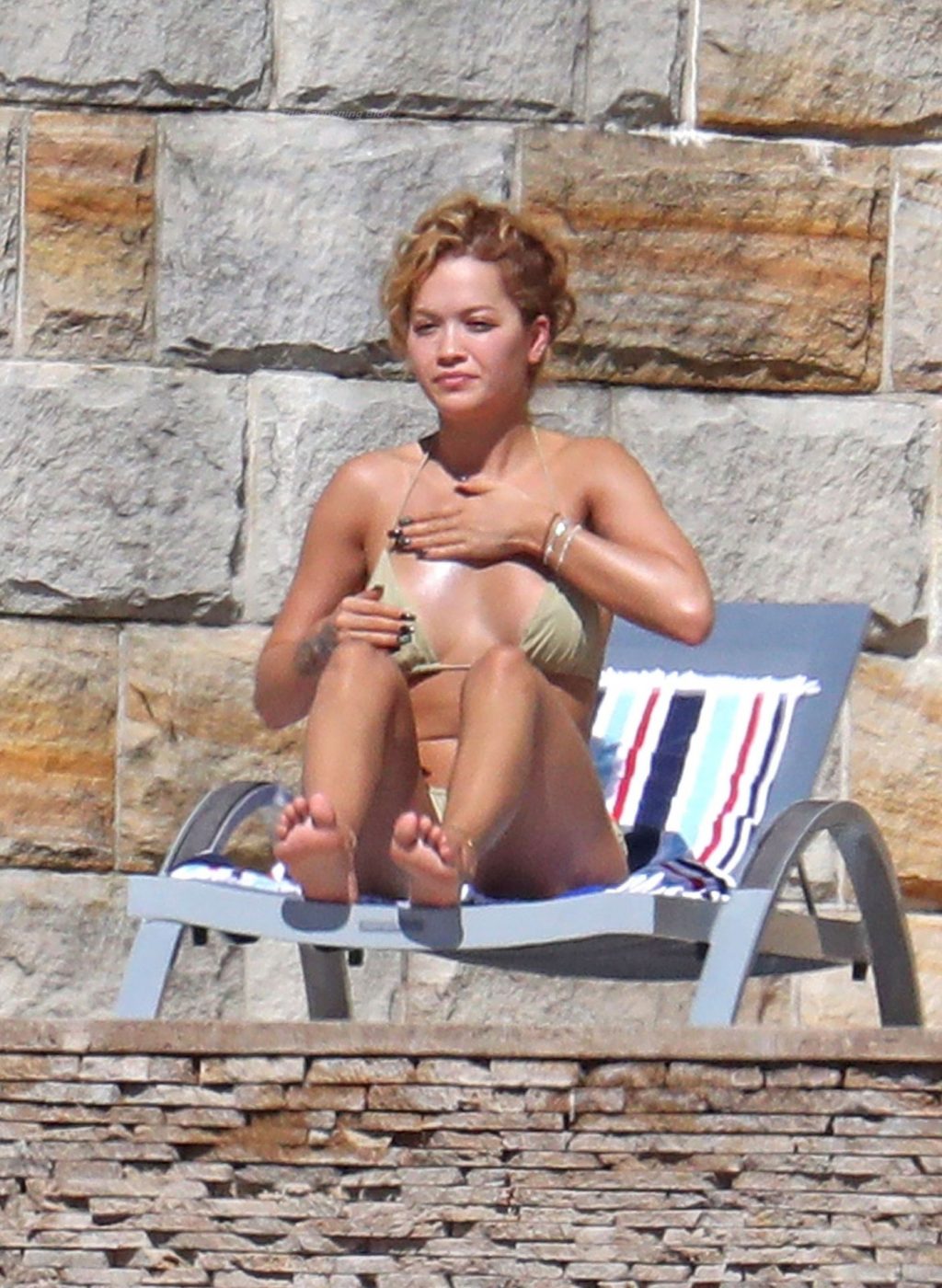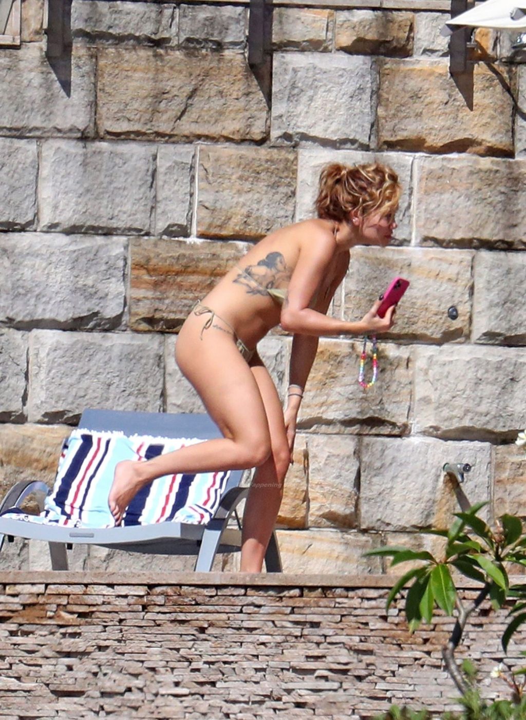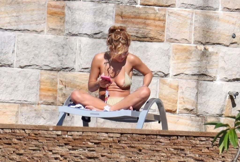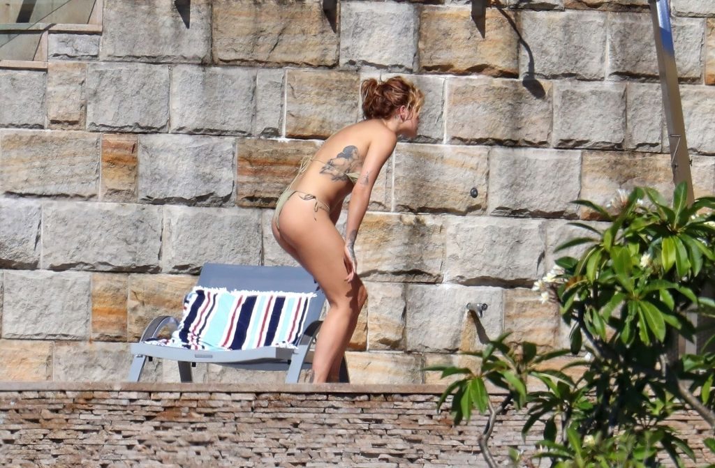 La cantante Rita Ora se ve ‘Caliente Ahora Mismo’ mientras se relaja junto a la piscina con un bikini verde y mostrando sus pechos desnudos para nosotros – Sídney, 31/03/2021.