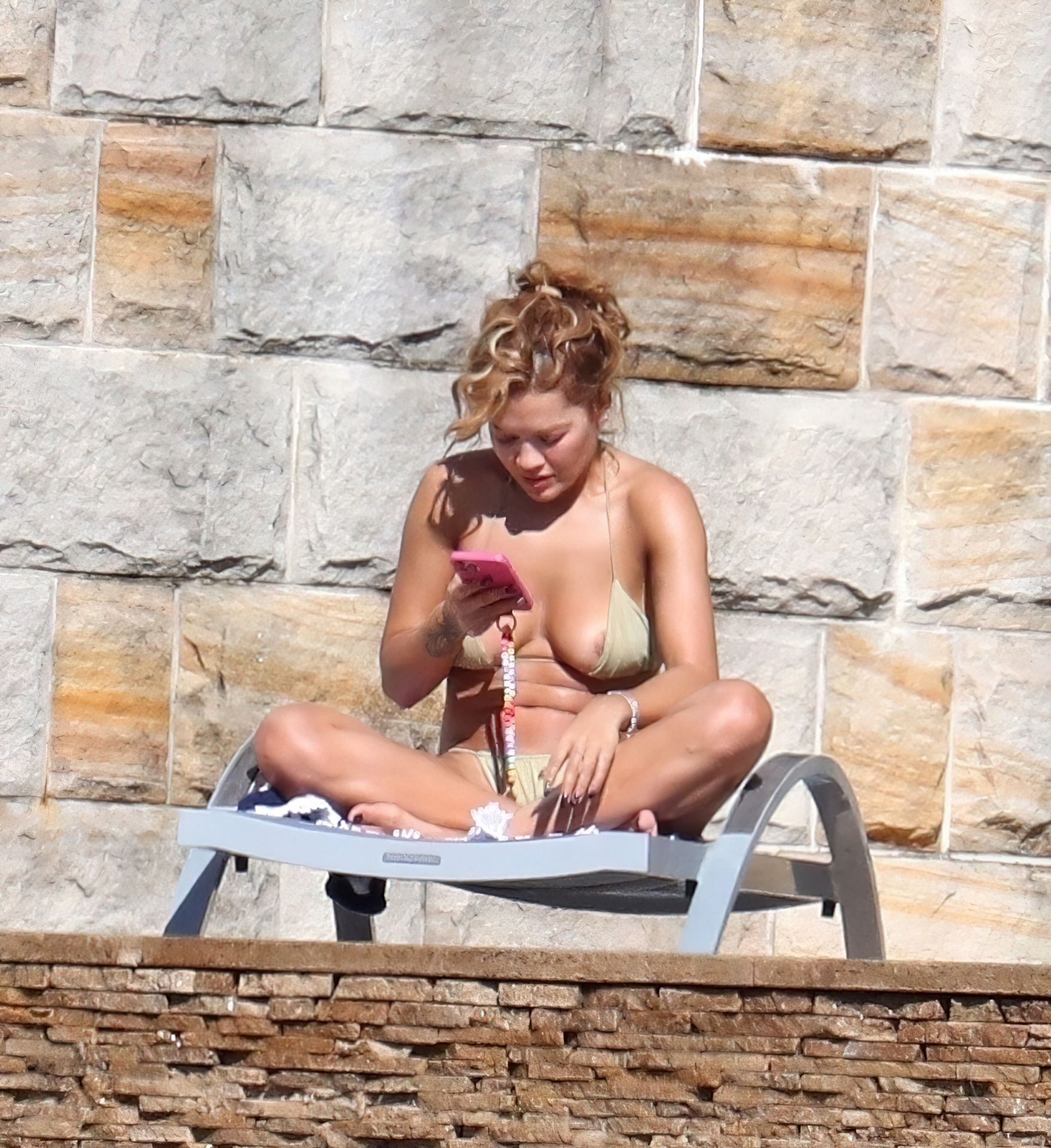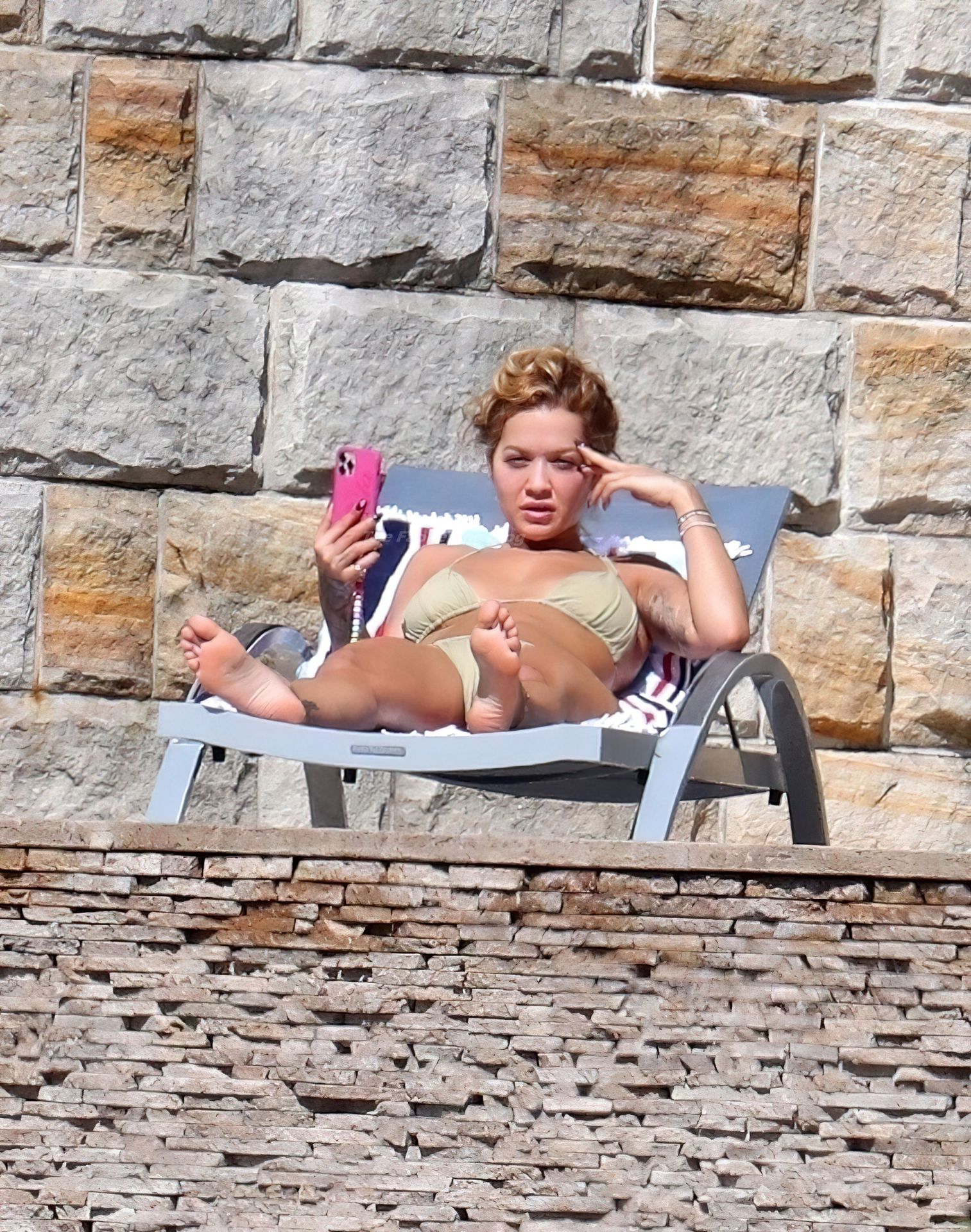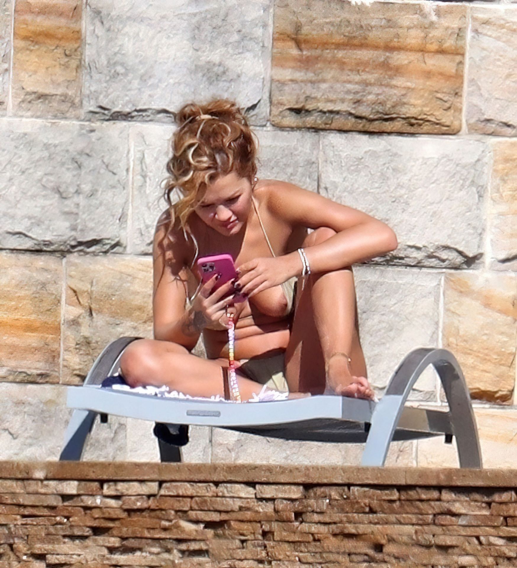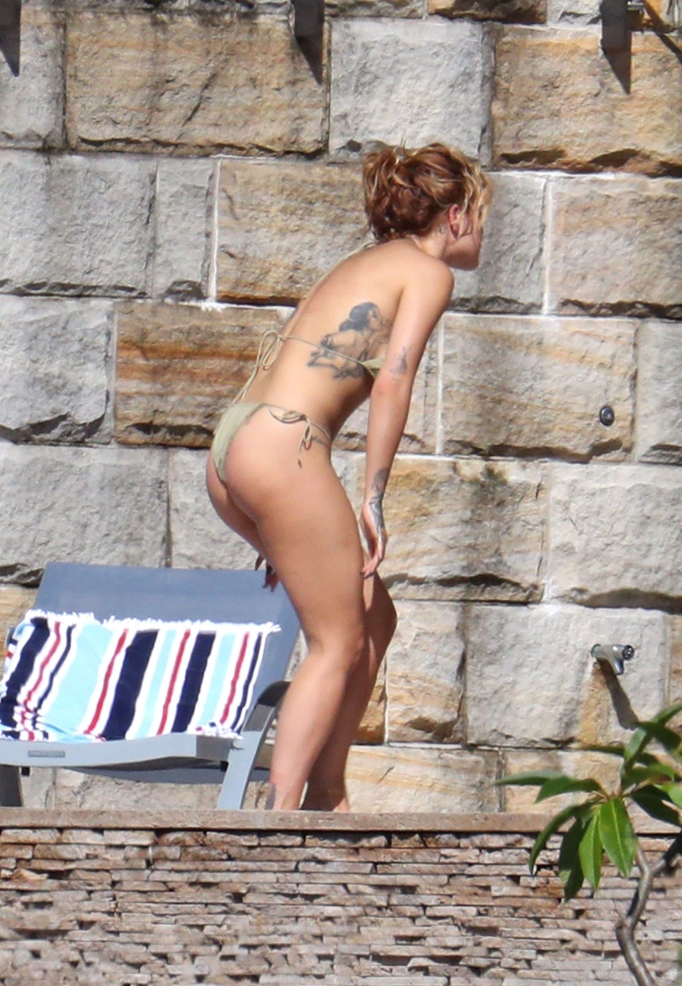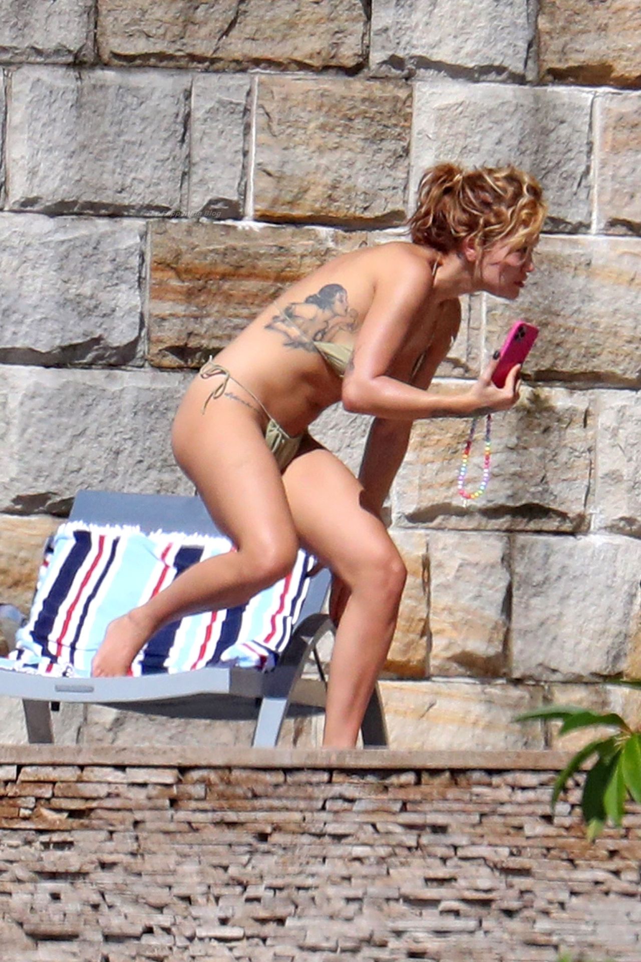 La cantante Rita Ora se ve ‘Caliente Ahora Mismo’ mientras se relaja junto a la piscina con un bikini verde y mostrando sus pechos desnudos para nosotros – Sídney, 31/03/2021.