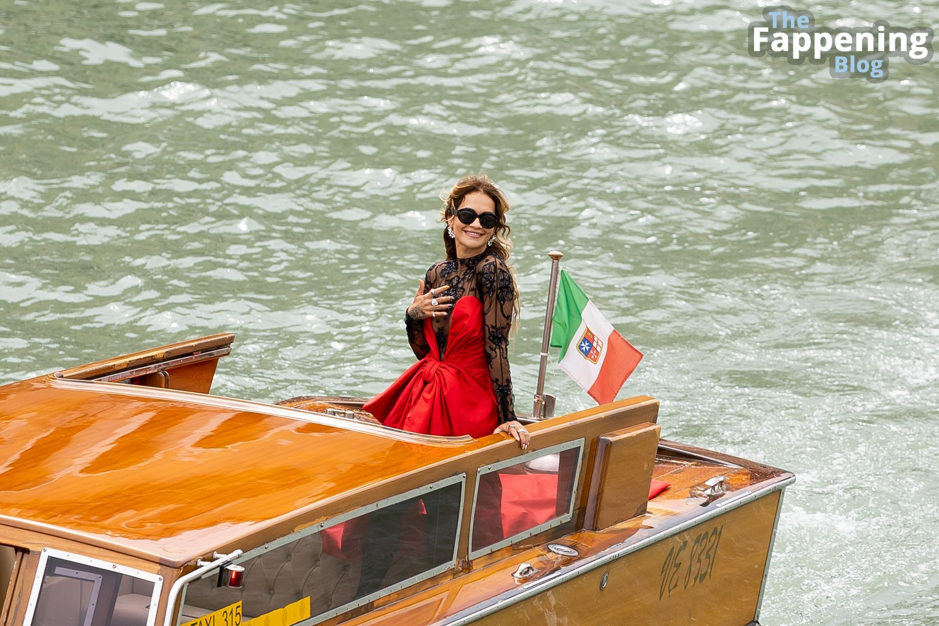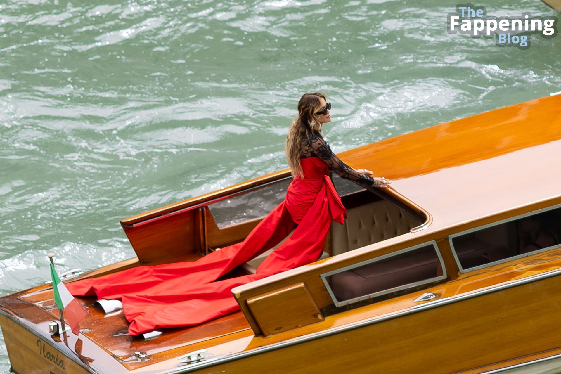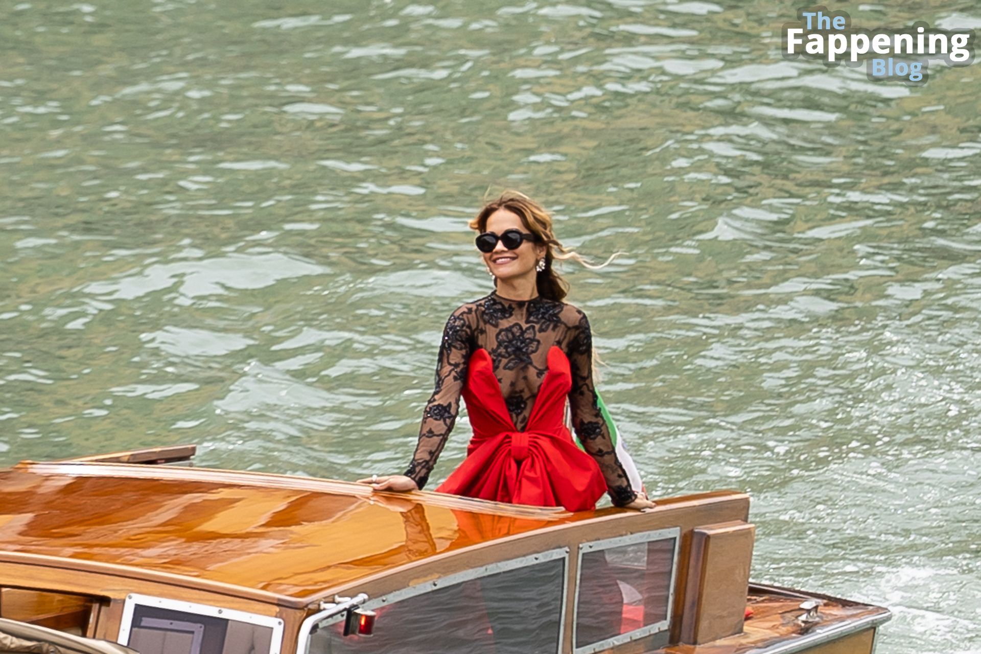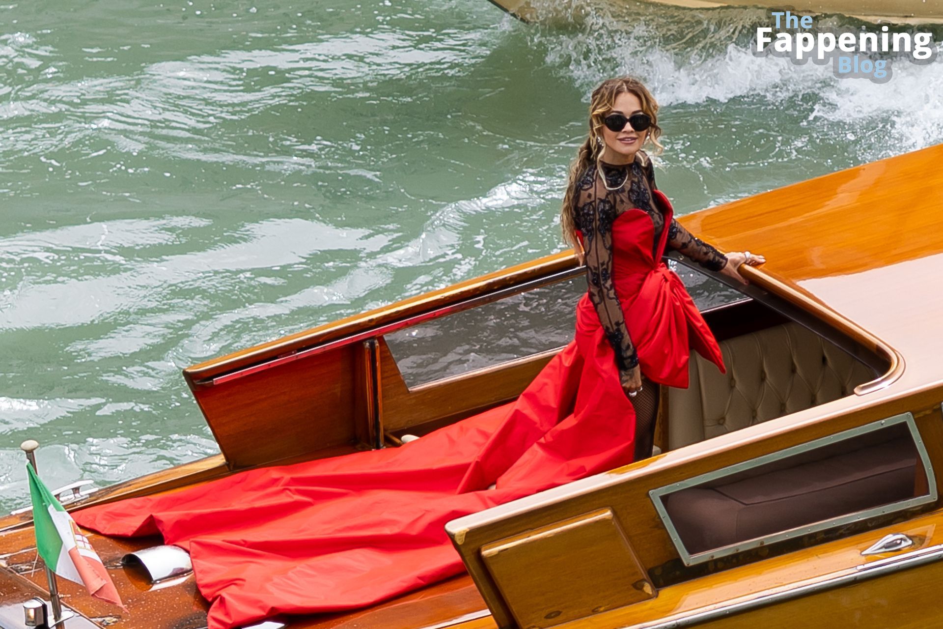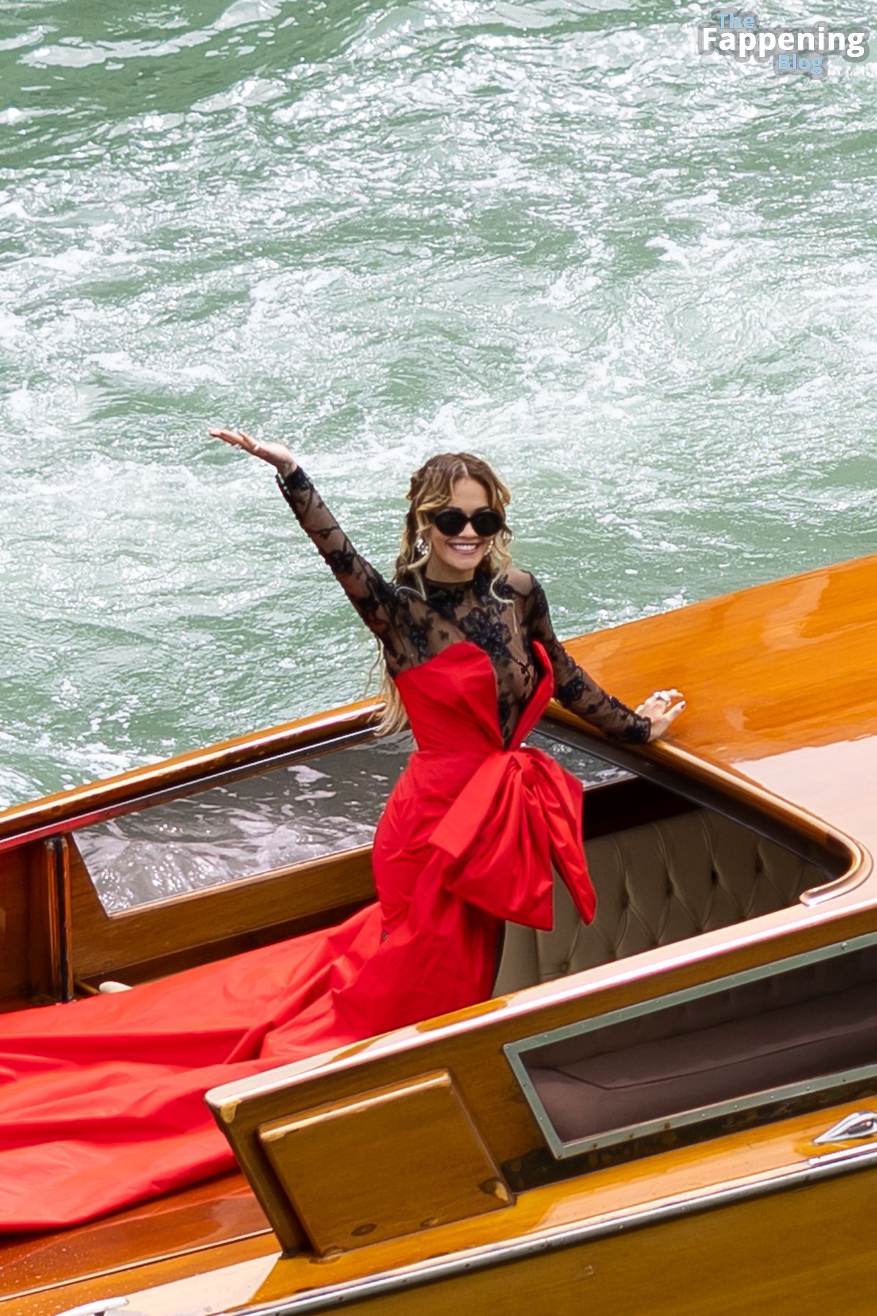 Rita Ora Presume Sus Pechos y un Largo Vestido Rojo de Moschino Caminando hacia un Barco en Venecia (42 Fotos)