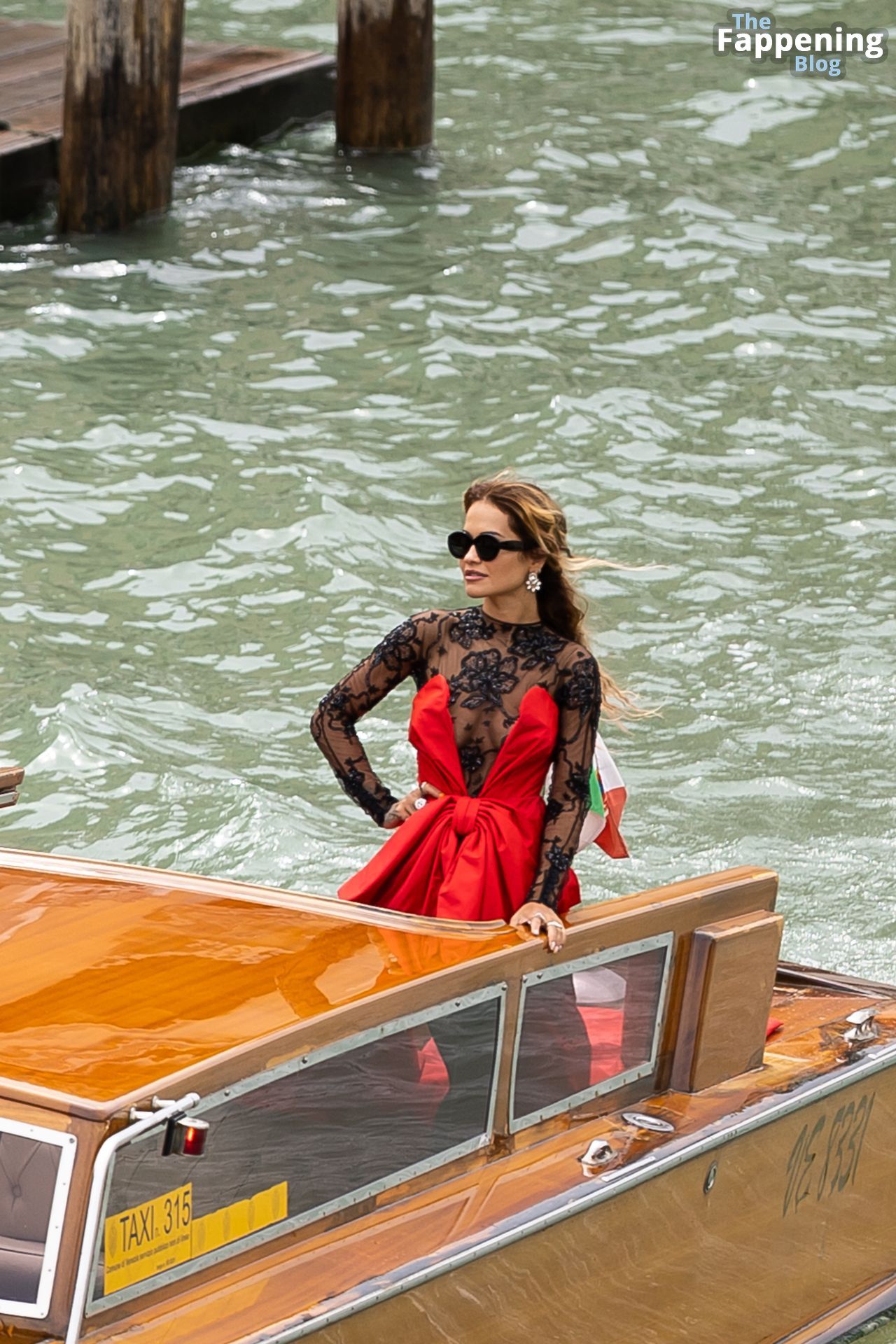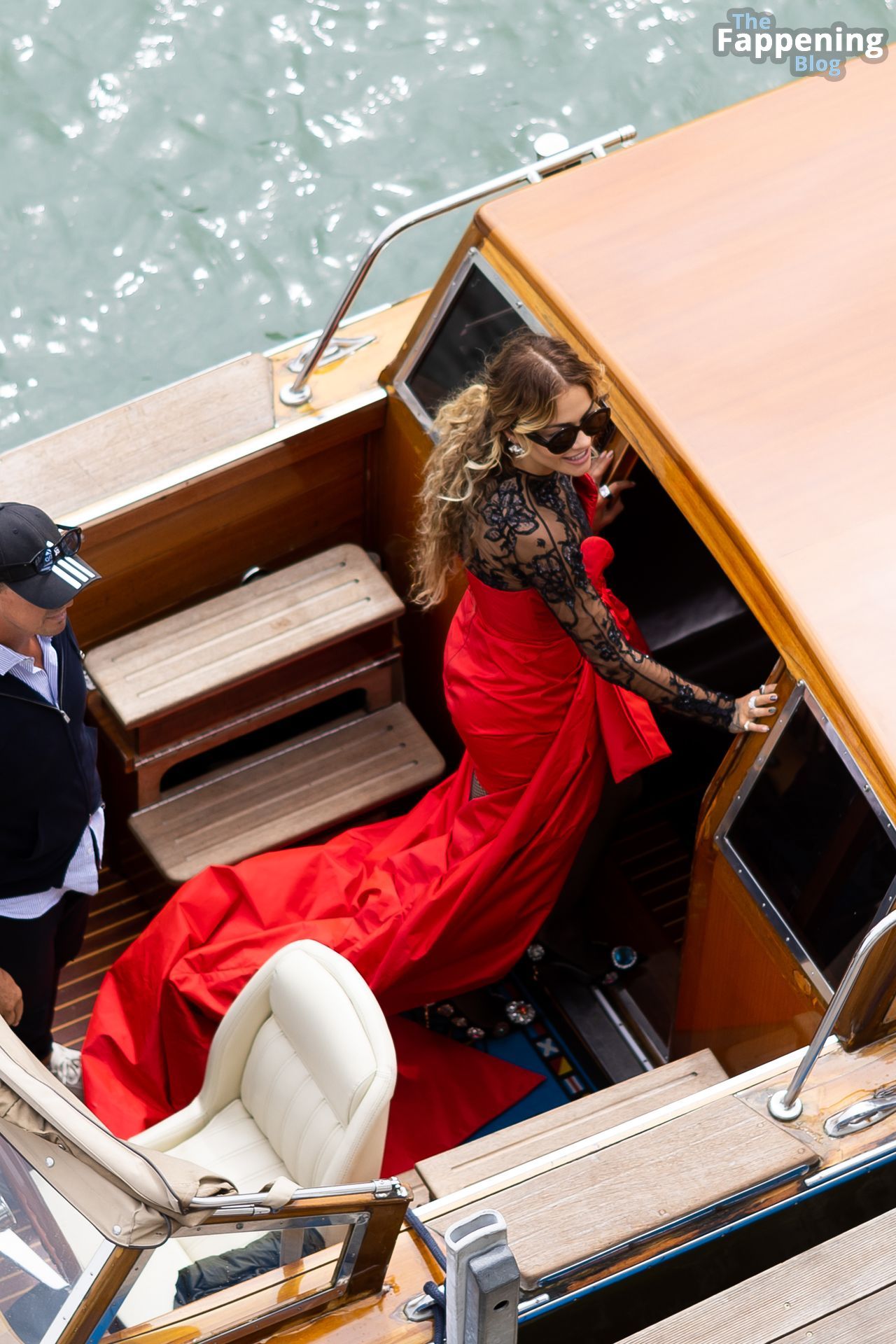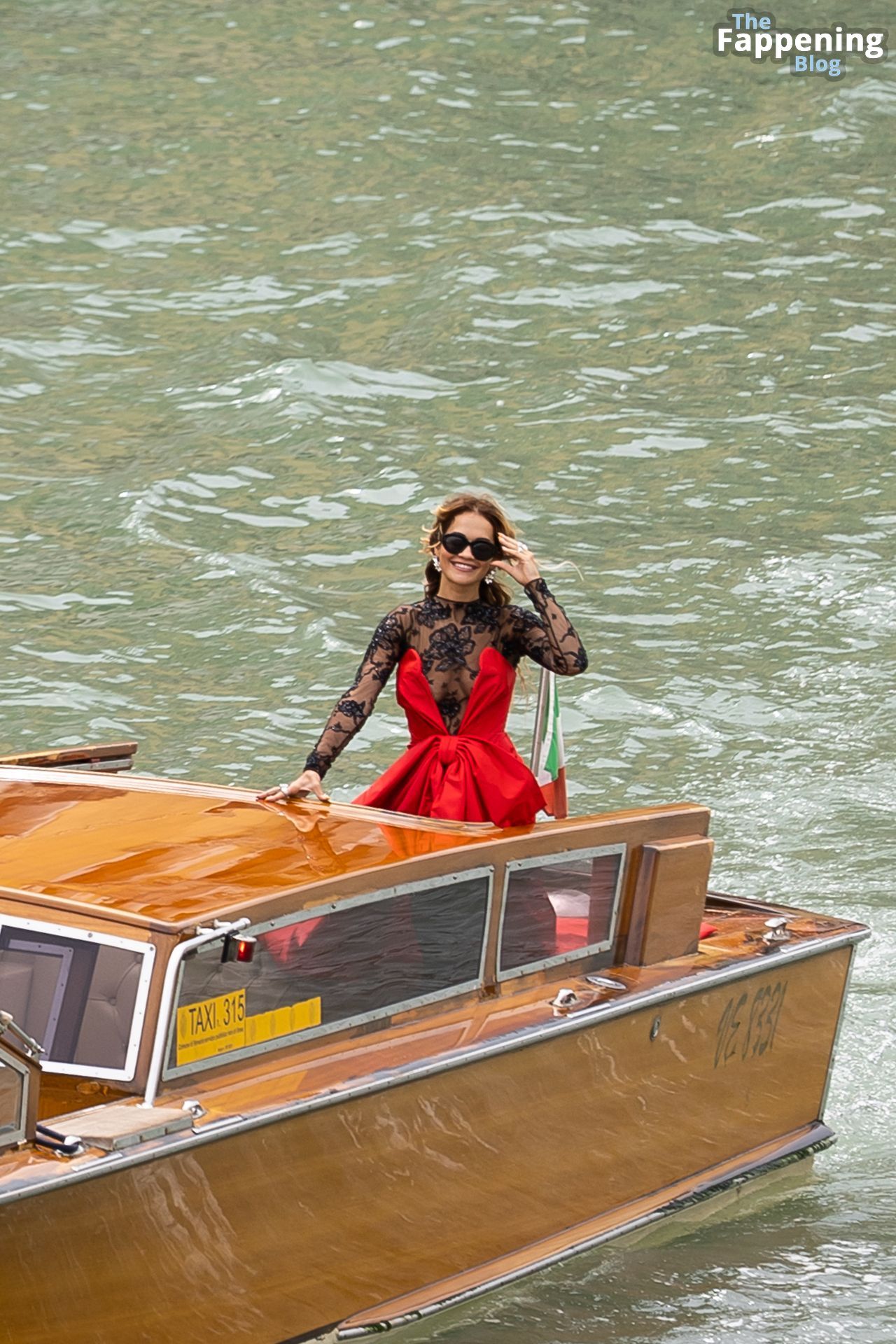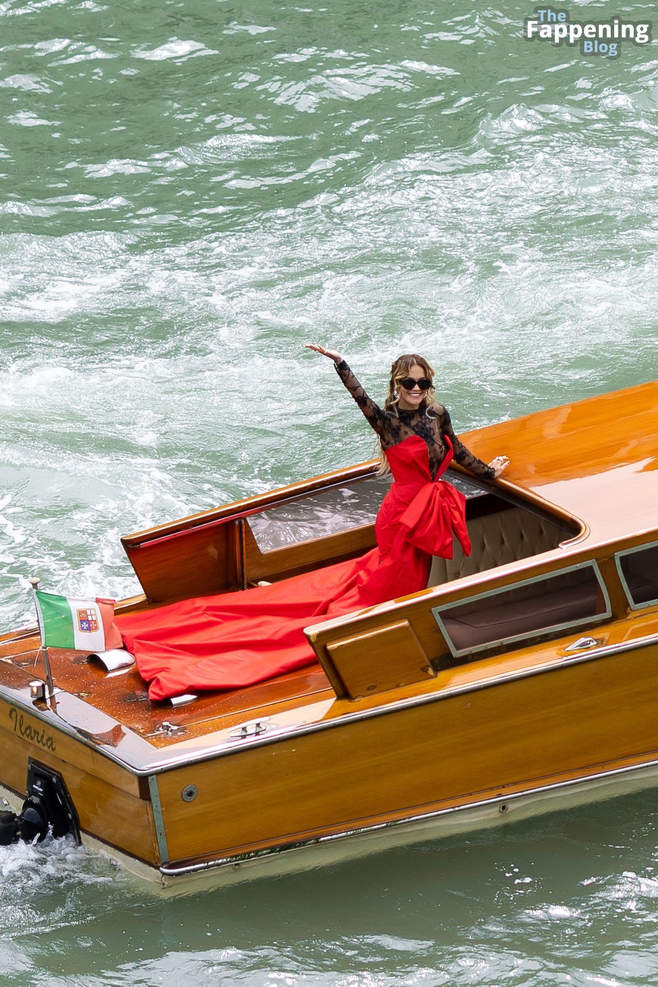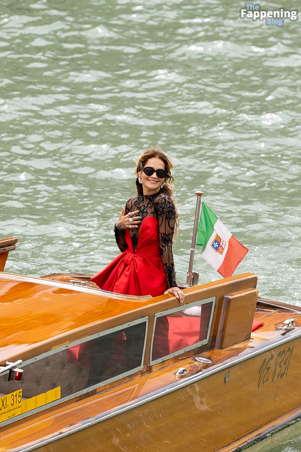 Rita Ora Presume Sus Pechos y un Largo Vestido Rojo de Moschino Caminando hacia un Barco en Venecia (42 Fotos)