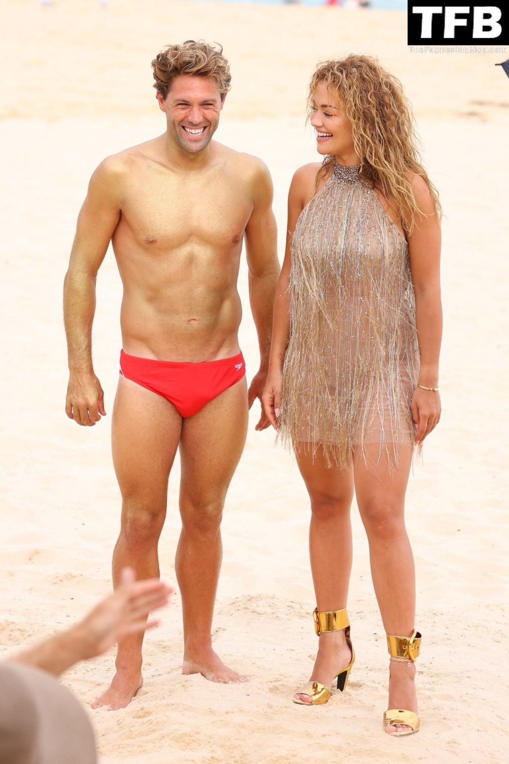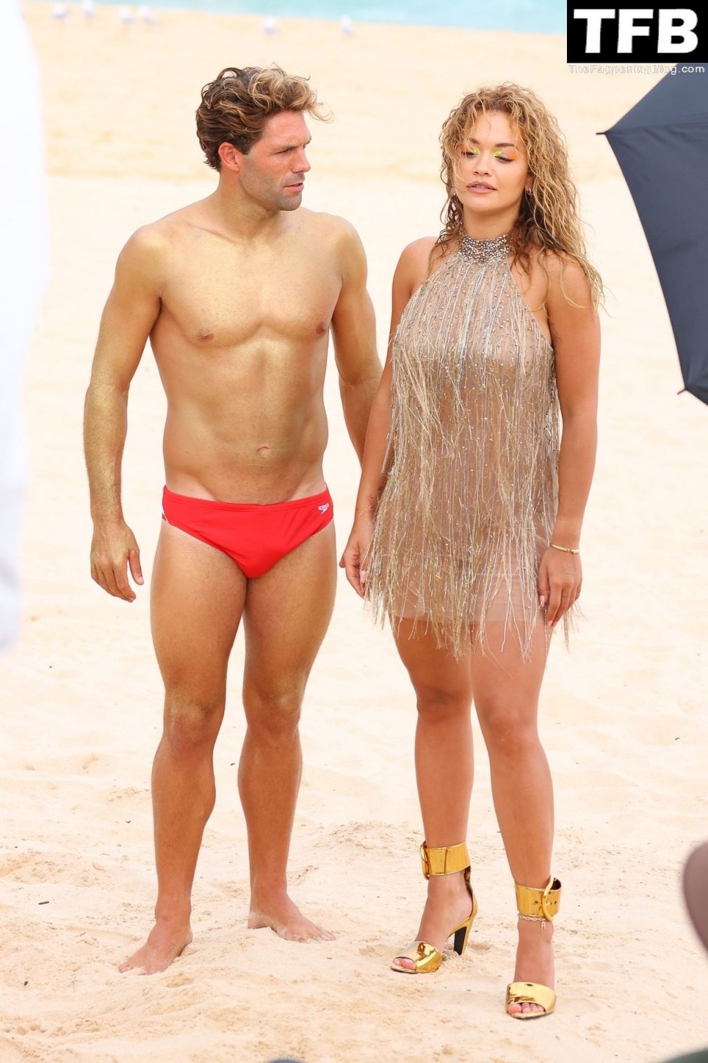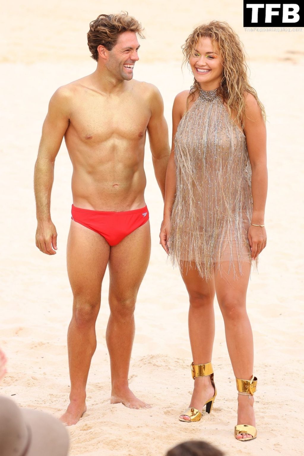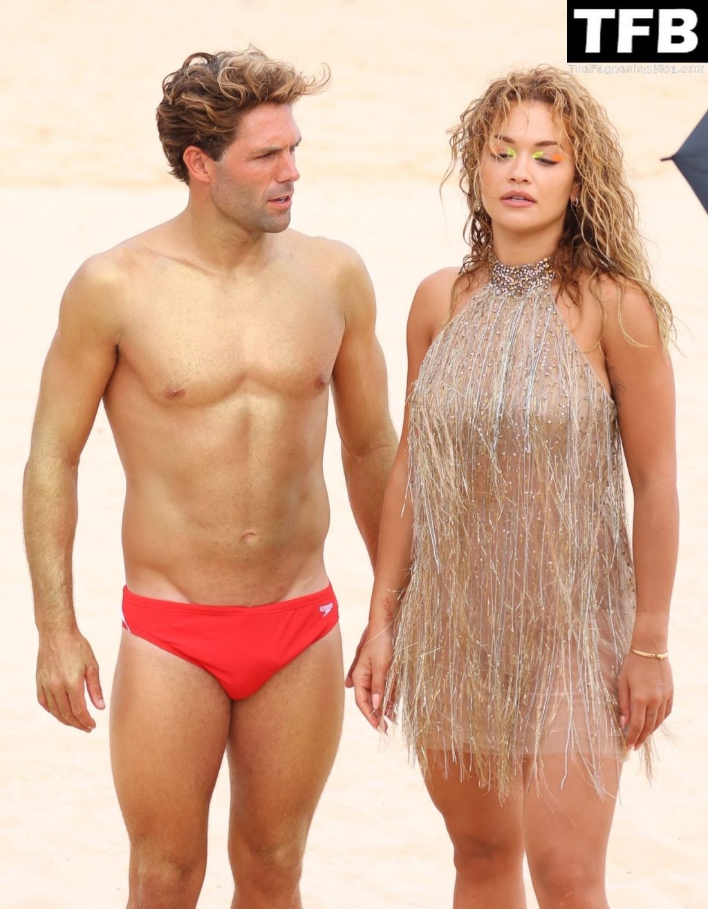 La cantante Rita Ora, de 31 años, parecía estar teniendo su propio momento Baywatch mientras participaba en la sesión de fotos en la playa Maroubra de Sídney. Rita deslumbró con un vestido dorado con flecos mientras posaba con hombres en speedos. El vestido presentaba un escote con pedrería, con la longitud corta que mostraba las tonificadas piernas de la cantante.