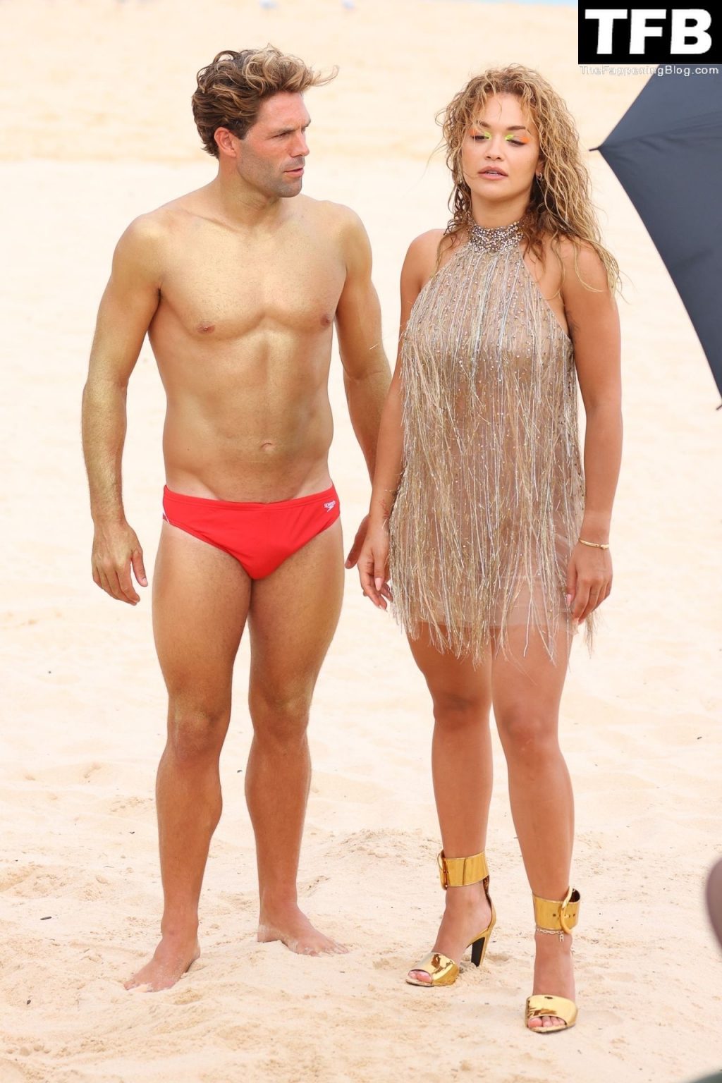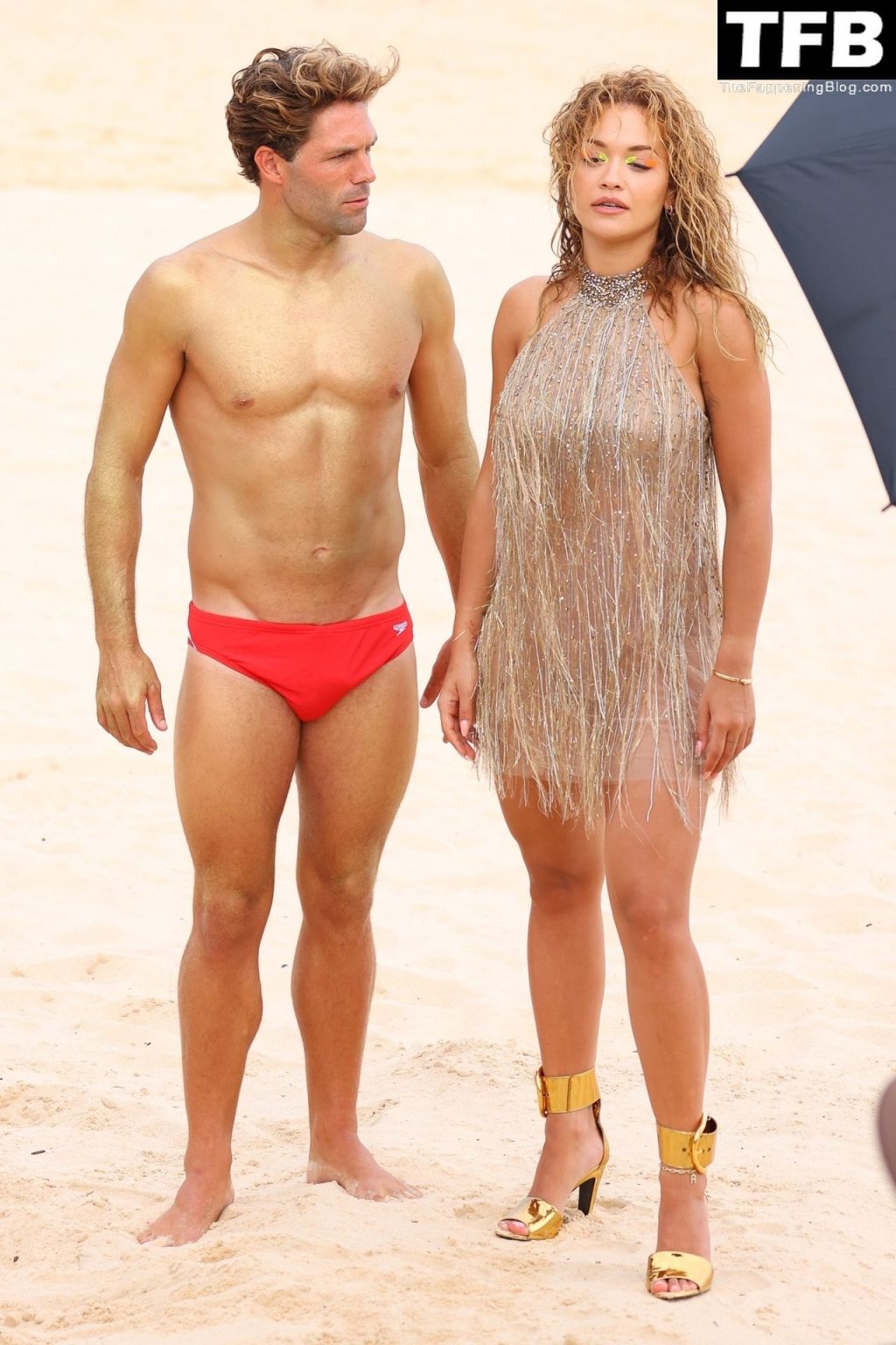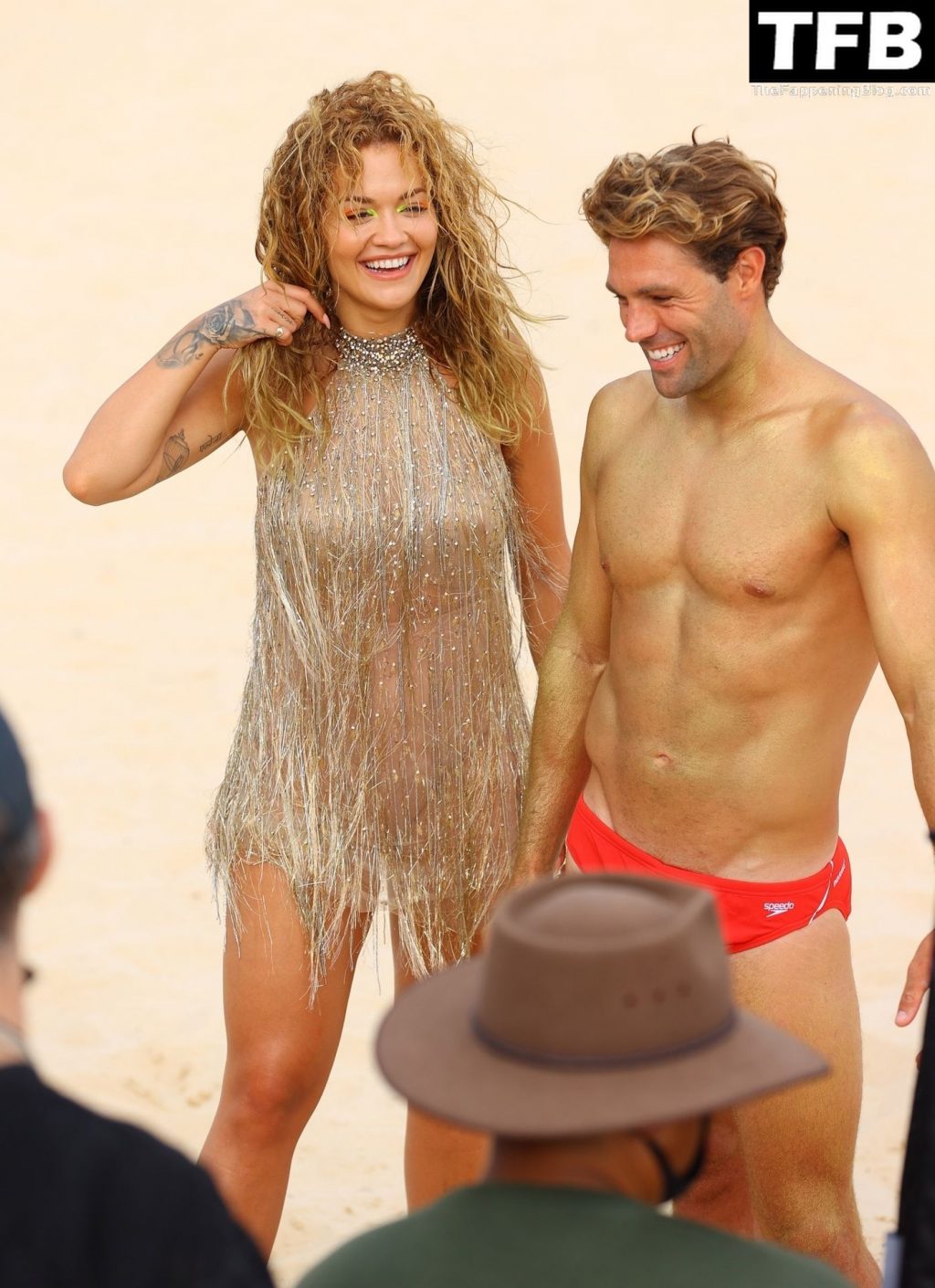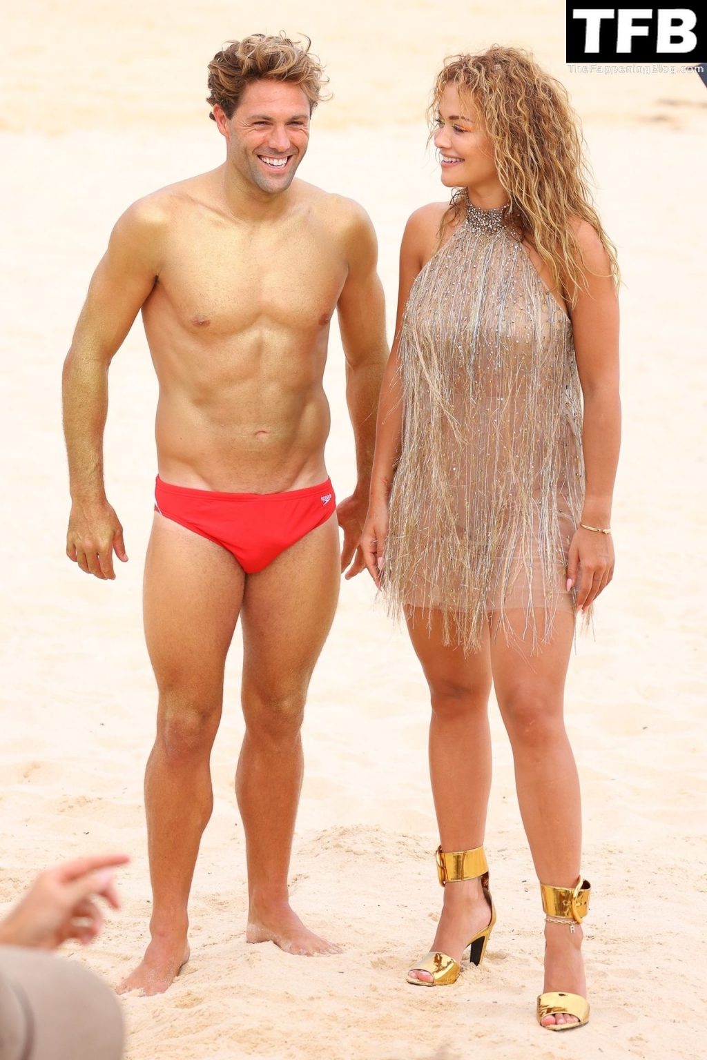 La cantante Rita Ora, de 31 años, parecía estar teniendo su propio momento Baywatch mientras participaba en la sesión de fotos en la playa Maroubra de Sídney. Rita deslumbró con un vestido dorado con flecos mientras posaba con hombres en speedos. El vestido presentaba un escote con pedrería, con la longitud corta que mostraba las tonificadas piernas de la cantante.