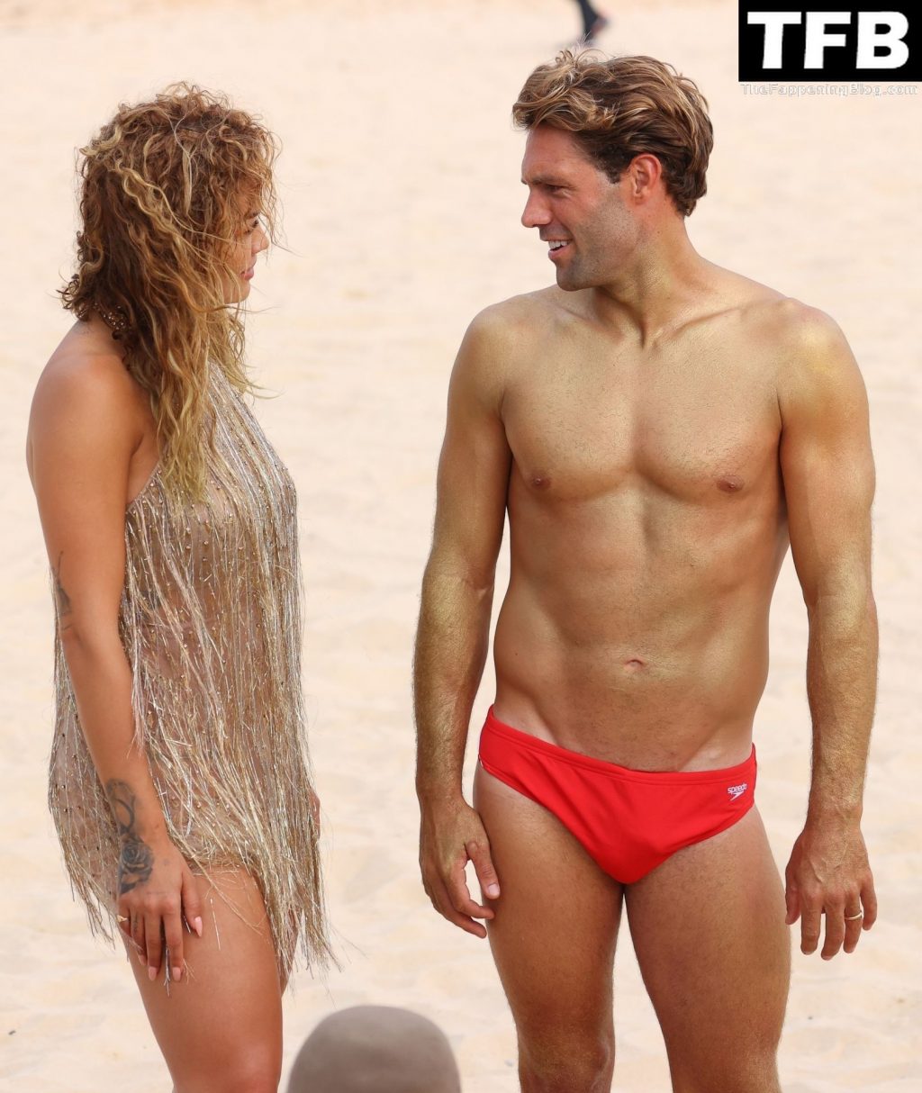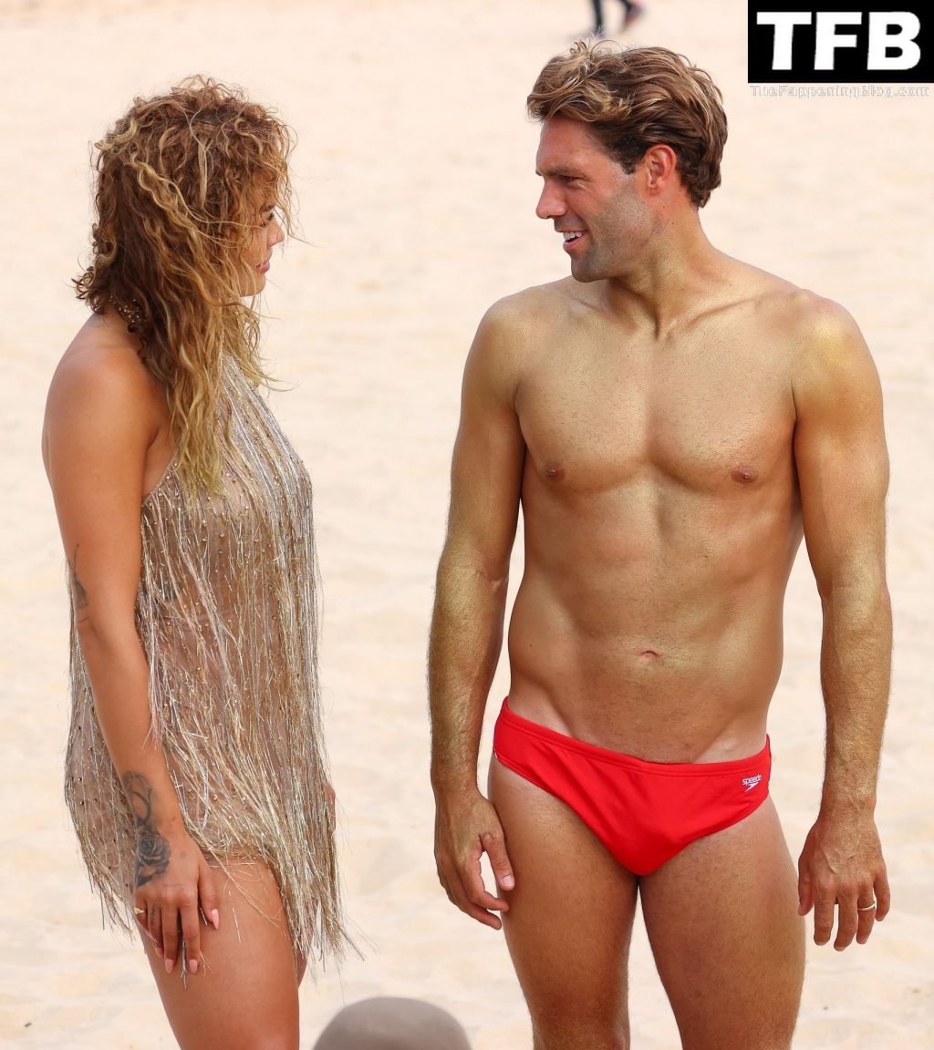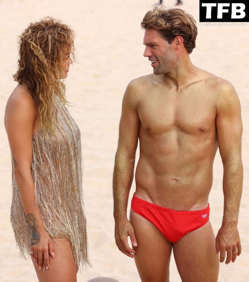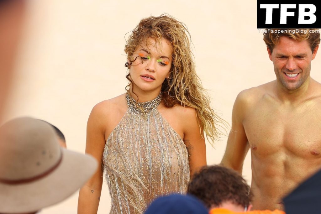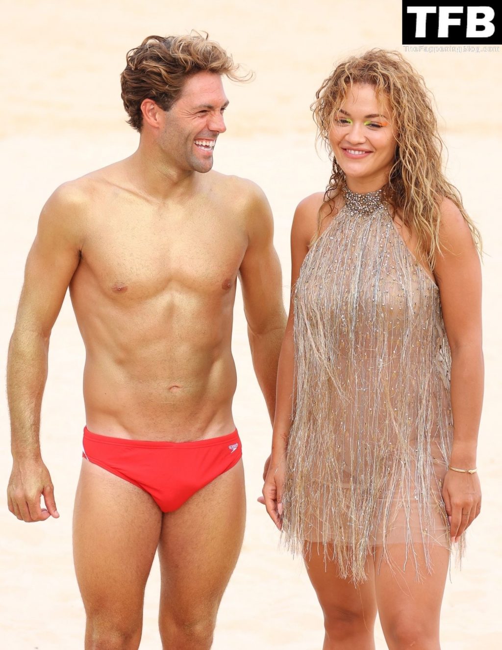 La cantante Rita Ora, de 31 años, parecía estar teniendo su propio momento Baywatch mientras participaba en la sesión de fotos en la playa Maroubra de Sídney. Rita deslumbró con un vestido dorado con flecos mientras posaba con hombres en speedos. El vestido presentaba un escote con pedrería, con la longitud corta que mostraba las tonificadas piernas de la cantante.