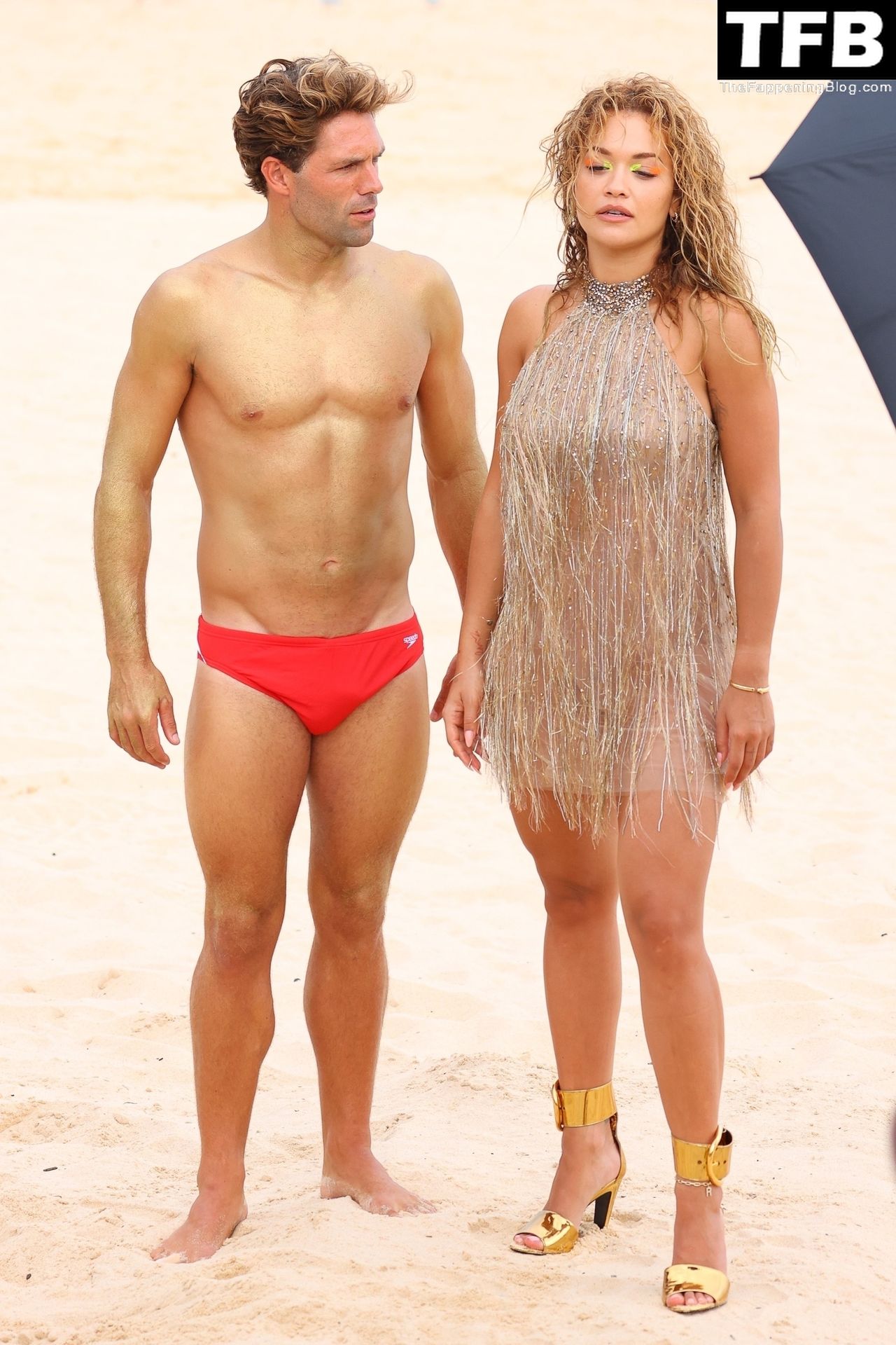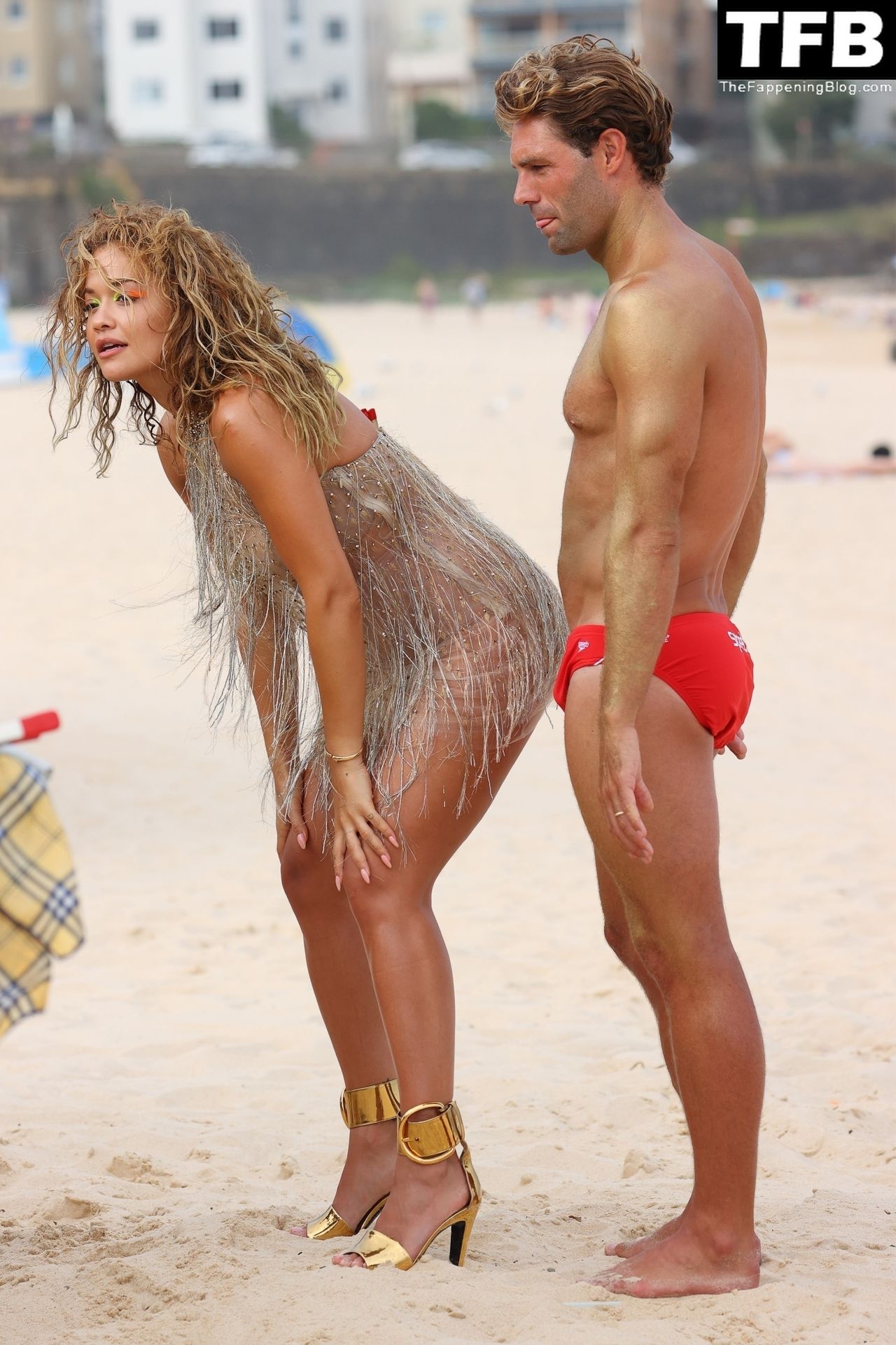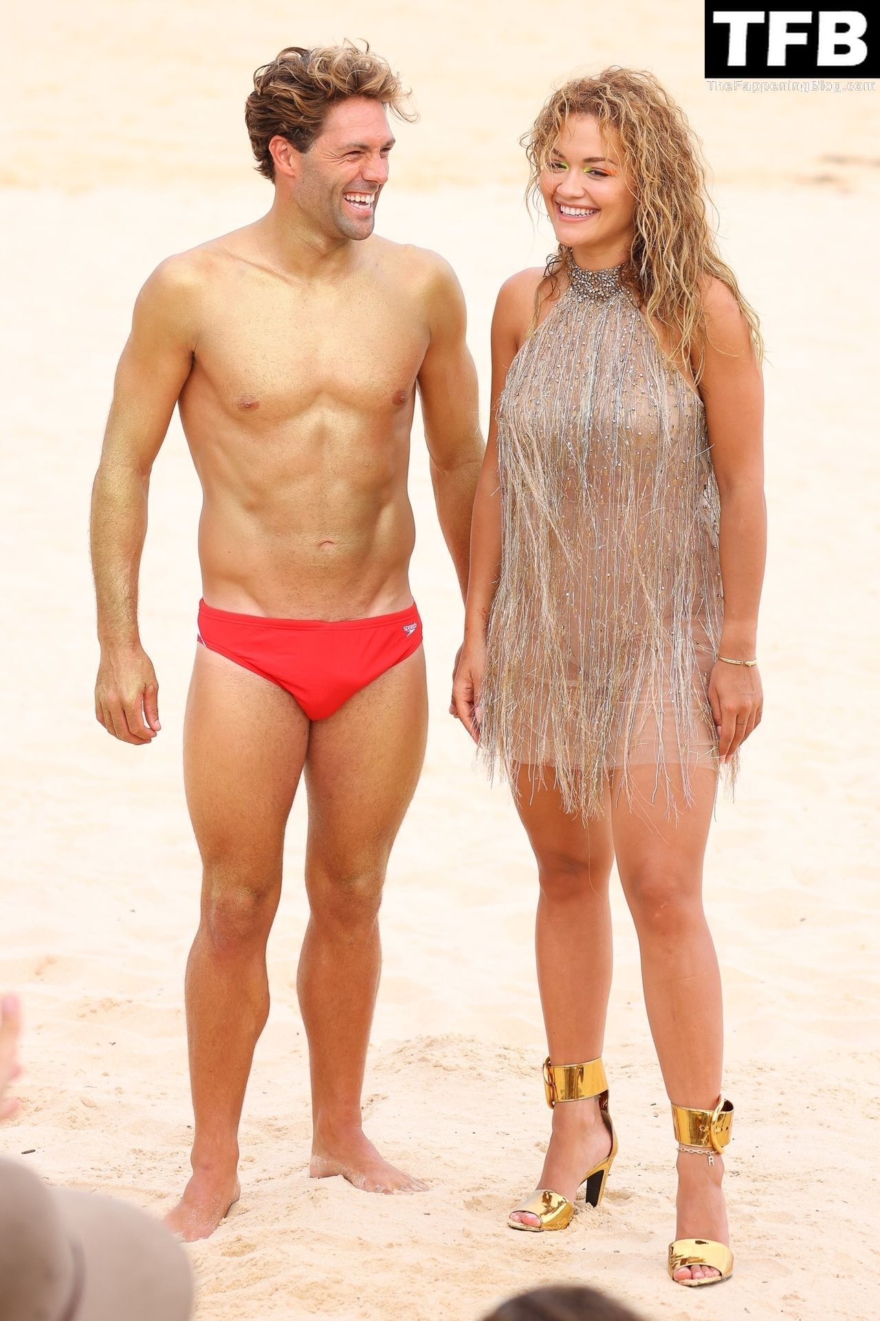 La cantante Rita Ora, de 31 años, parecía estar teniendo su propio momento Baywatch mientras participaba en la sesión de fotos en la playa Maroubra de Sídney. Rita deslumbró con un vestido dorado con flecos mientras posaba con hombres en speedos. El vestido presentaba un escote con pedrería, con la longitud corta que mostraba las tonificadas piernas de la cantante.