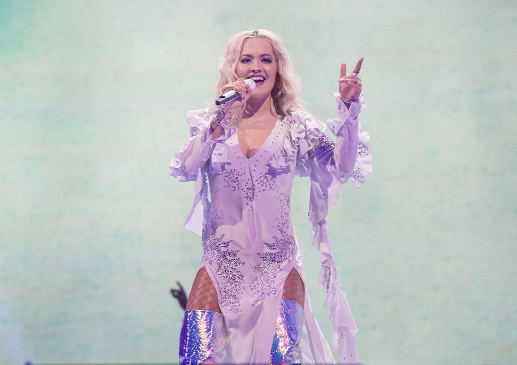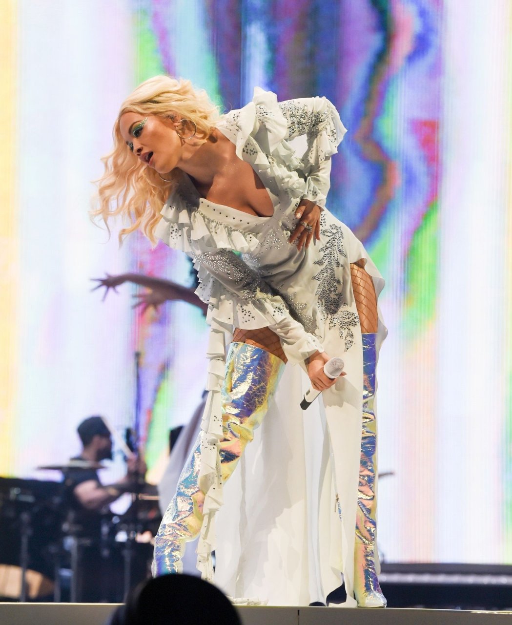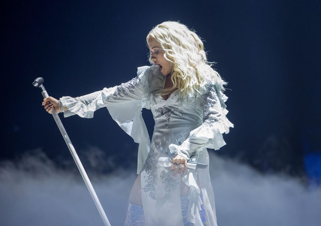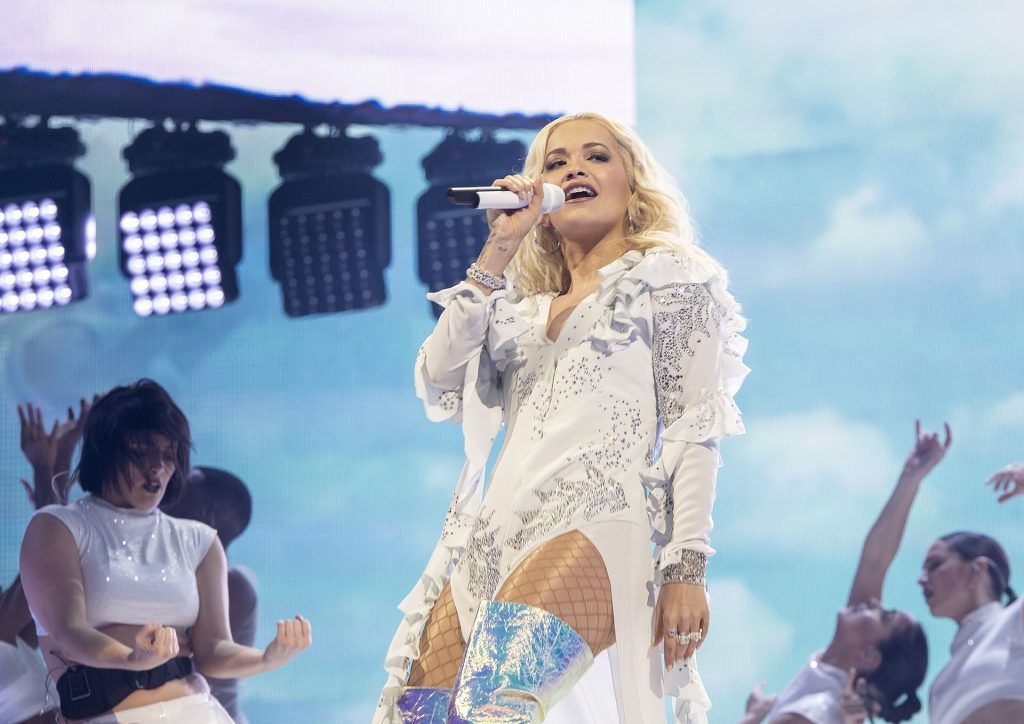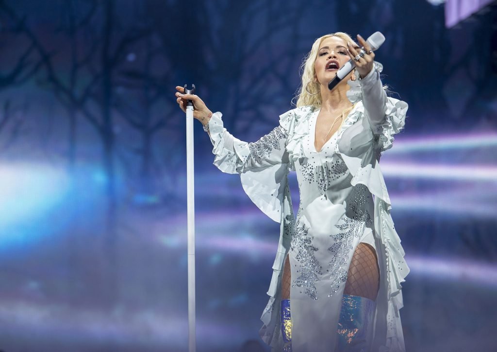 La cantante Rita Ora fue fotografiada en el escenario durante un concierto en vivo en el Liverpool M & S Bank Arena en Liverpool, 28/05/2019.