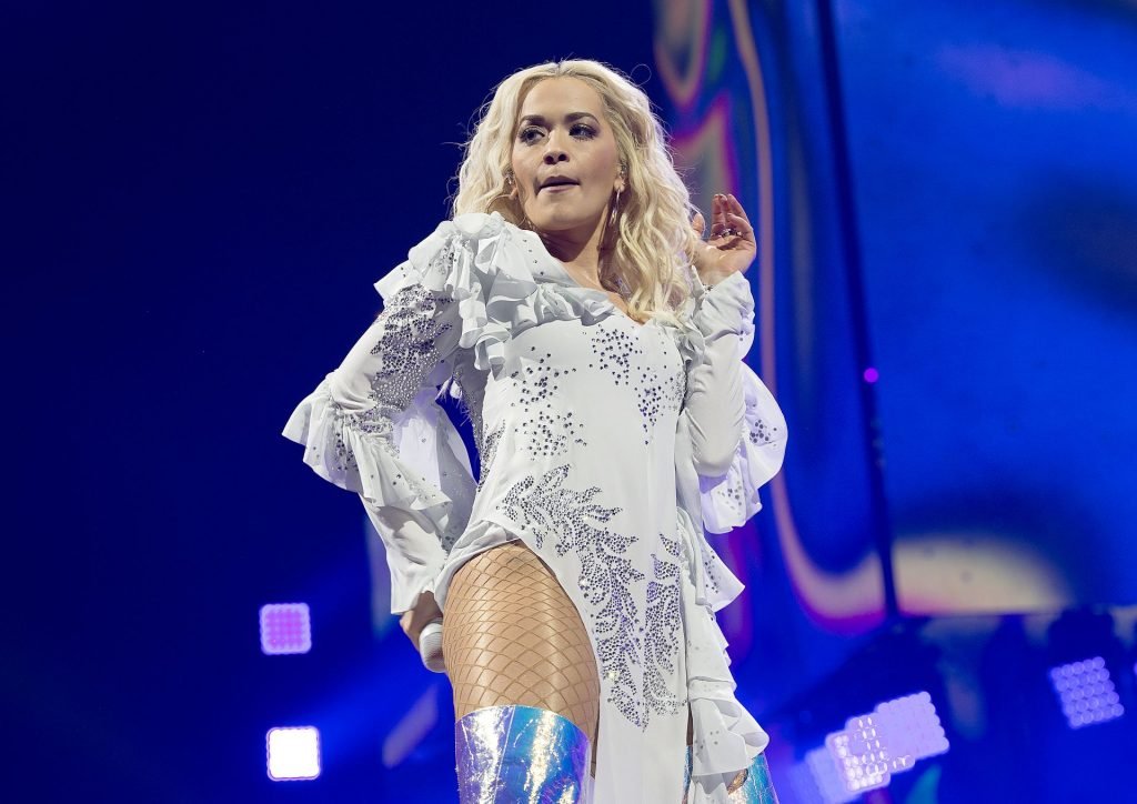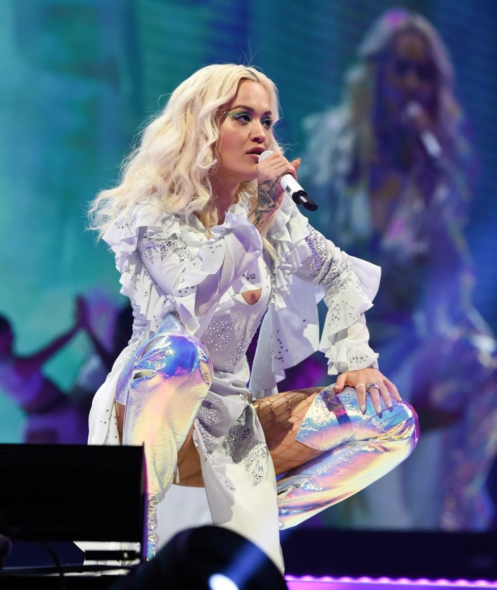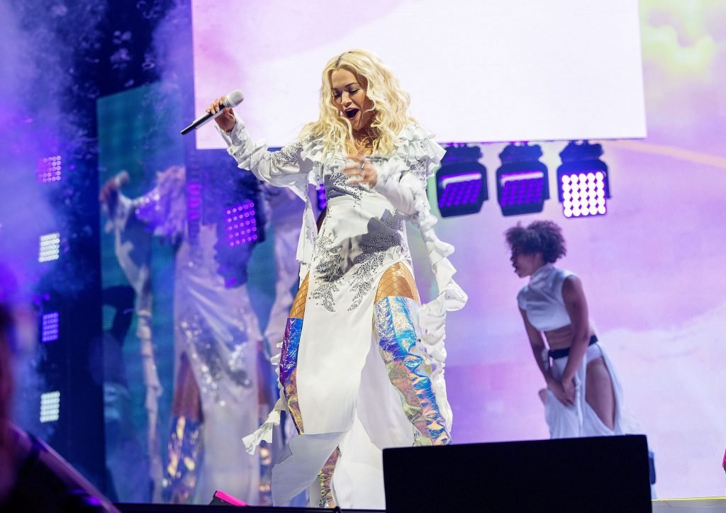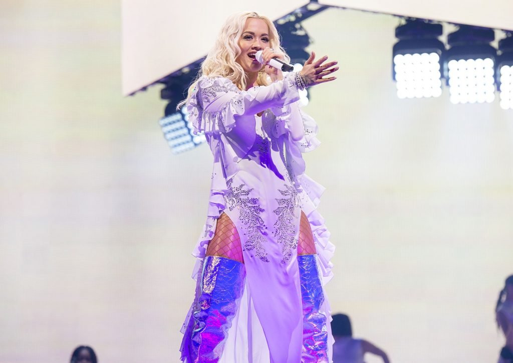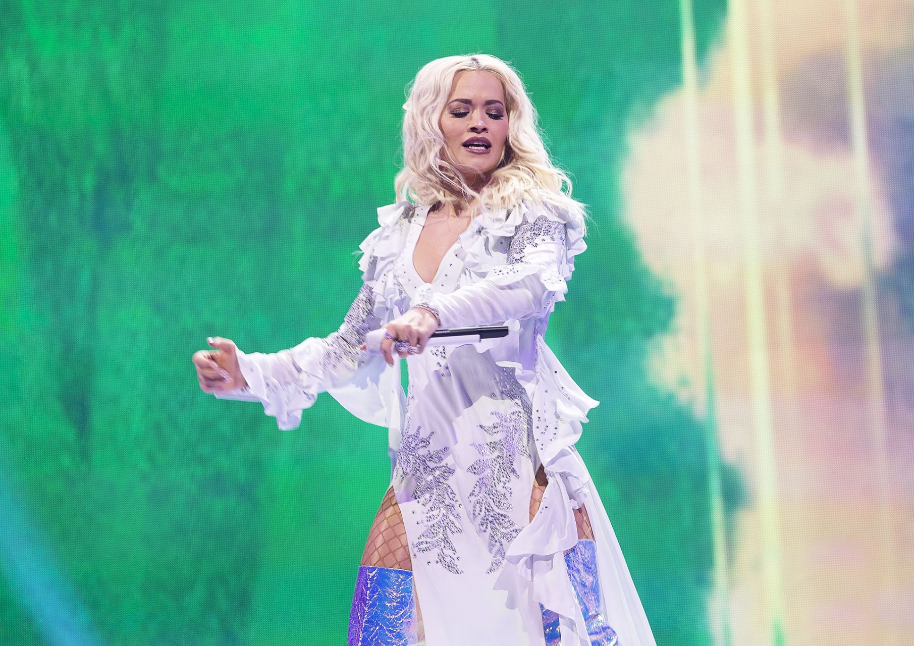 La cantante Rita Ora fue fotografiada en el escenario durante un concierto en vivo en el Liverpool M & S Bank Arena en Liverpool, 28/05/2019.