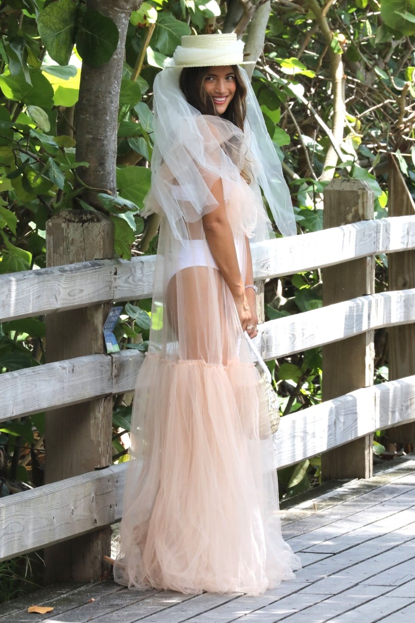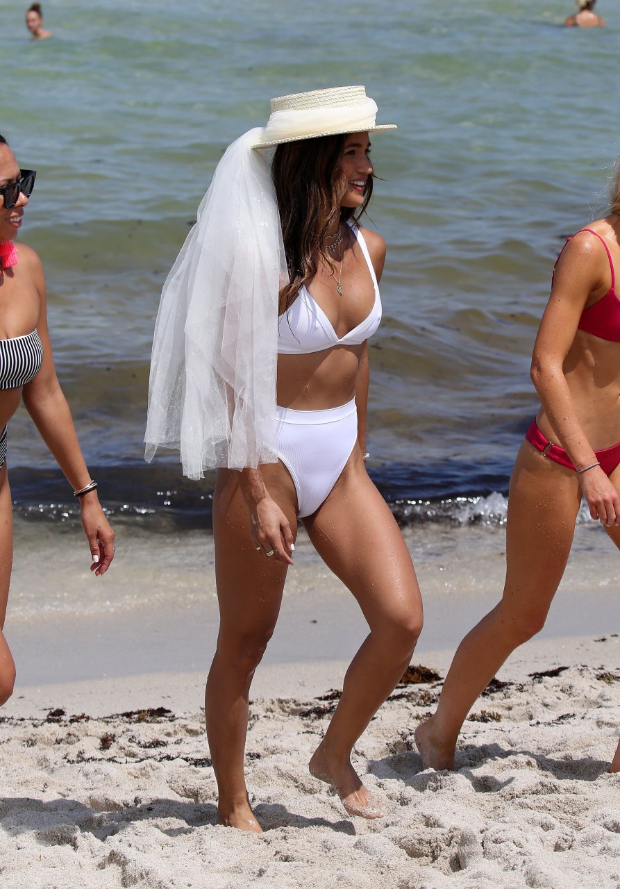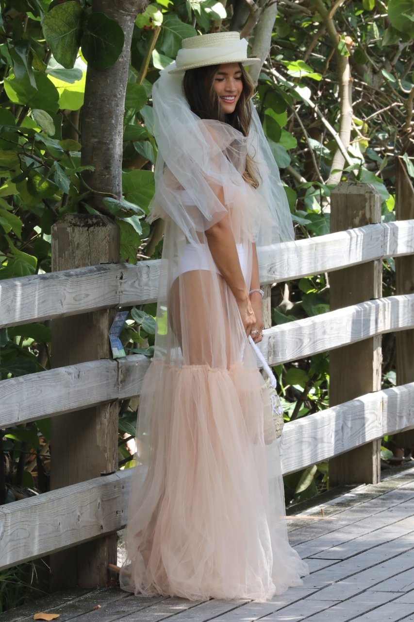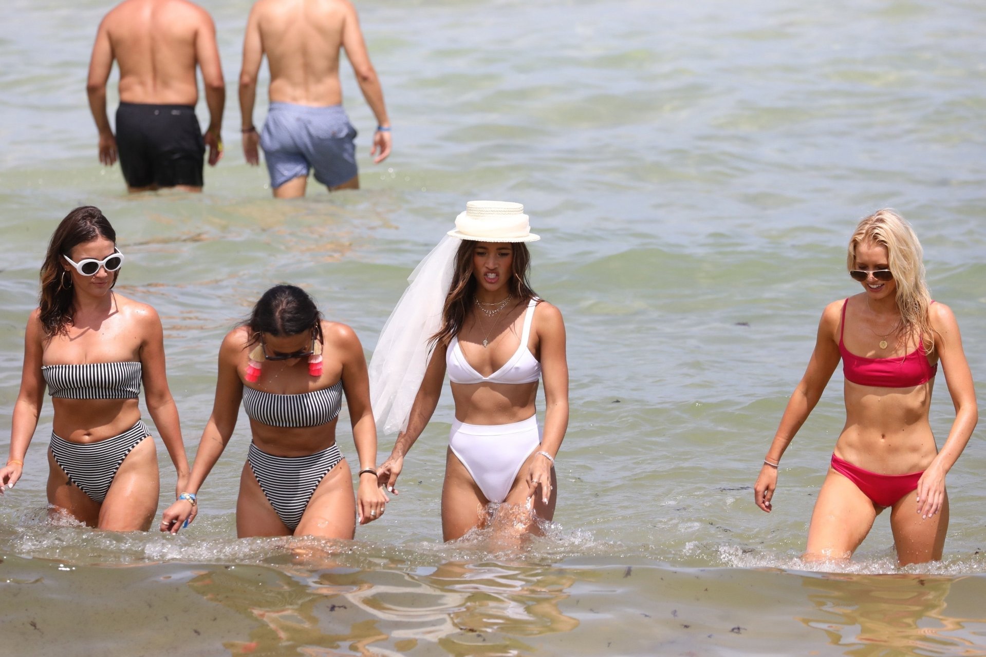 Rocky Barnes realiza una sesión de fotos en la playa antes de su boda en Miami Beach, 11/08/2018. Rocky aparece con sus amigas mientras se sumergen en las aguas de Florida en bikini, mientras Rocky lleva un velo para la sesión. Rachel (Rocky) Barnes es una modelo y bloguera estadounidense. Nacida: 12 de noviembre de 1985.