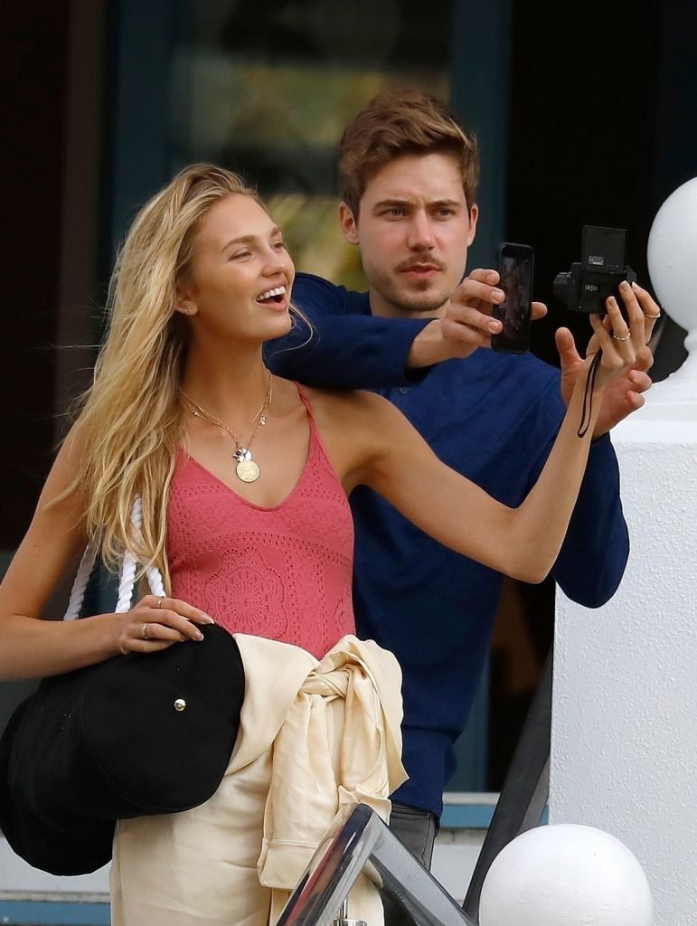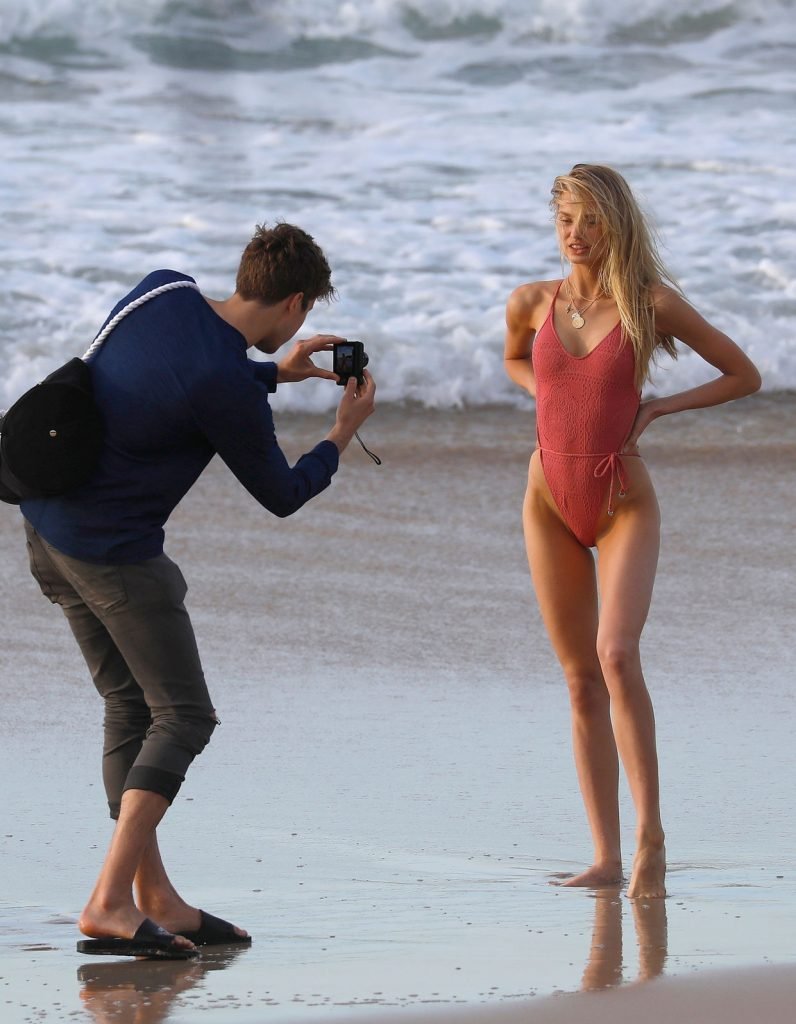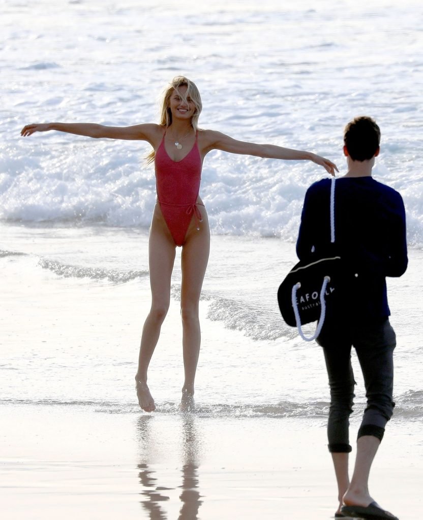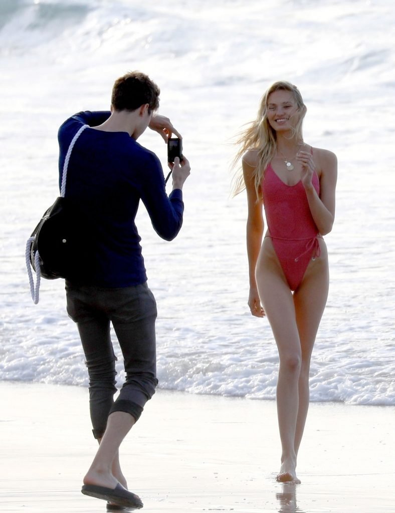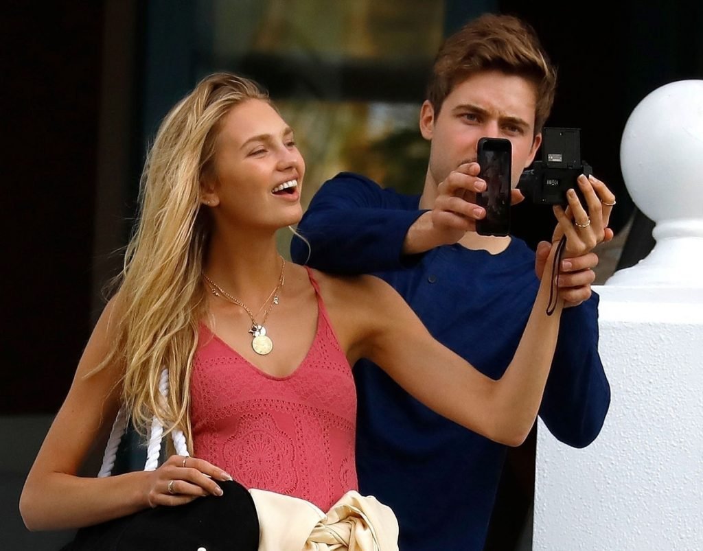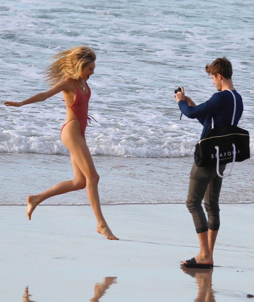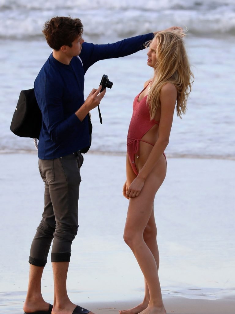 La modelo holandesa de 22 años de Victoria’s Secret y su novio fueron a la playa donde la delgada y atractiva posó con un sexy traje de baño de una pieza para su chico.