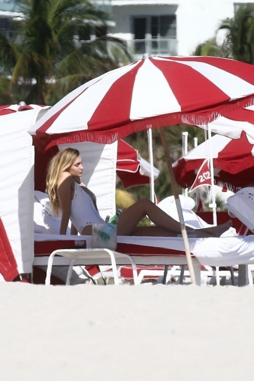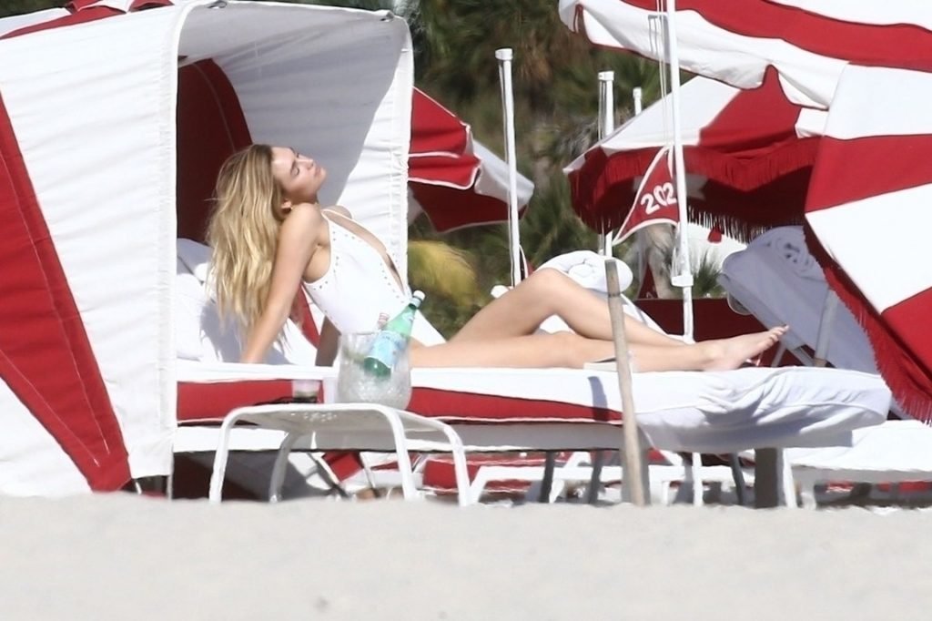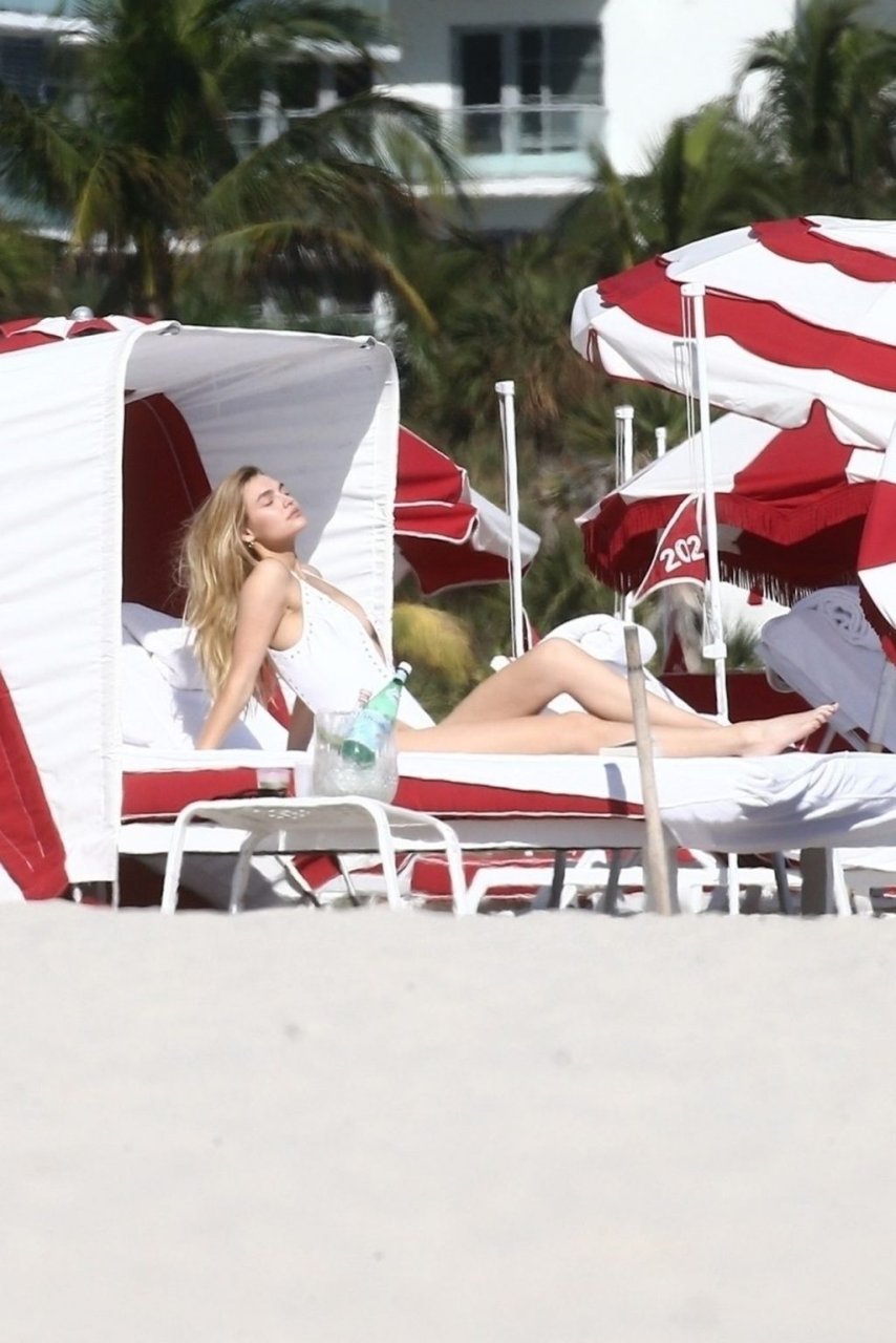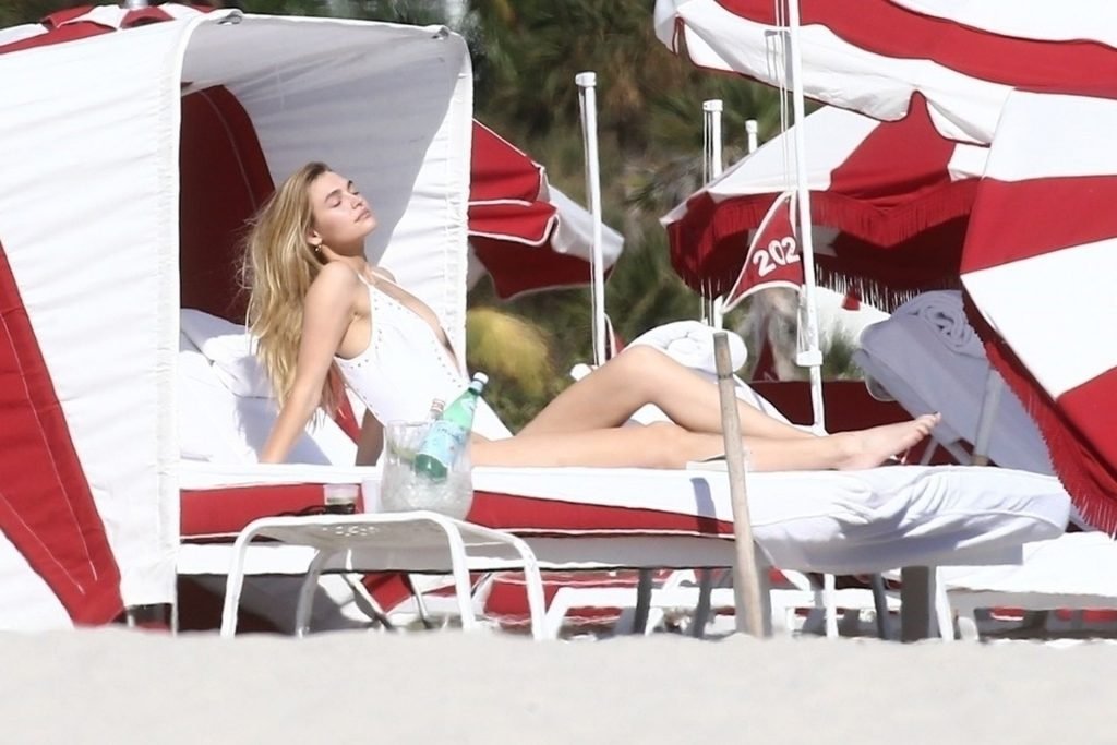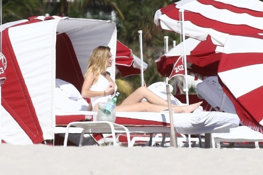 Victoria’s Secret Angel Roosmarijn de Kok (24) disfruta de un día en la playa en Miami, 01/06/2019. Roosmarijn (Roos) luce genial con un traje de baño blanco de una pieza mientras toma el sol y disfruta del mar.