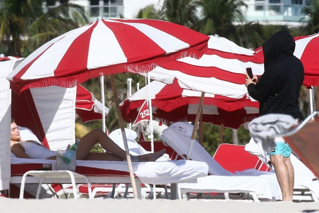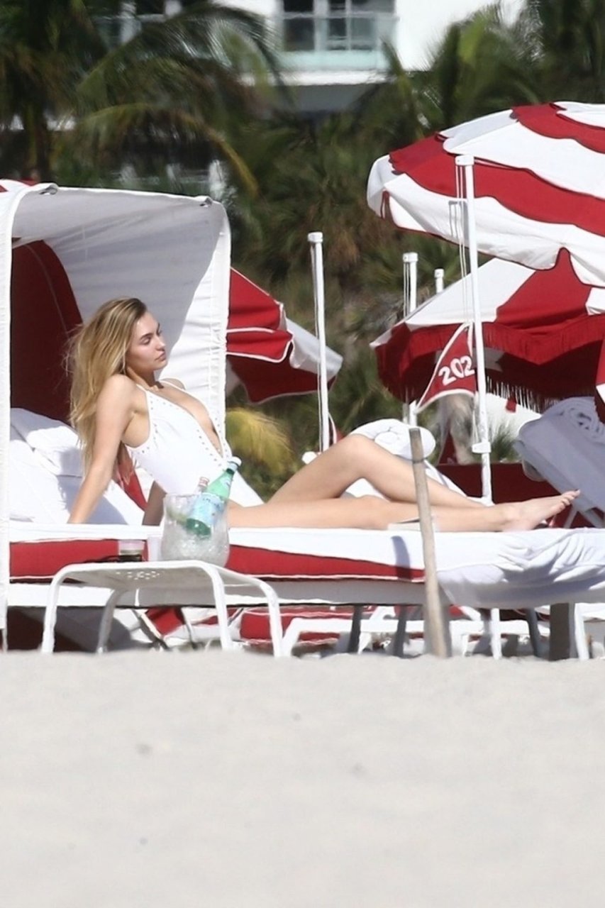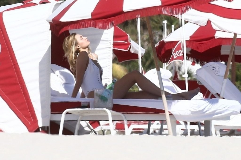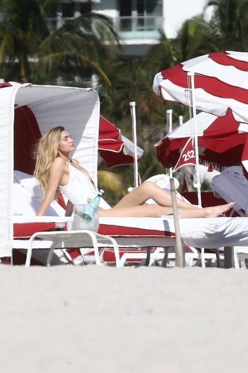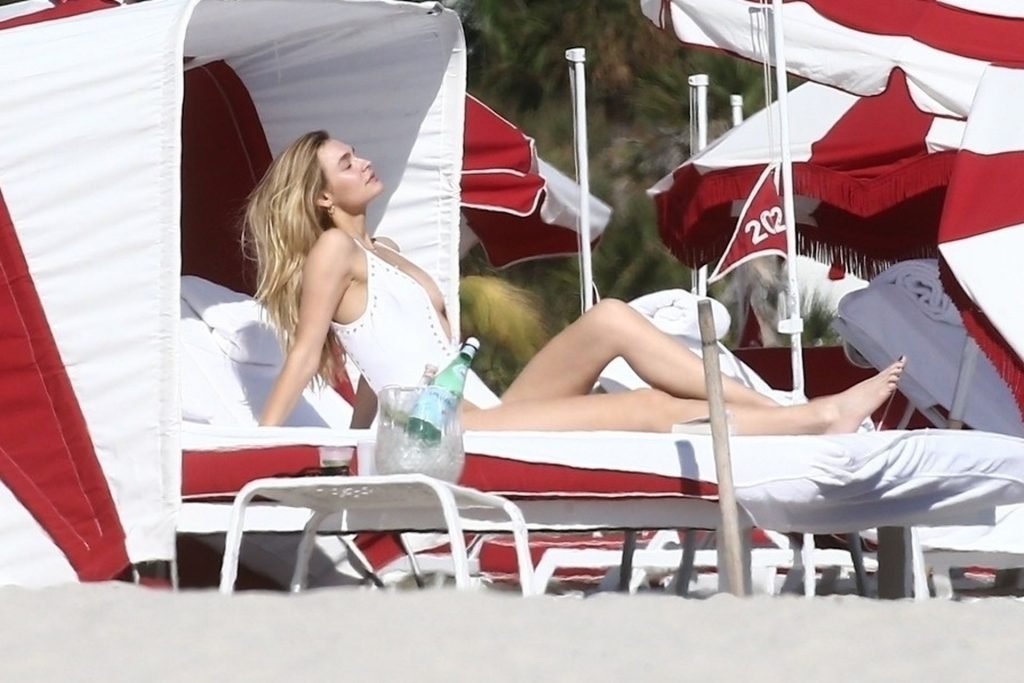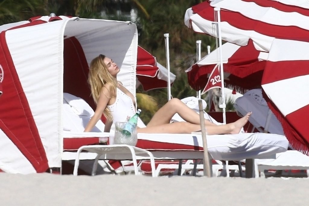 Victoria’s Secret Angel Roosmarijn de Kok (24) disfruta de un día en la playa en Miami, 01/06/2019. Roosmarijn (Roos) luce genial con un traje de baño blanco de una pieza mientras toma el sol y disfruta del mar.