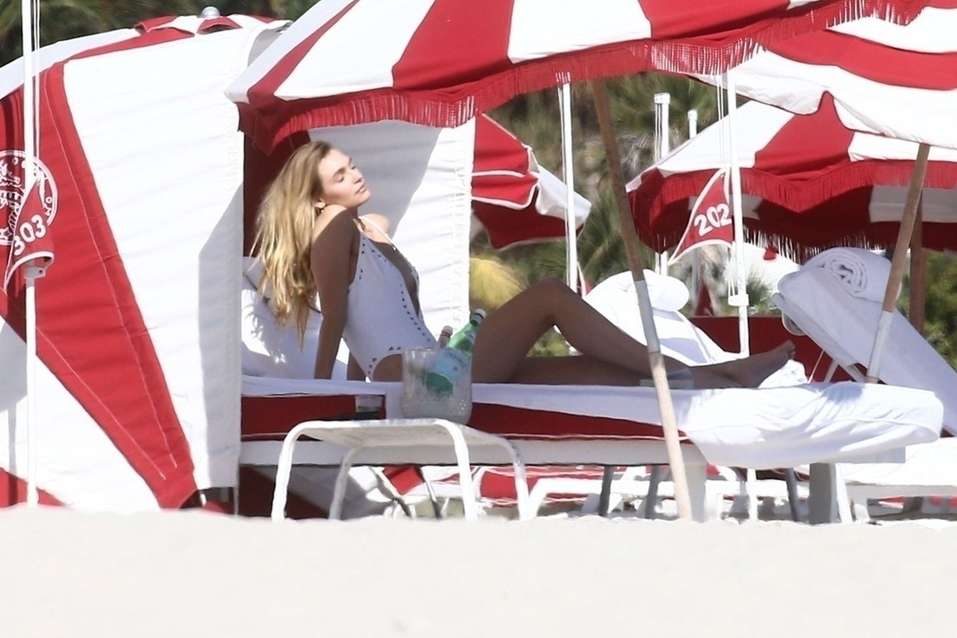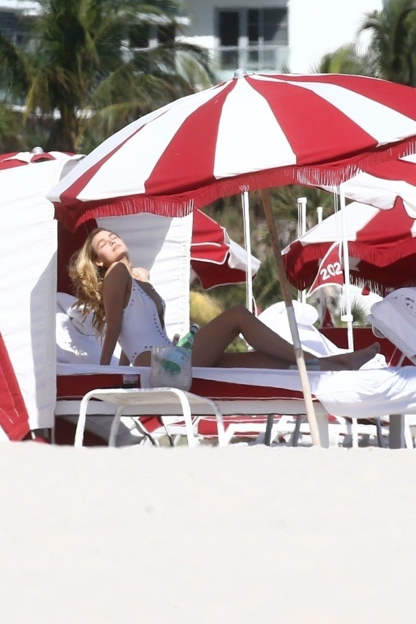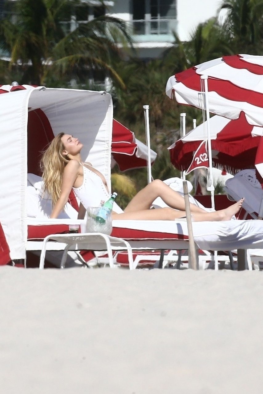 Victoria’s Secret Angel Roosmarijn de Kok (24) disfruta de un día en la playa en Miami, 01/06/2019. Roosmarijn (Roos) luce genial con un traje de baño blanco de una pieza mientras toma el sol y disfruta del mar.