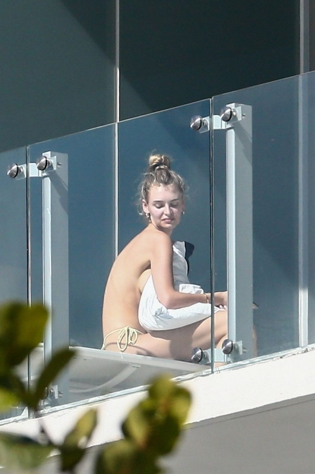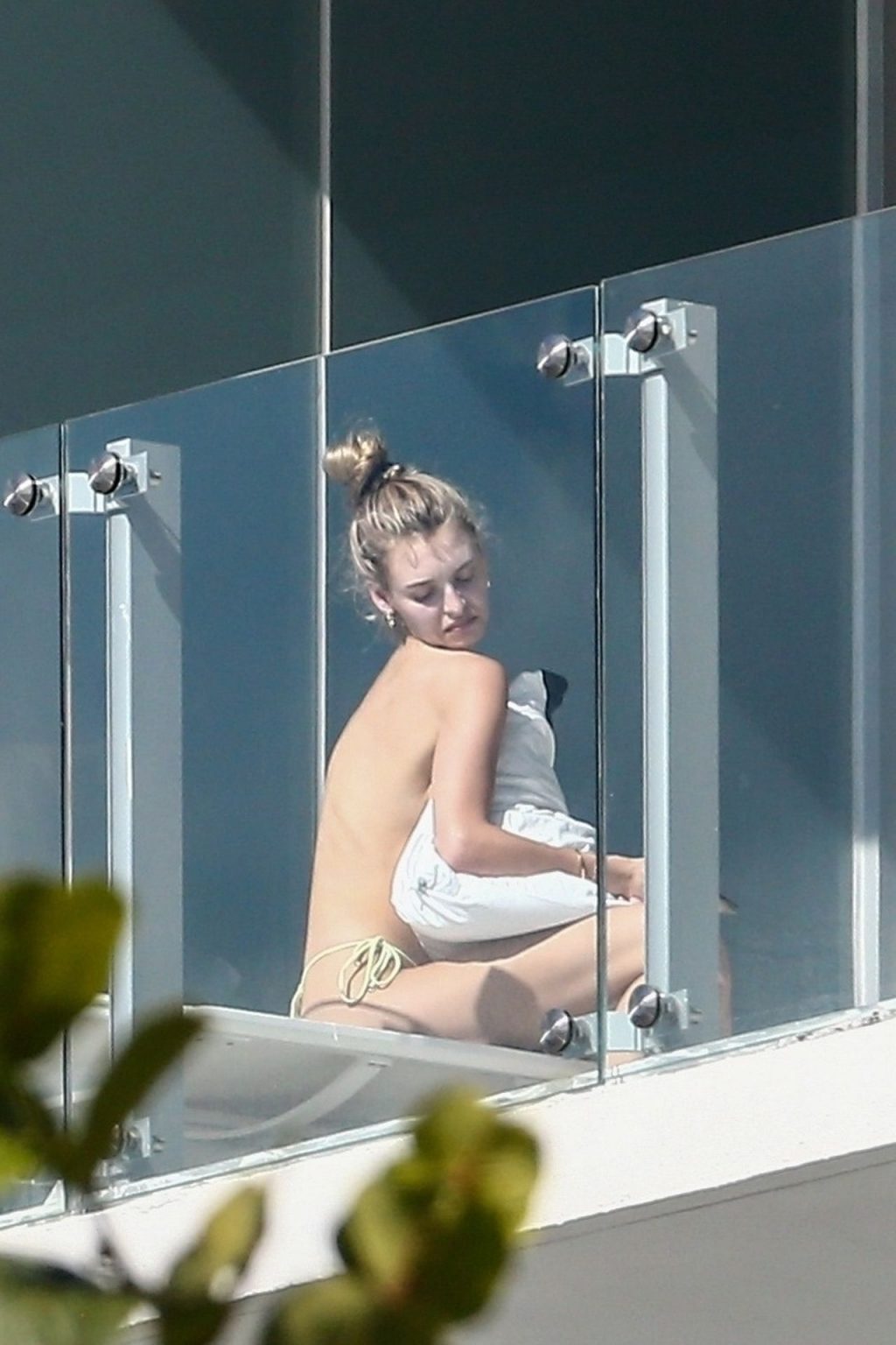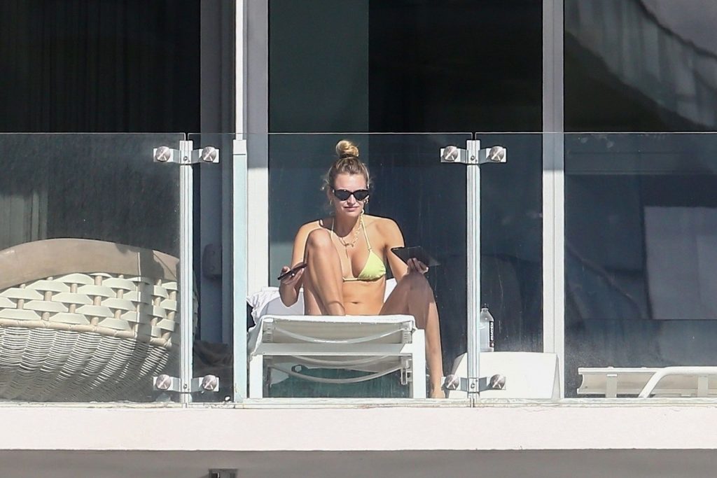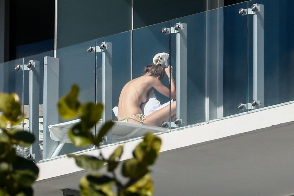 La modelo neerlandesa Roosmarijn de Kok aprovecha el tiempo libre en aislamiento y el clima soleado para tomar el sol en su balcón en Miami, 04/02/2020.