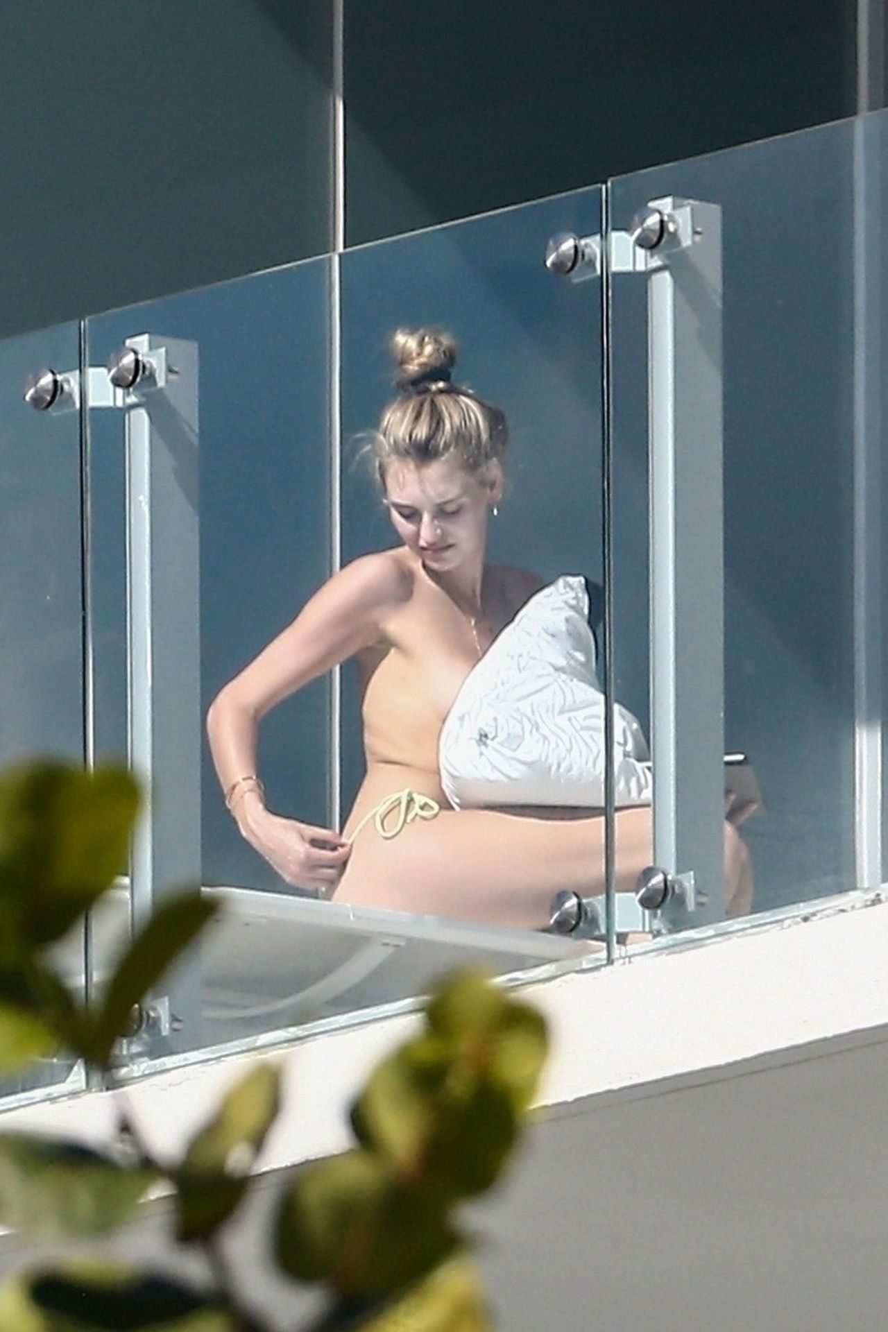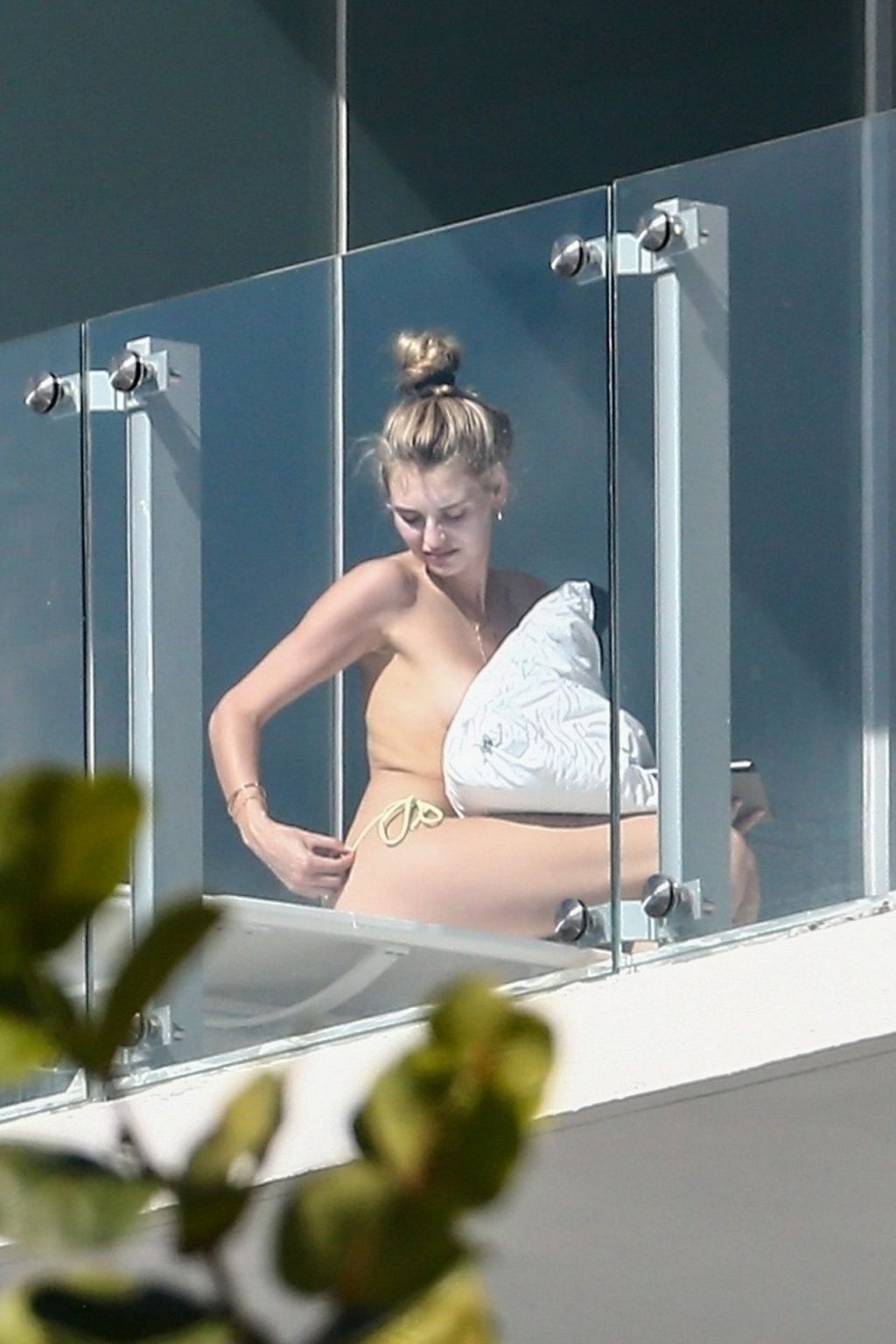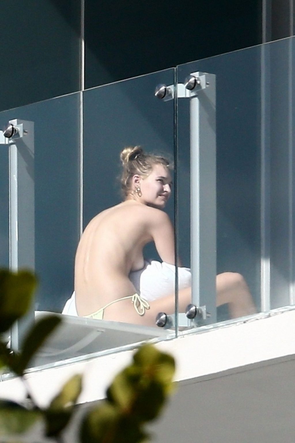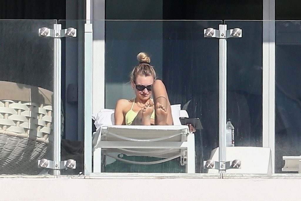 La modelo neerlandesa Roosmarijn de Kok aprovecha el tiempo libre en aislamiento y el clima soleado para tomar el sol en su balcón en Miami, 04/02/2020.