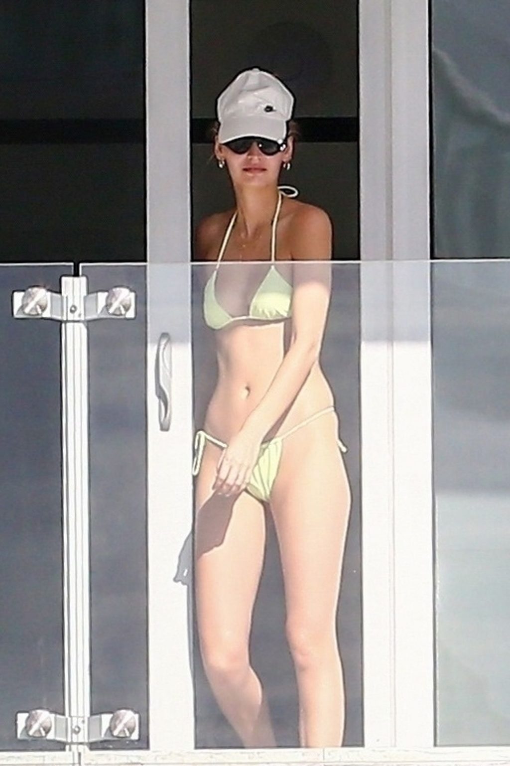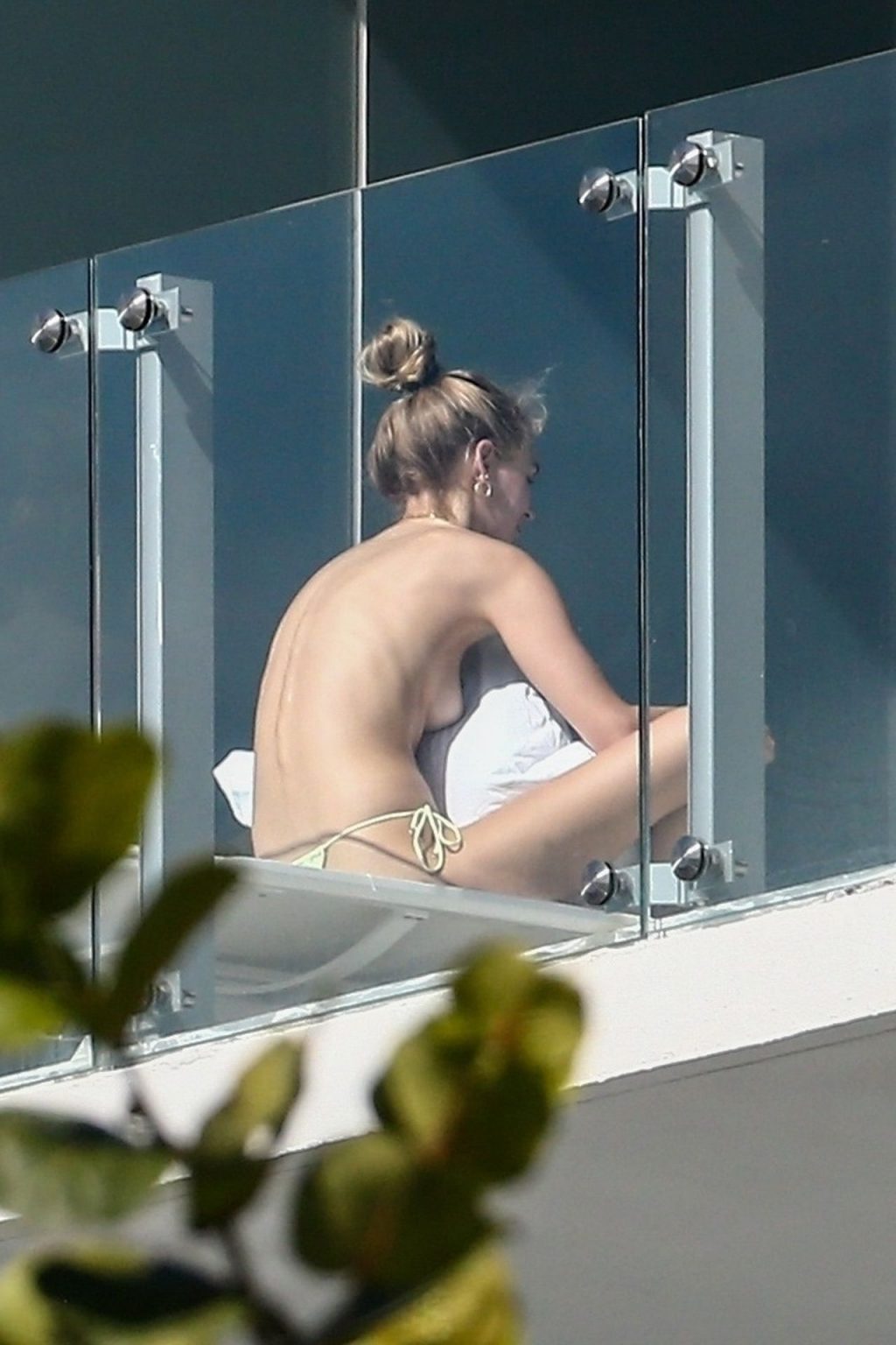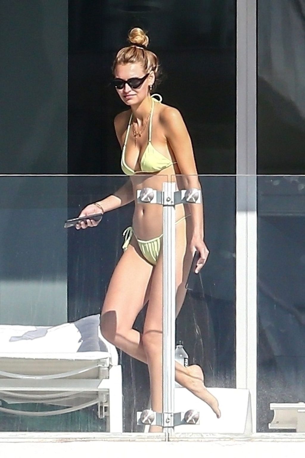 La rubia belleza lució un pequeño bikini amarillo y optó por quitarse la parte superior para evitar esas malas marcas de tirantes.