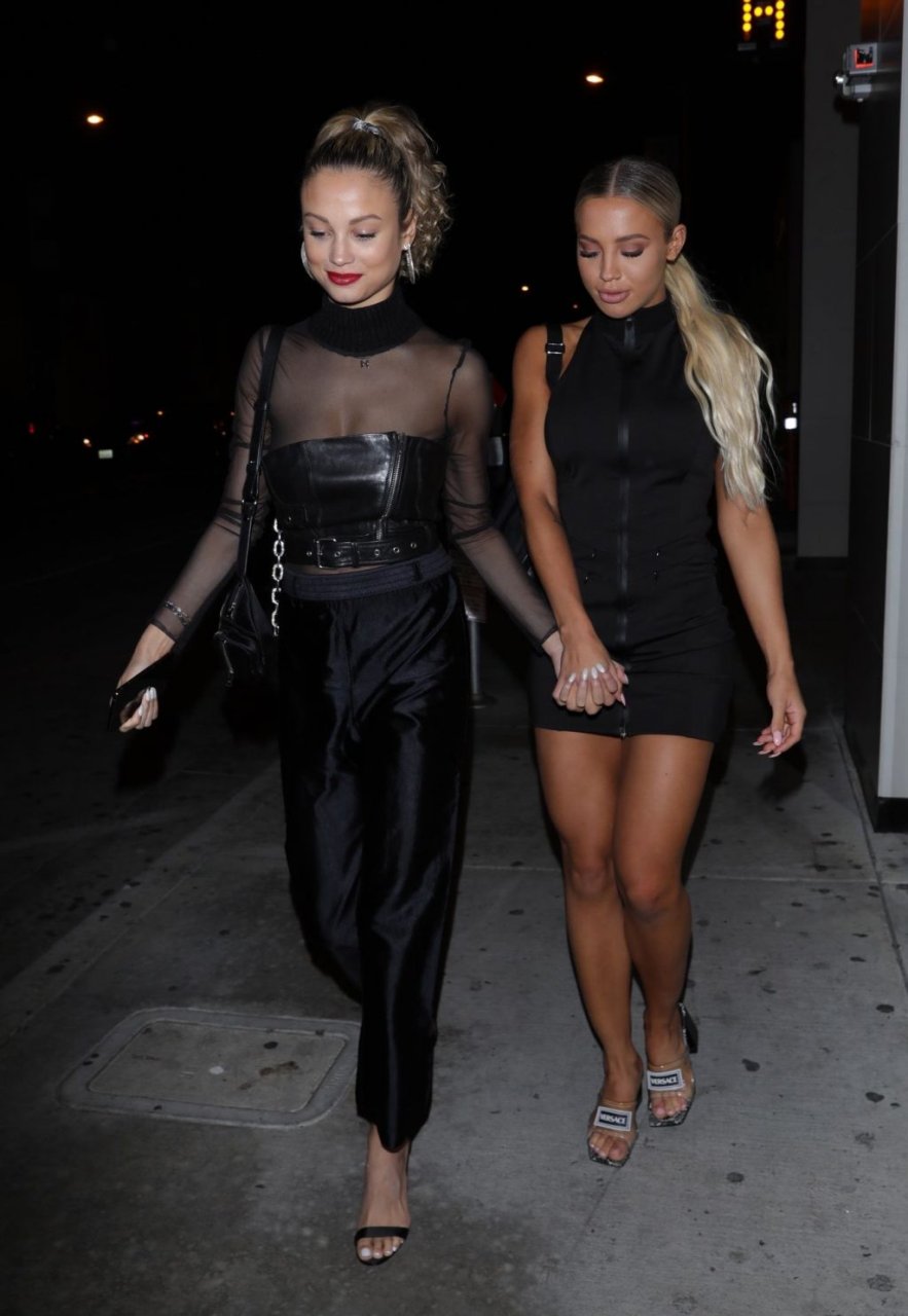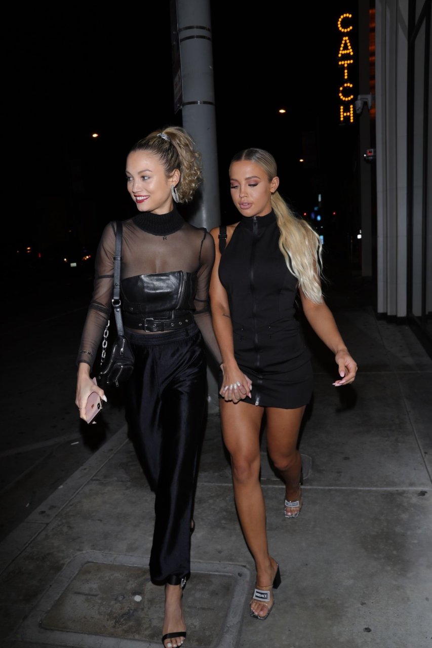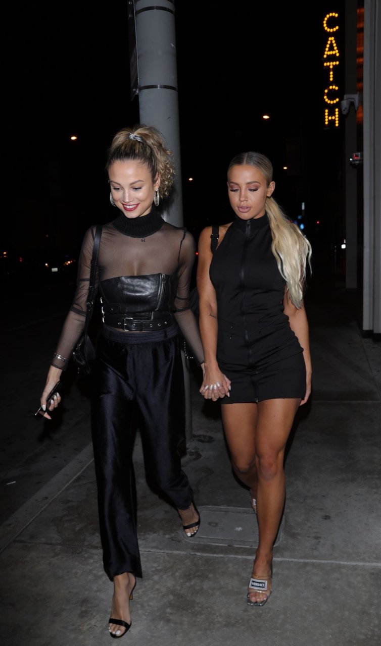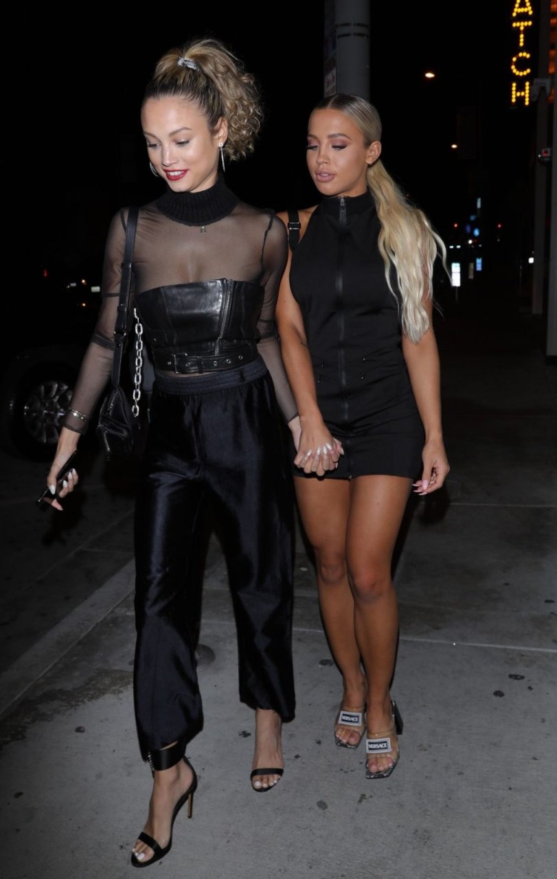 La modelo fitness australiana Tammy Hembrow llevó un vestido negro corto y zapatos transparentes de Versace para una noche de chicas en Catch LA con Rose Bertram en West Hollywood, 17/03/2019.