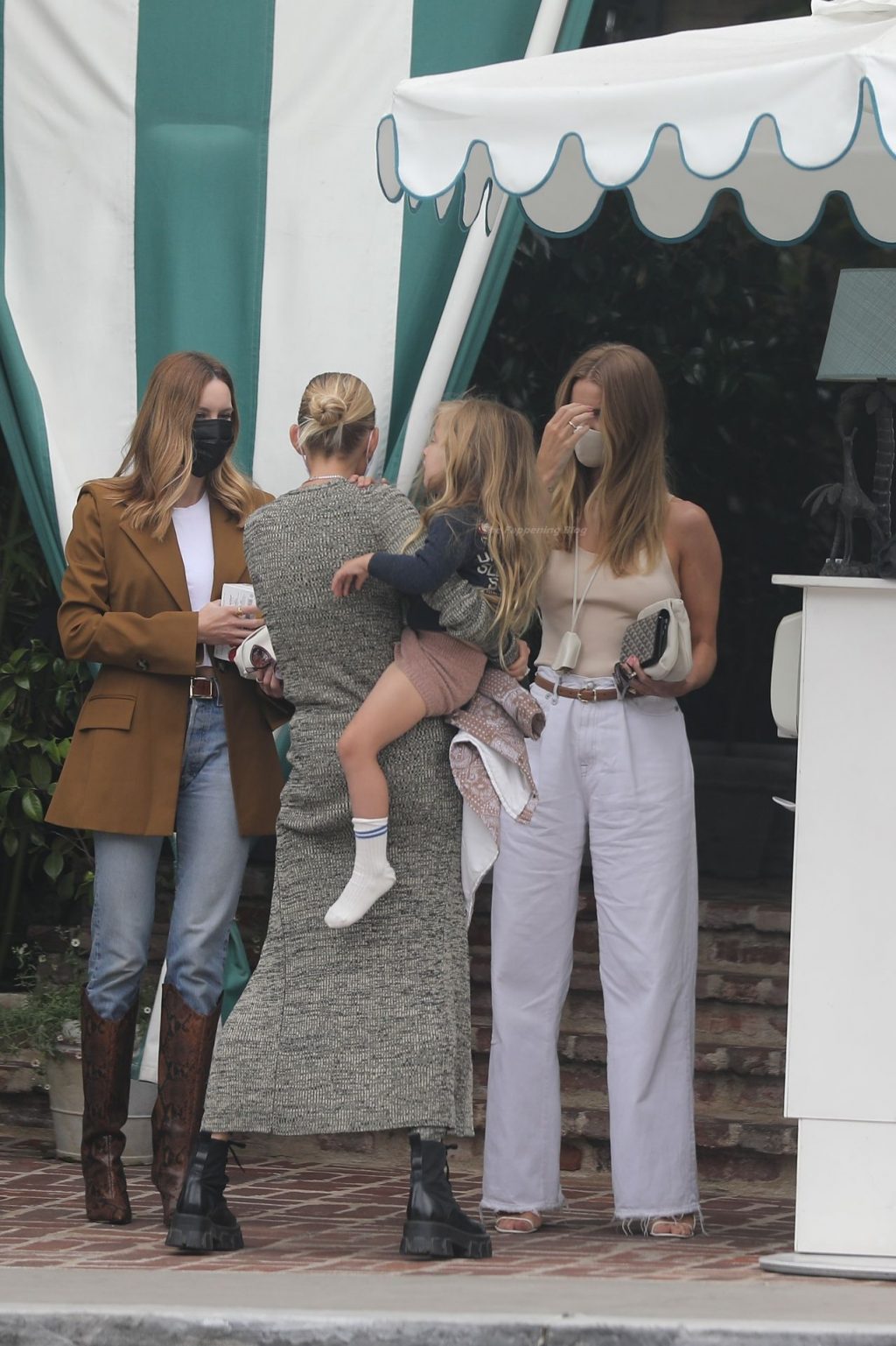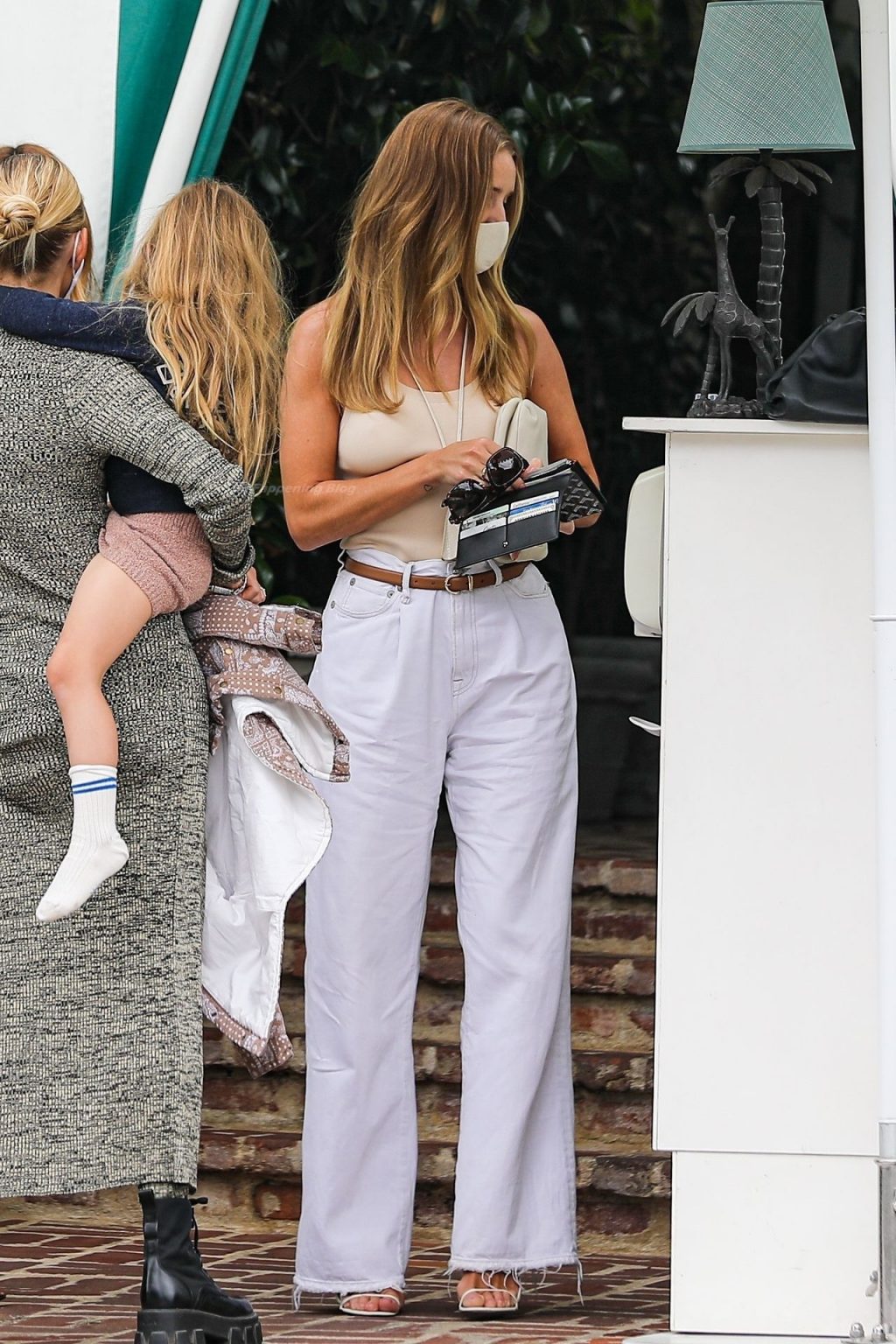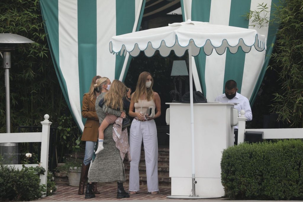 La modelo Rosie Huntington-Whiteley charla con sus amigos mientras espera su coche fuera de los San Vicente Bungalows después de asistir a un evento privado en West Hollywood, 15/05/2021.