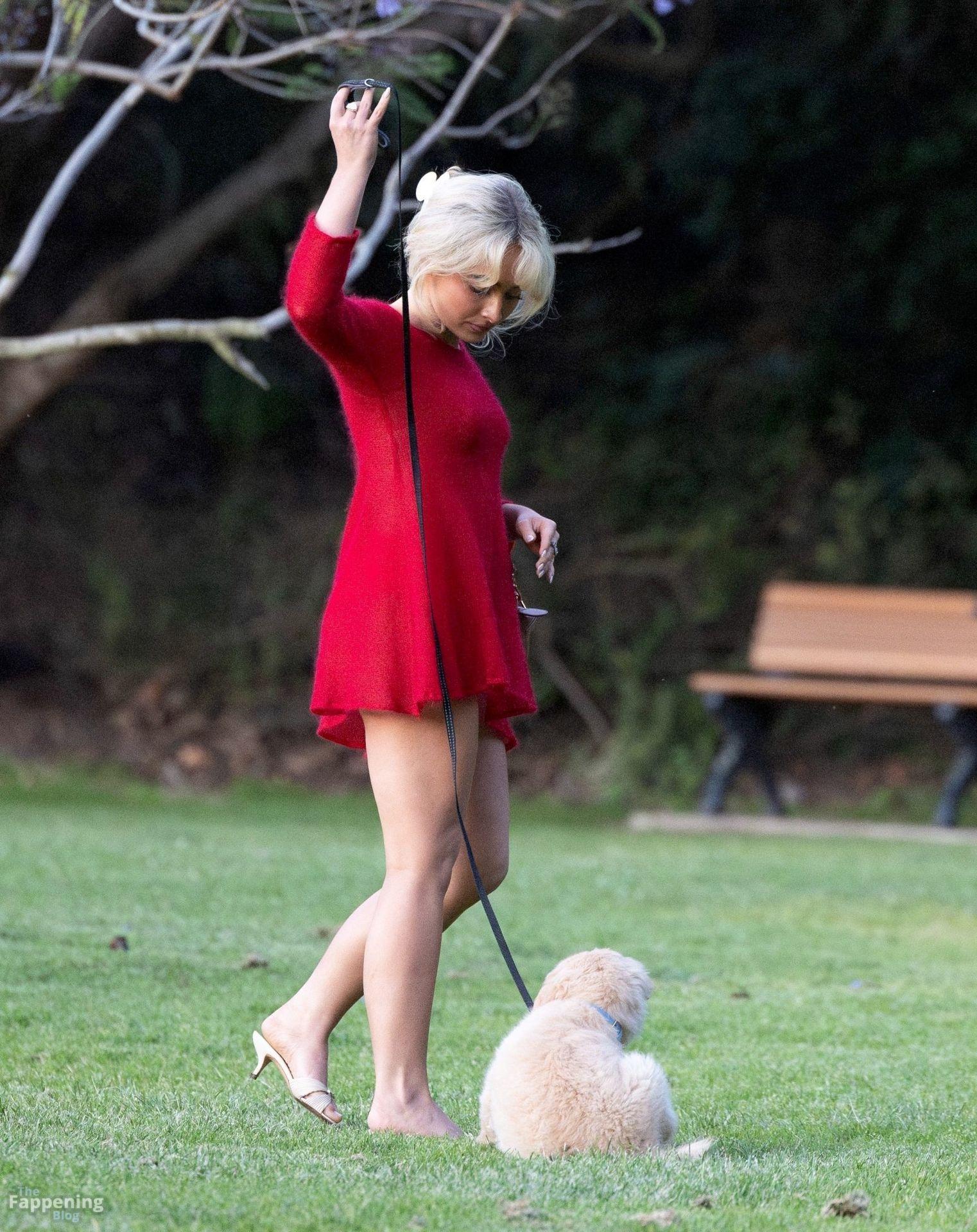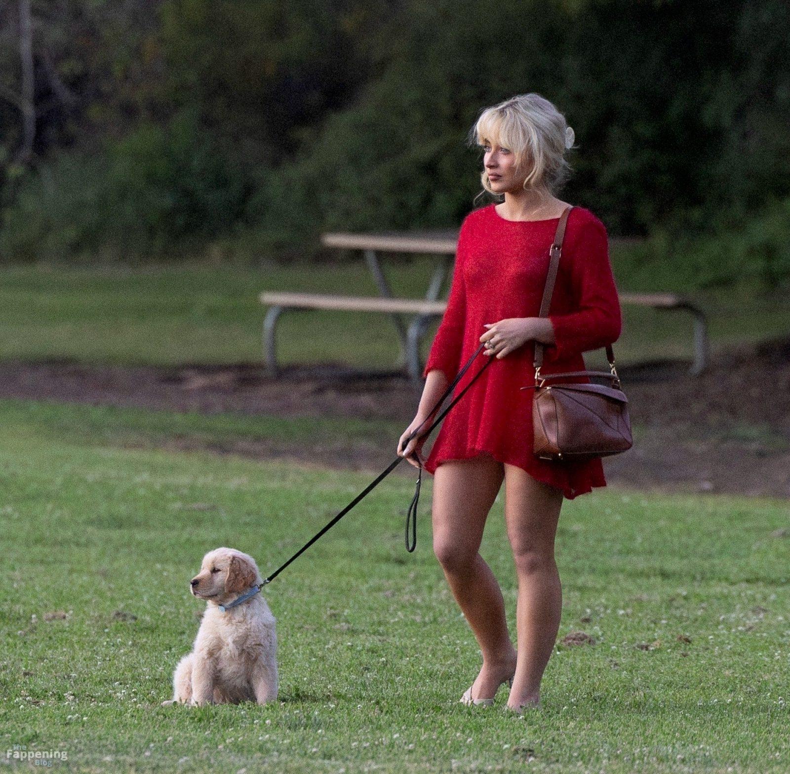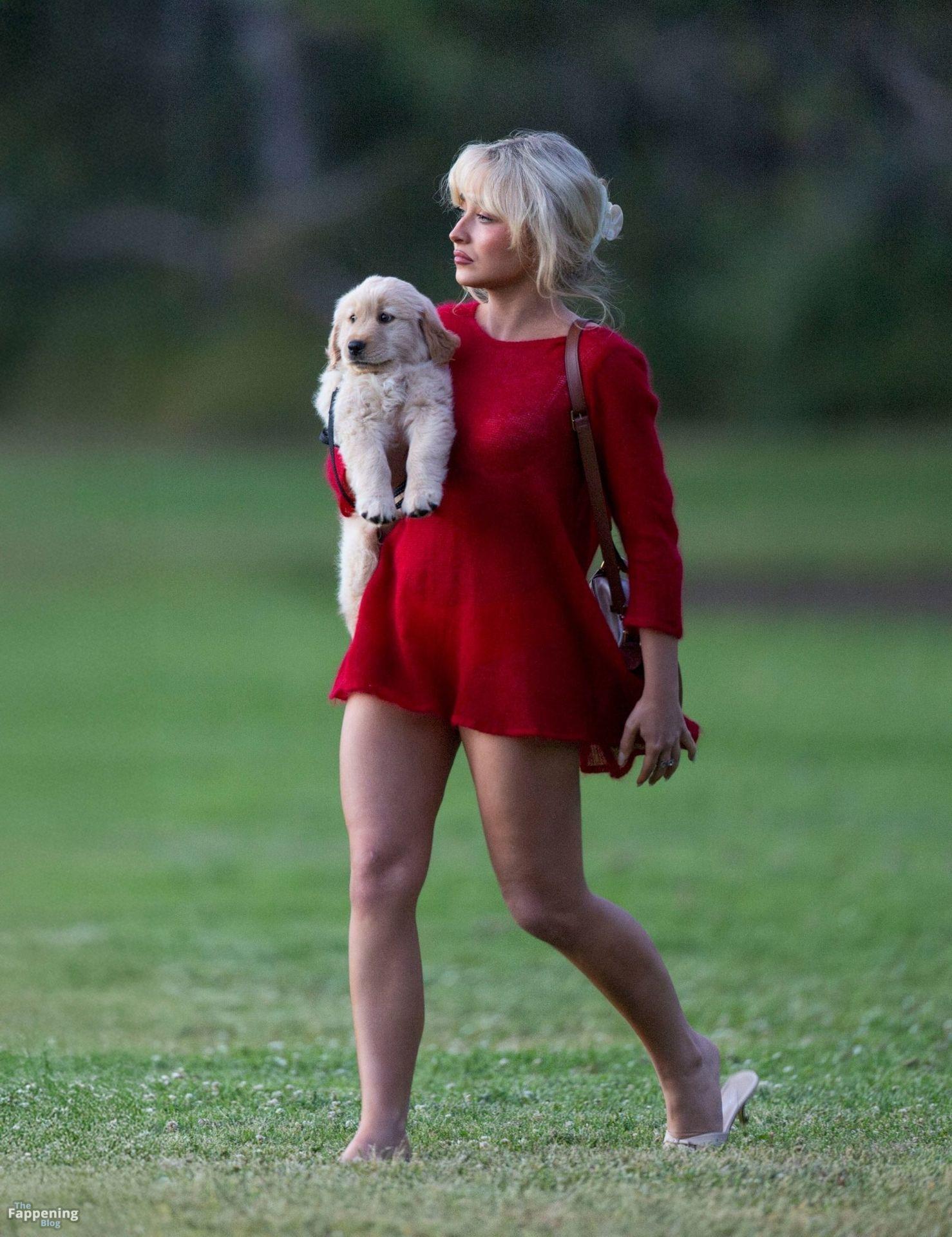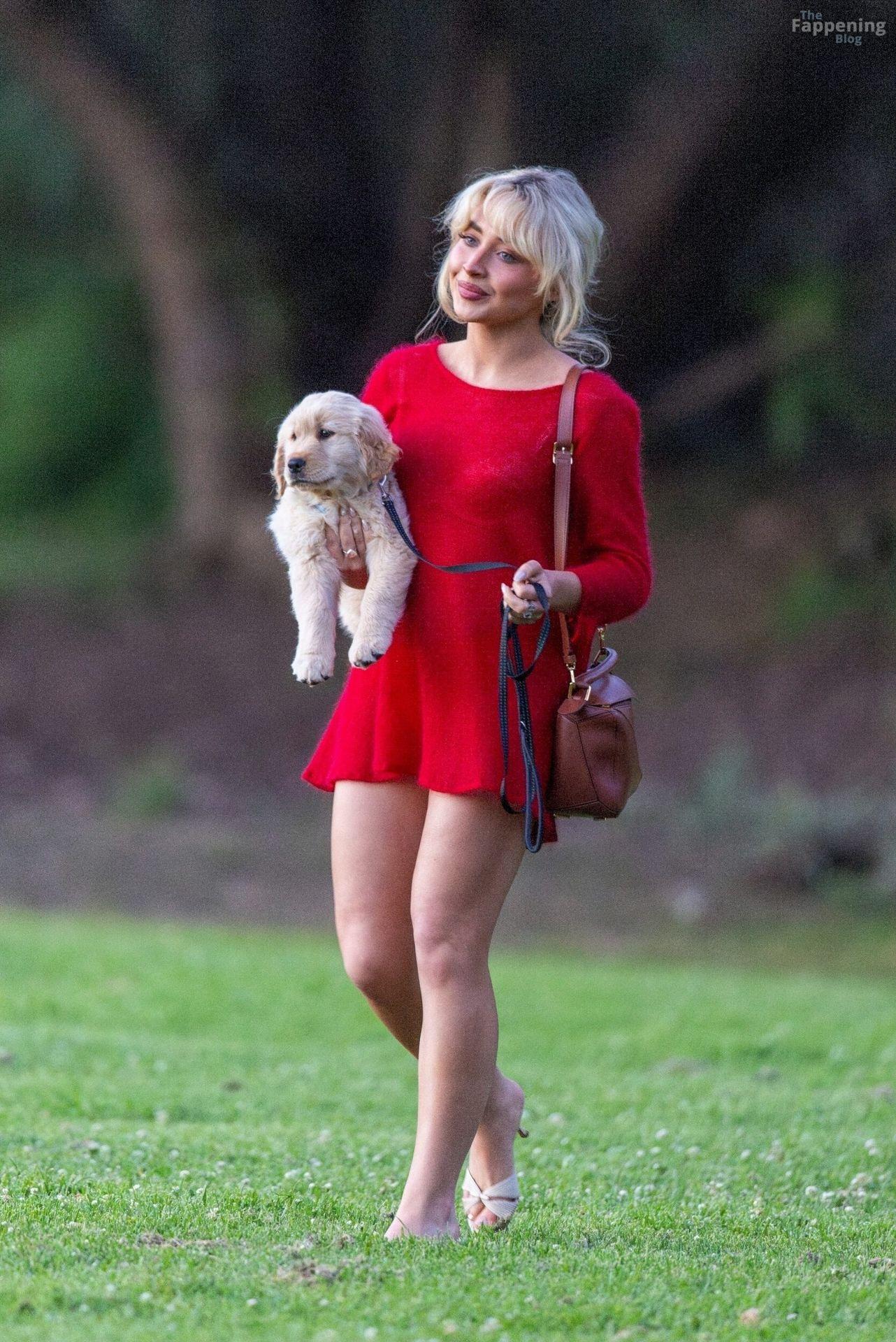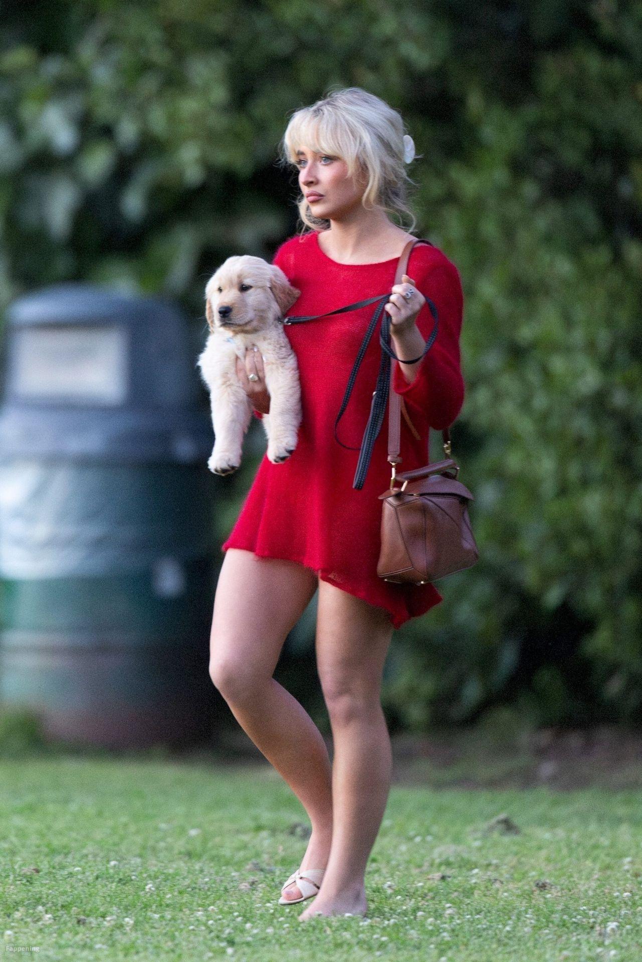 Sabrina Carpenter fue fotografiada con un minivestido rojo transparente, mostrando su sujetador y luciendo sus piernas calientes en un parque de las colinas de Hollywood.