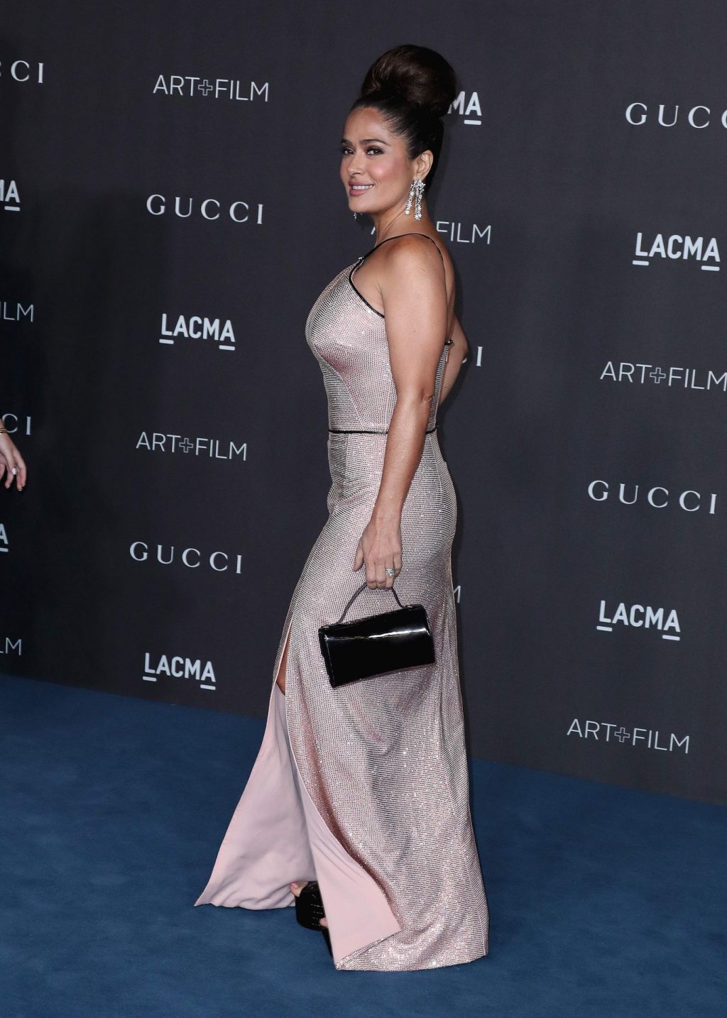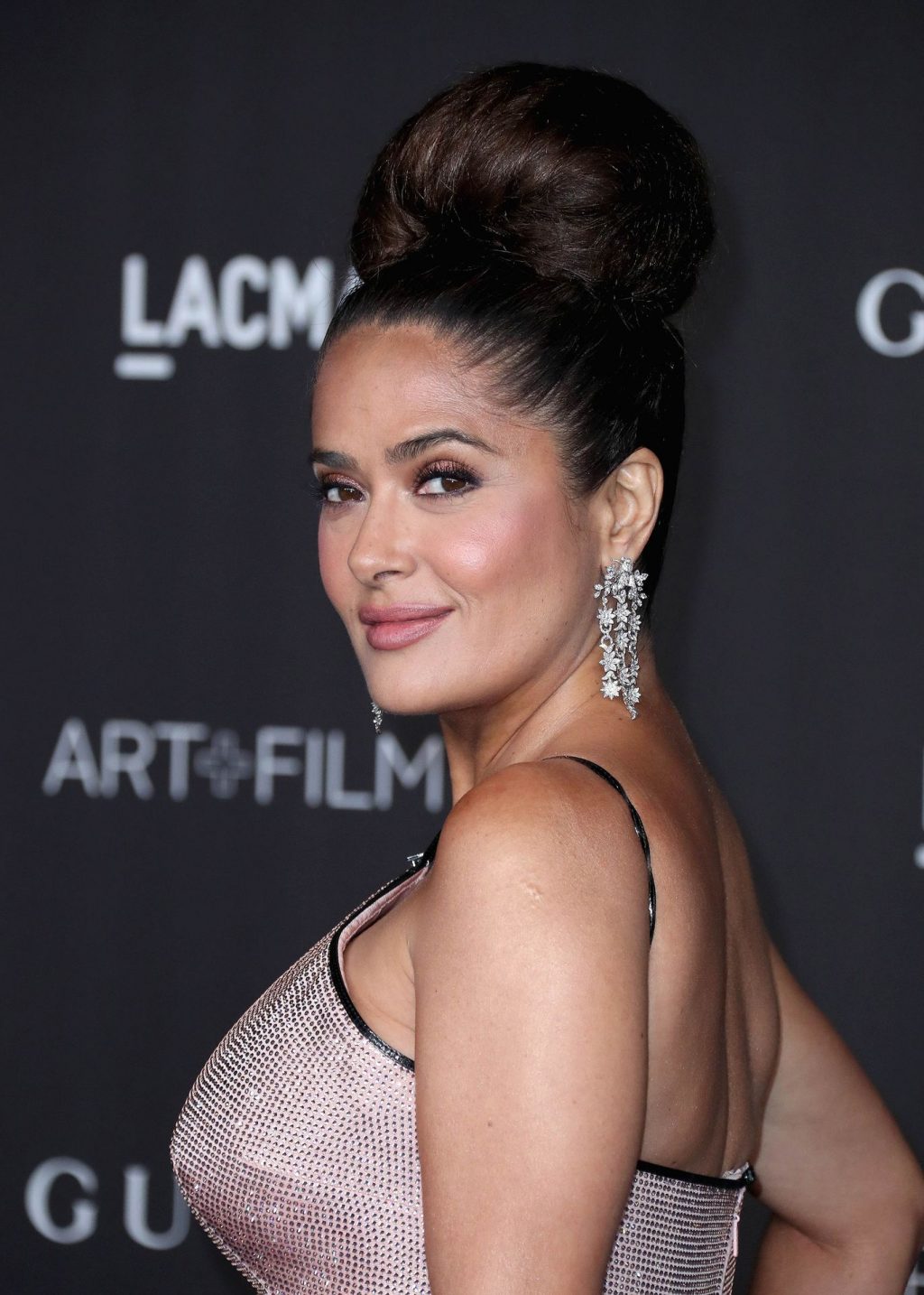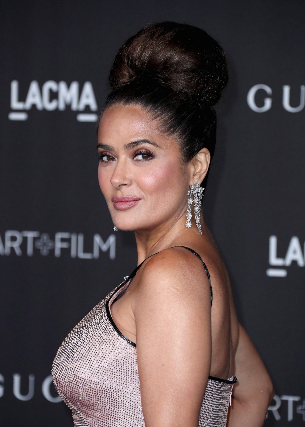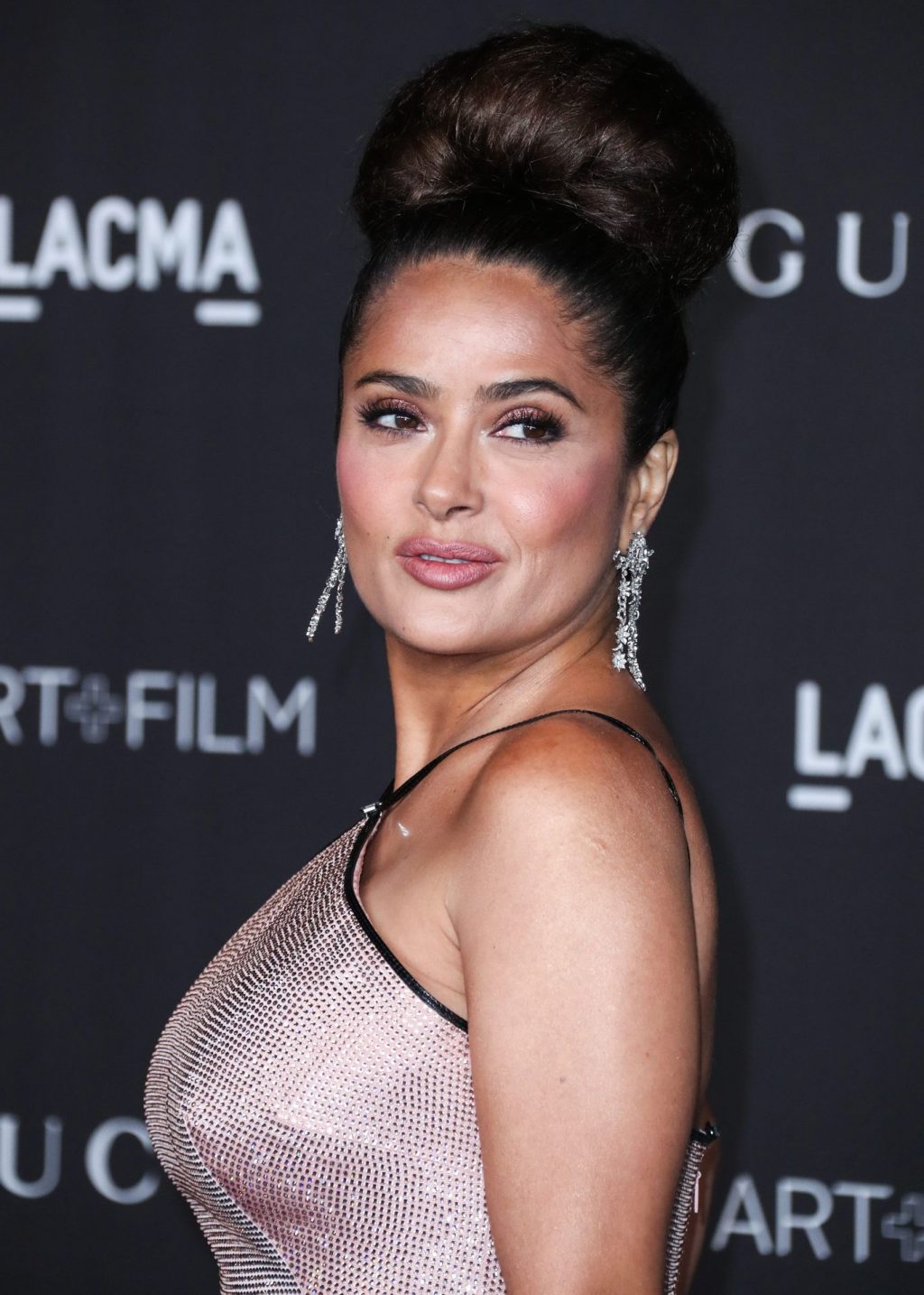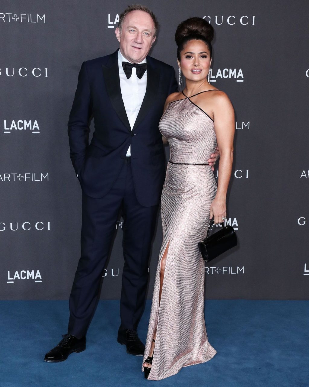 La actriz voluptuosa Salma Hayek Pinault, vestida con Gucci, llega a la Gala de Arte + Cine LACMA 2019 celebrada en el Museo de Arte del Condado de Los Ángeles el 2 de noviembre de 2019 en Los Ángeles.