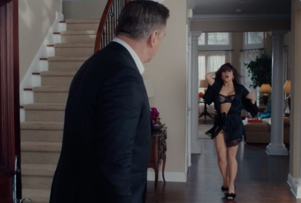Salma Hayek se asusta al ser sorprendida usando lencería sexy en una nueva comedia cinematográfica. La actriz aparece con tacones y ropa interior cuando su coestrella Alec Baldwin la sorprende en “Drunk Parents.”
