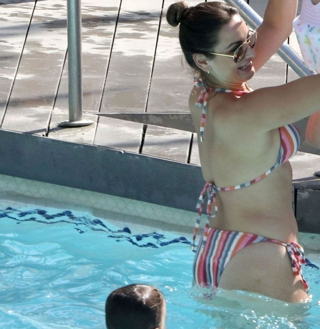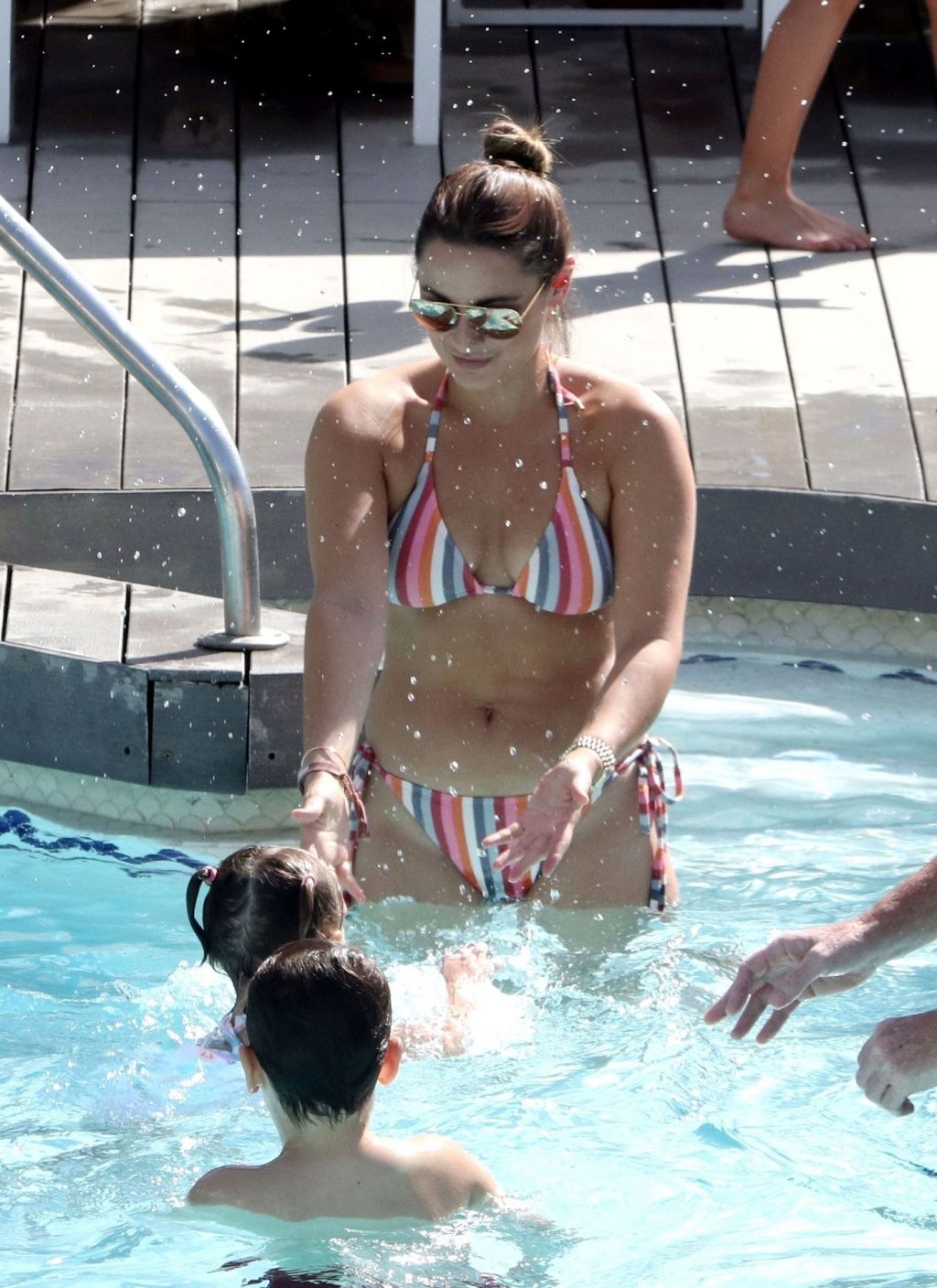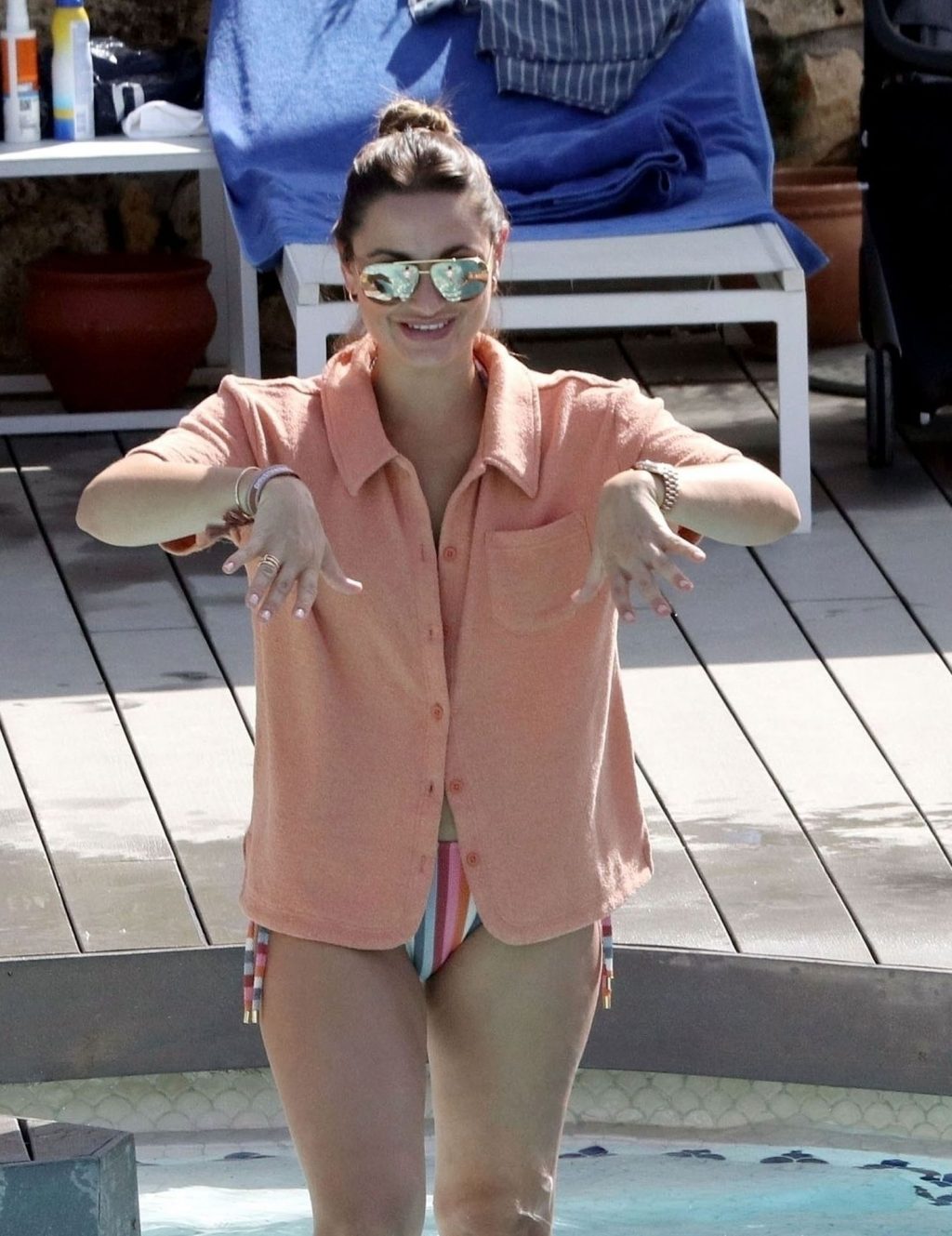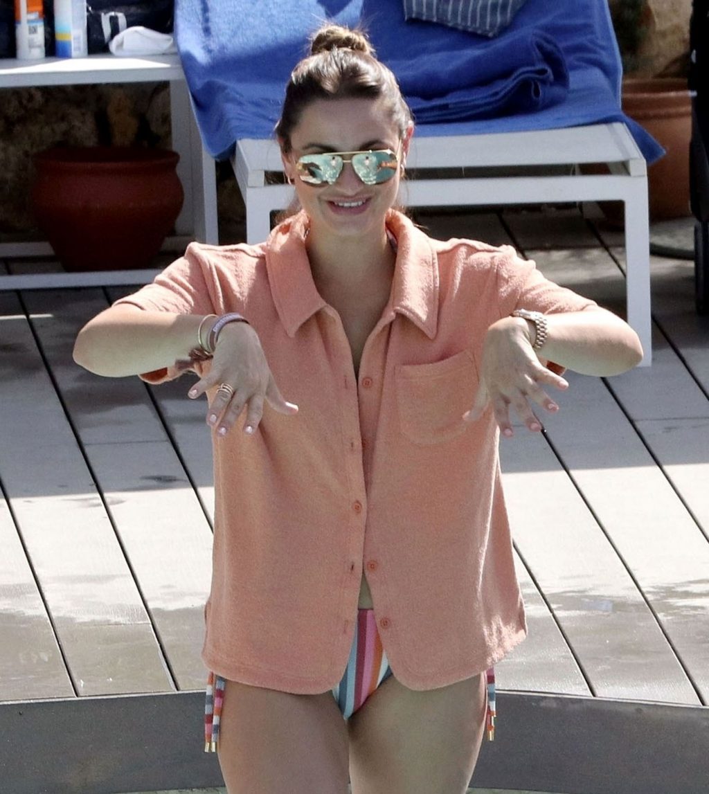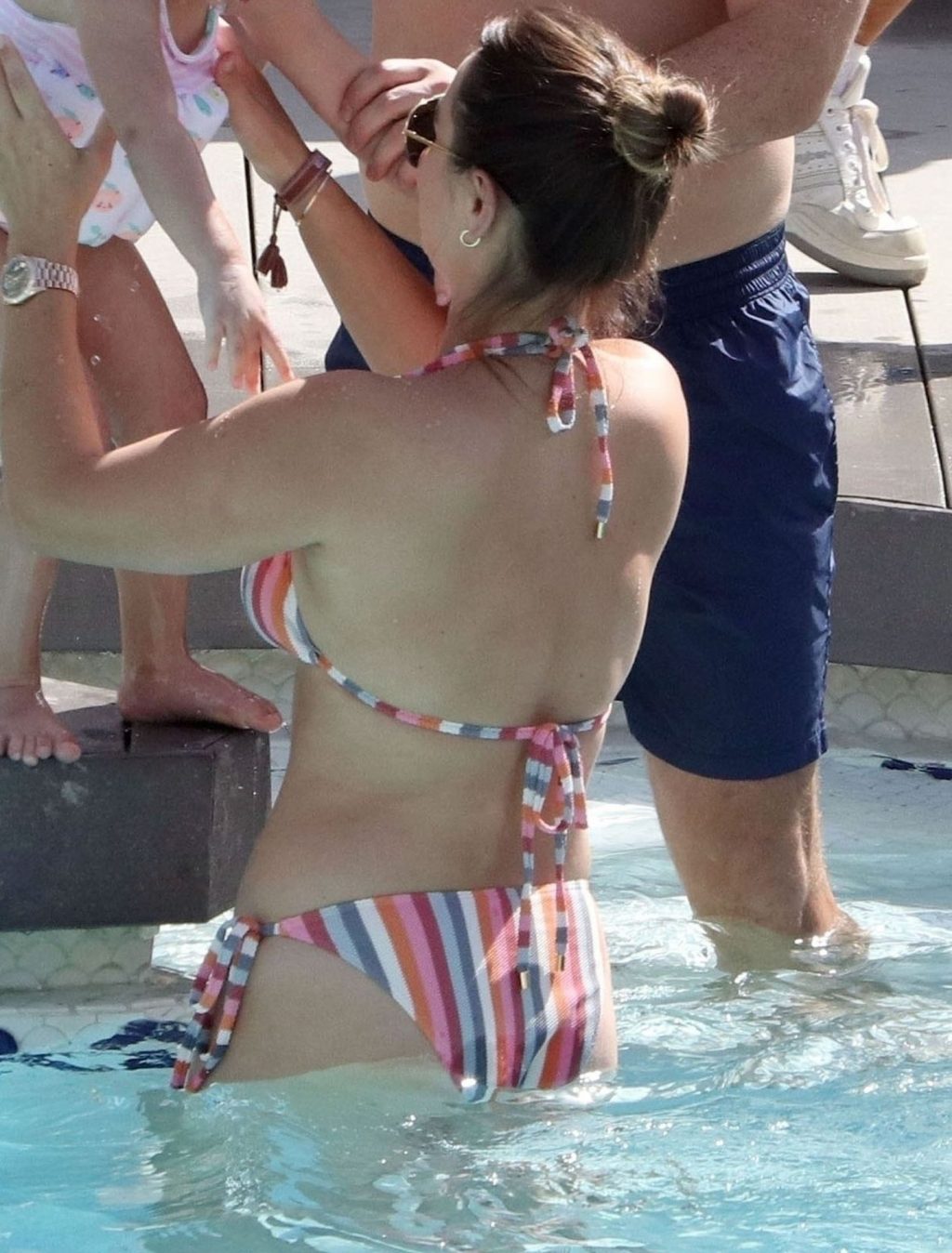 Sam llevaba un sexy bikini a rayas mientras su esposo Paul estaba sin camiseta divirtiéndose en su escapada española, chapoteando en la piscina y disfrutando de un tiempo en familia.