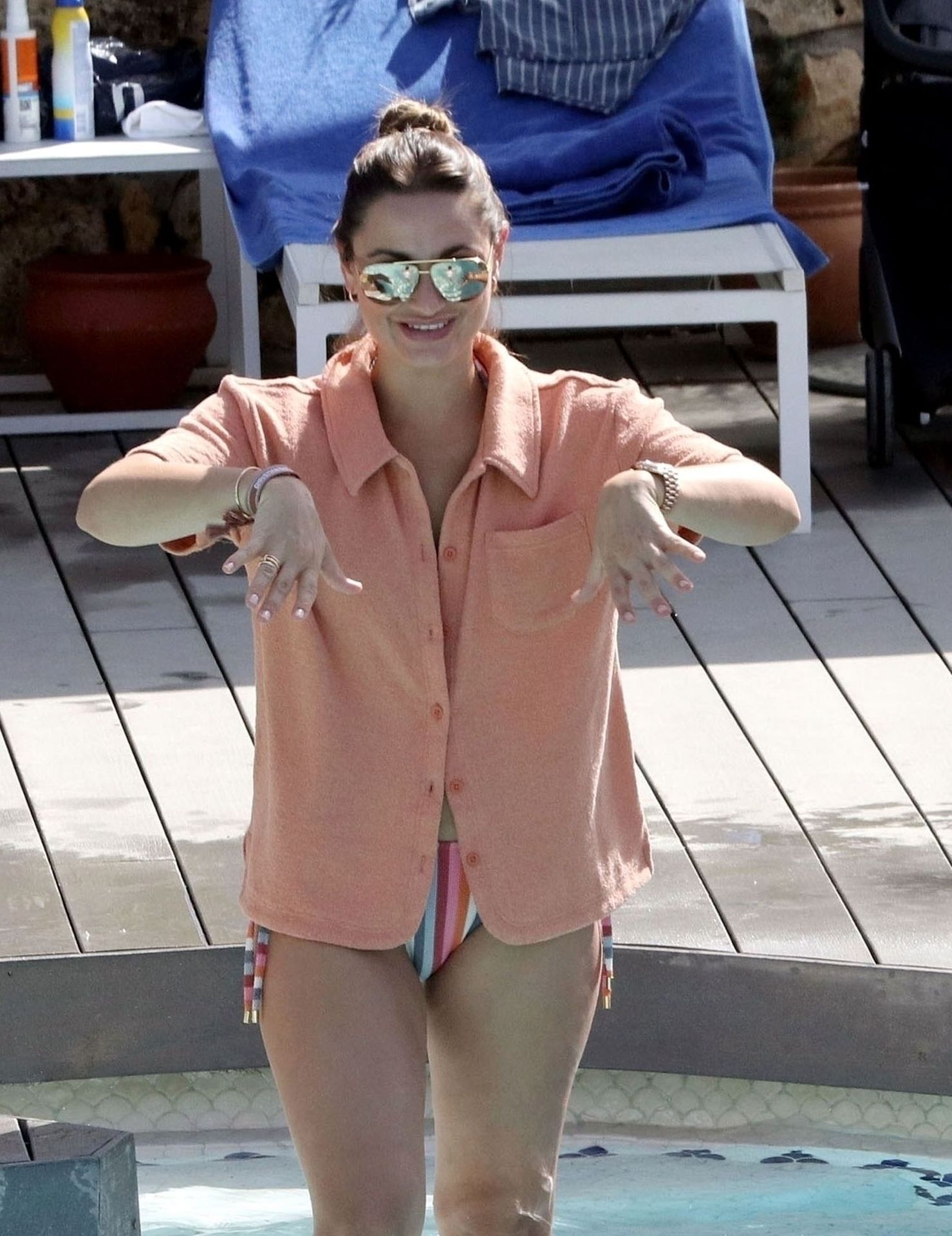 Sam llevaba un sexy bikini a rayas mientras su esposo Paul estaba sin camiseta divirtiéndose en su escapada española, chapoteando en la piscina y disfrutando de un tiempo en familia.