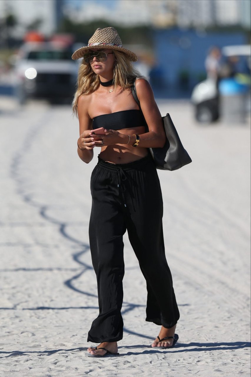 La modelo polaca recién soltera Sandra Kubicka muestra sus increíbles abdominales con un top de bikini bandeau y pantalones sueltos mientras pasa tiempo en Miami Beach, 21/10/2018.