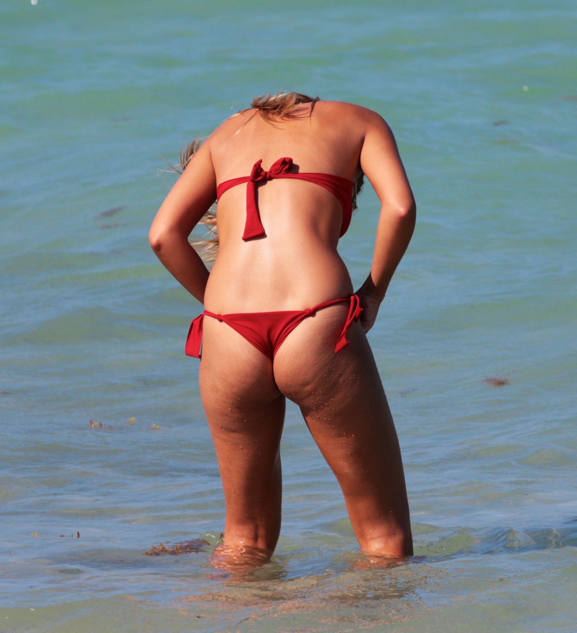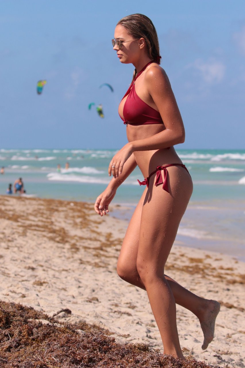 Sandra Kubicka lleva un bikini tanga rojo con amigos en la playa de Miami, 29/04/2017. Sandra Kubicka es una modelo de Polonia. Edad – 22 años (nacida el 22 de enero de 1995).