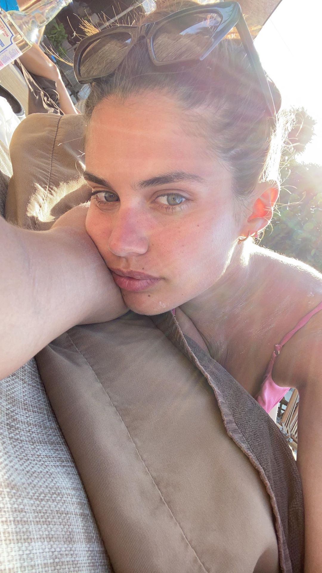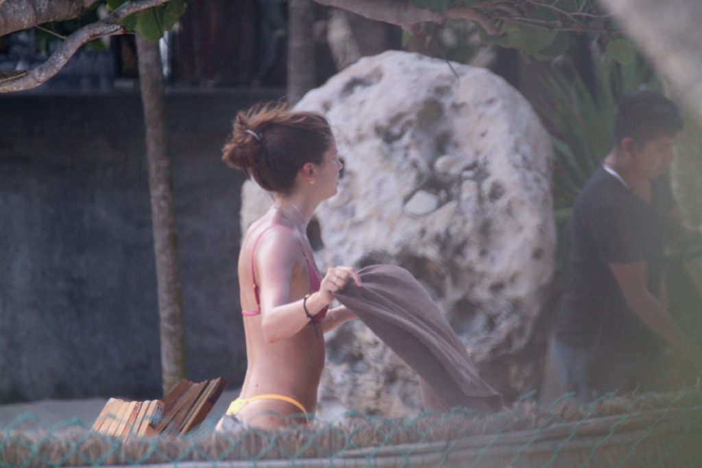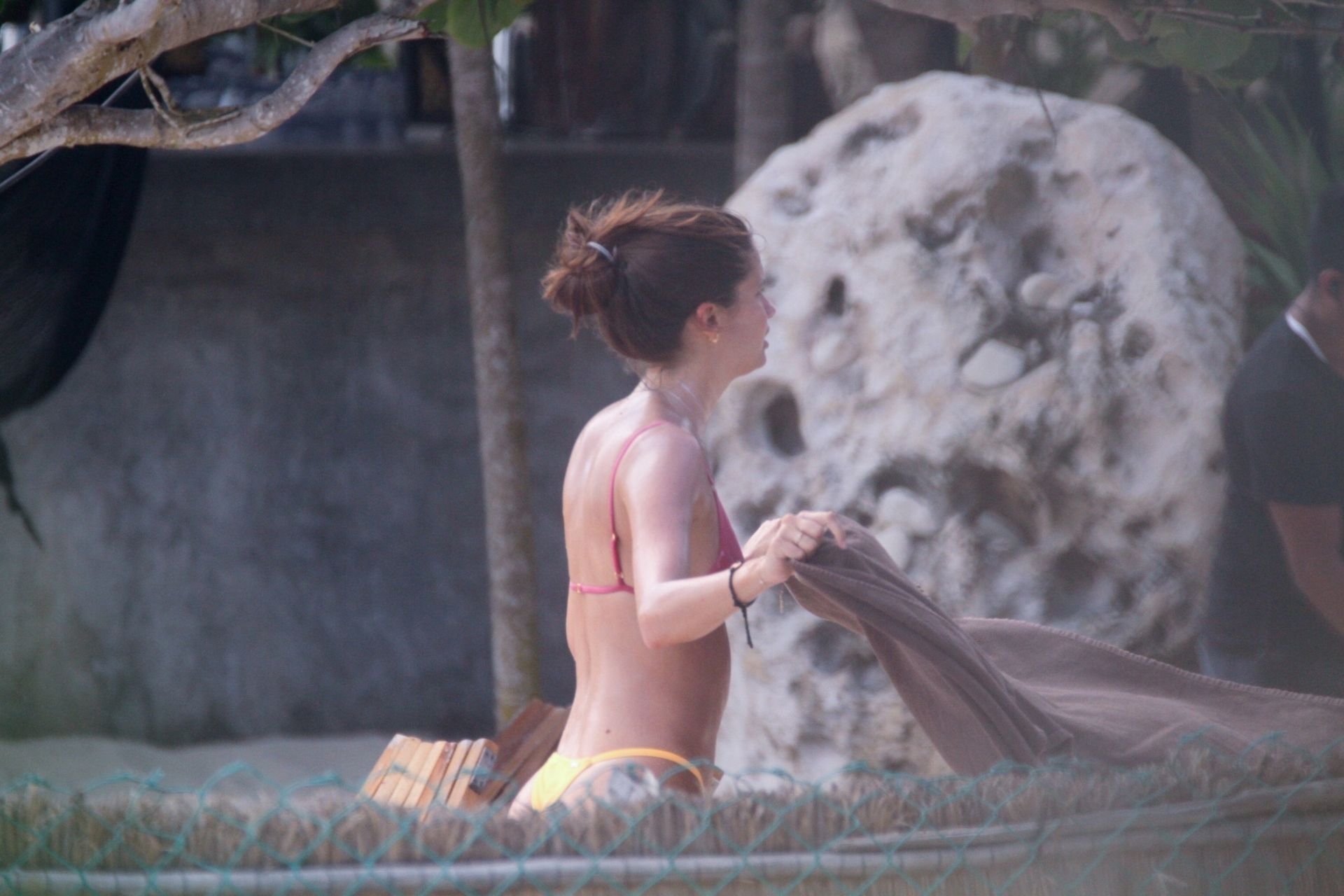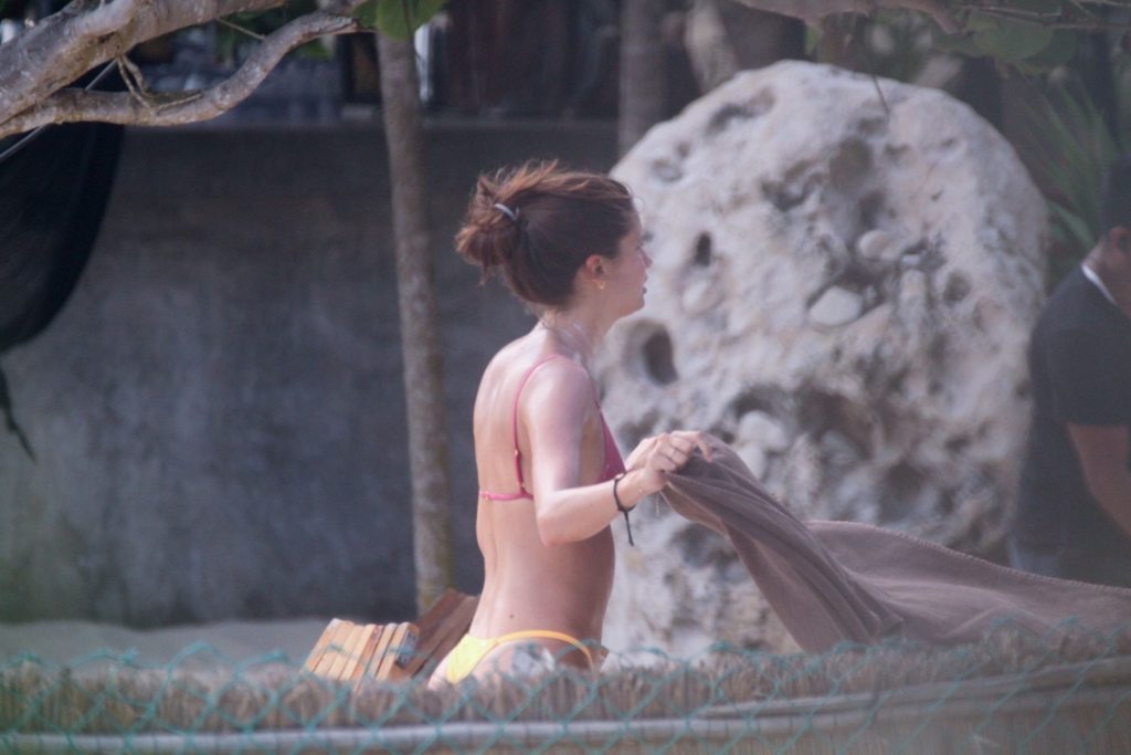 La modelo portuguesa Sara Sampaio disfruta de una sesión de bronceado por la tarde en la piscina durante sus vacaciones en Tulum, México, 29/11/2019.