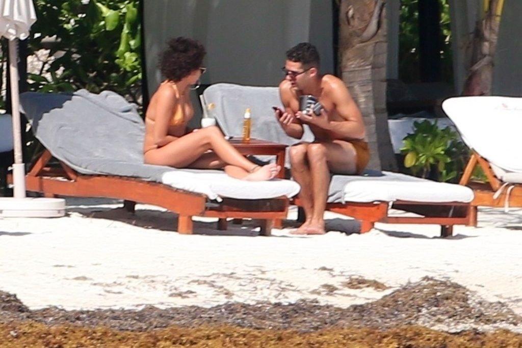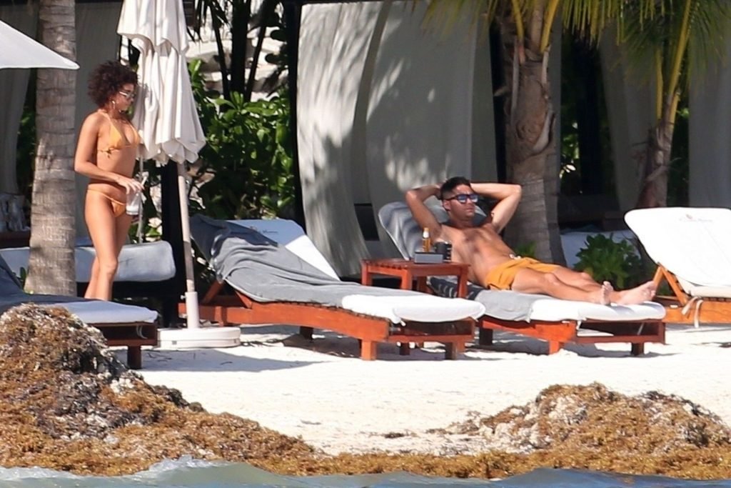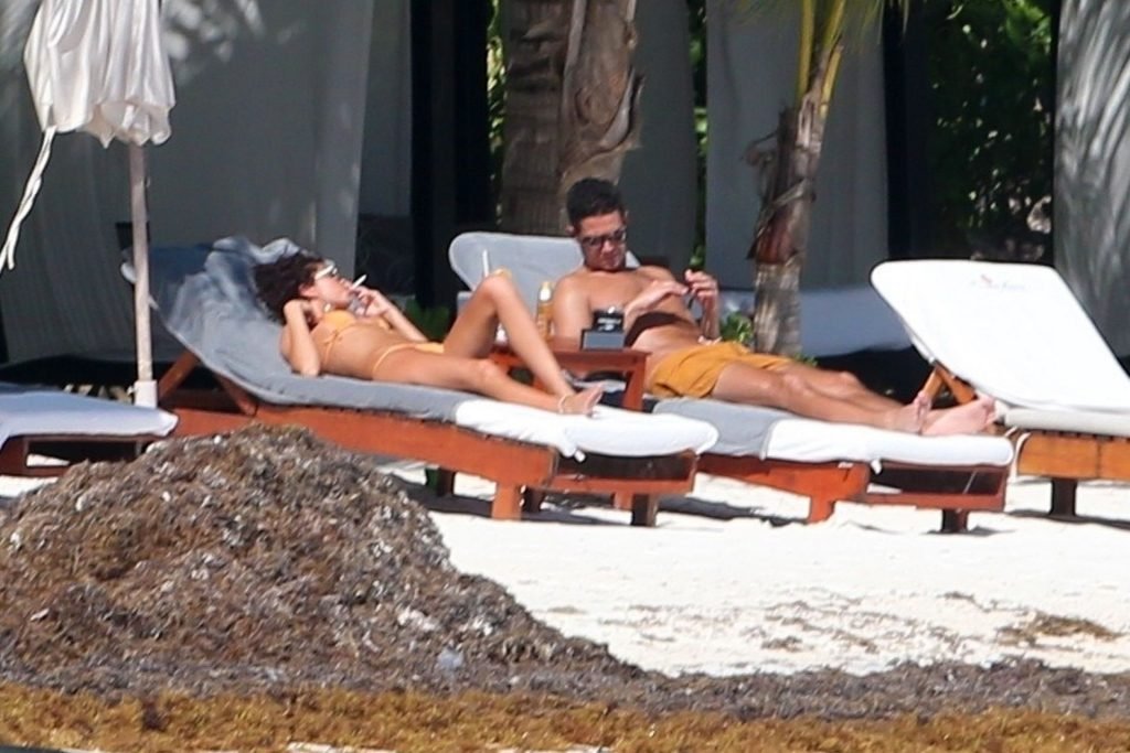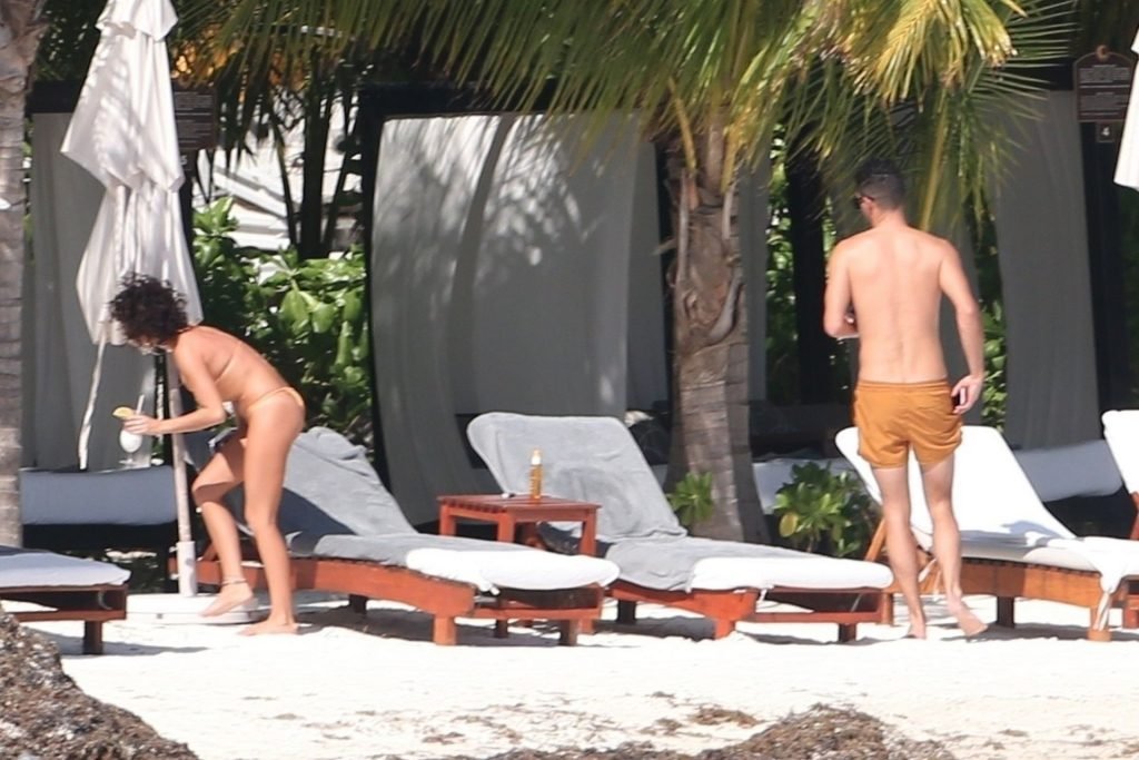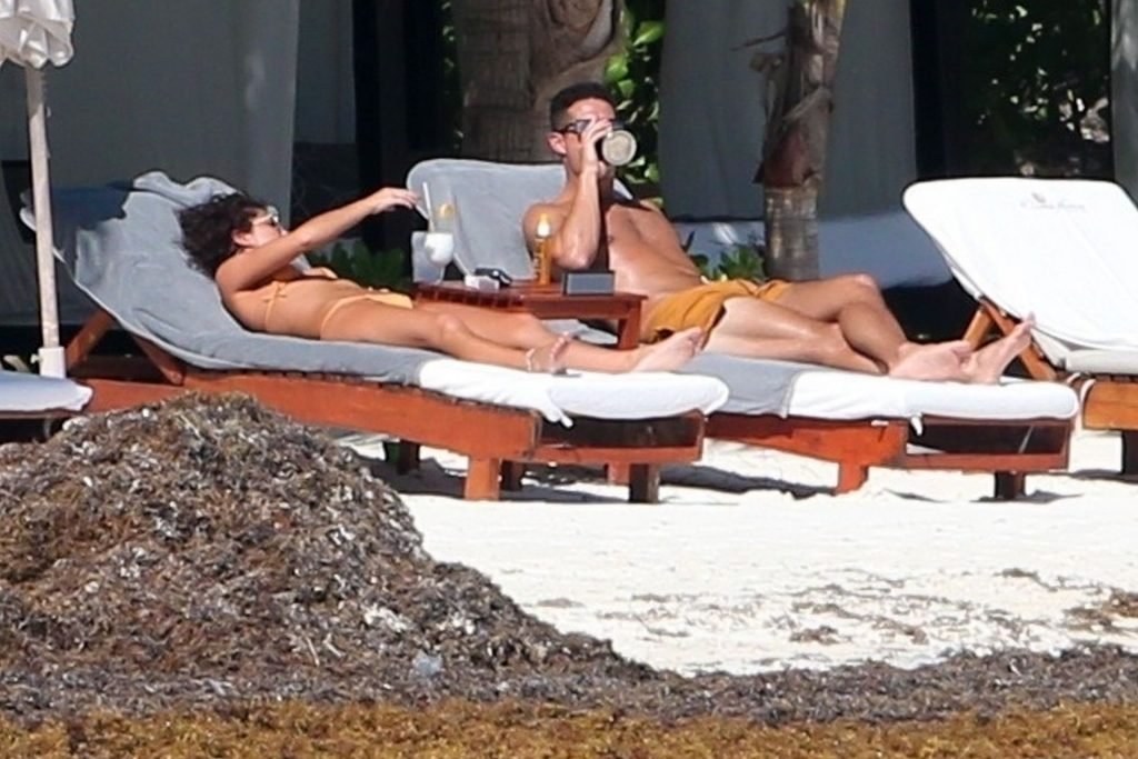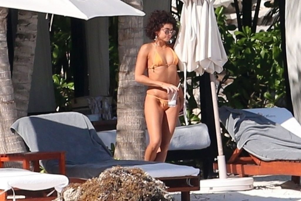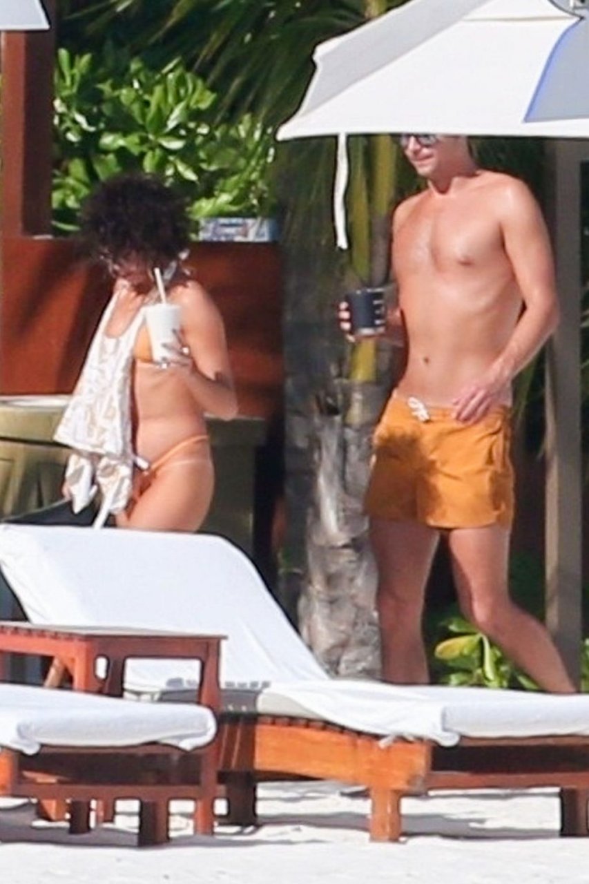 “Modern Family” y la estrella de The Fappening muestran su figura delgada en un bikini, mientras ella y su novio disfrutan de bebidas frías en la playa de su hotel juntos, 01/04/2019.