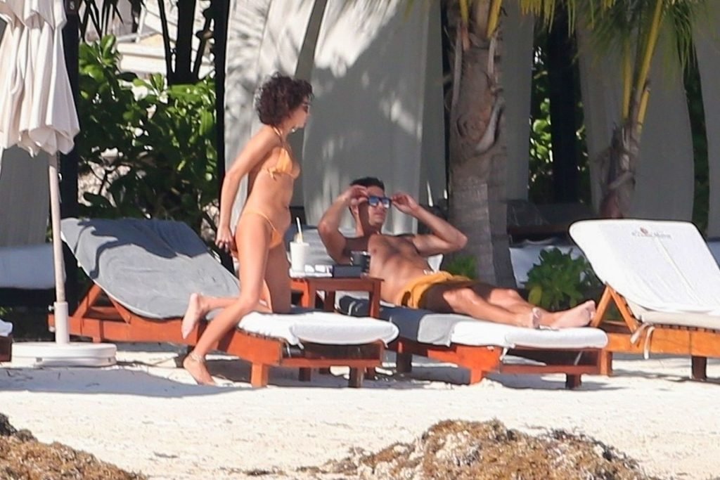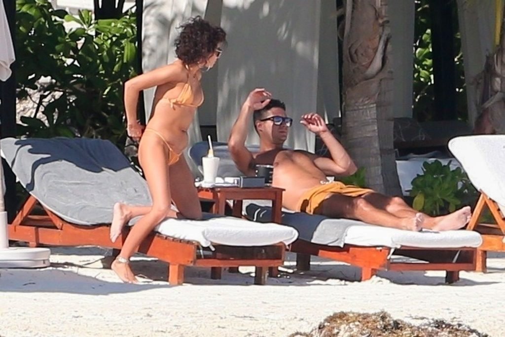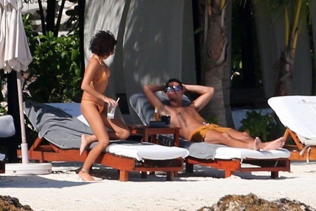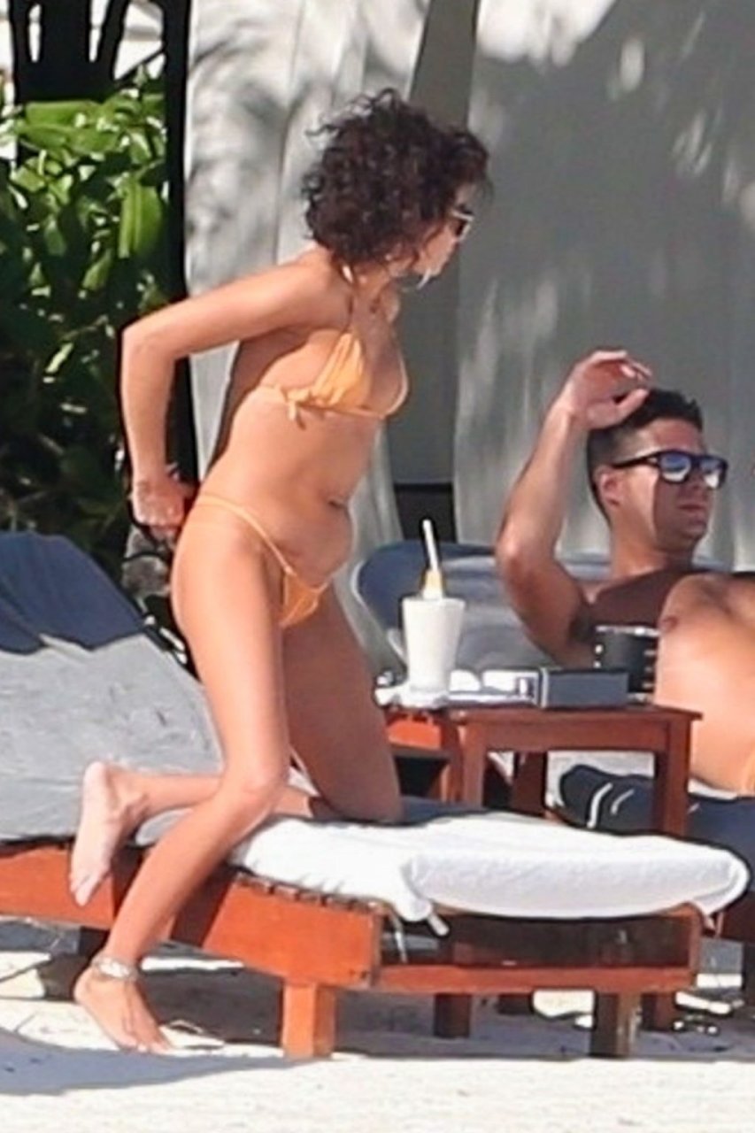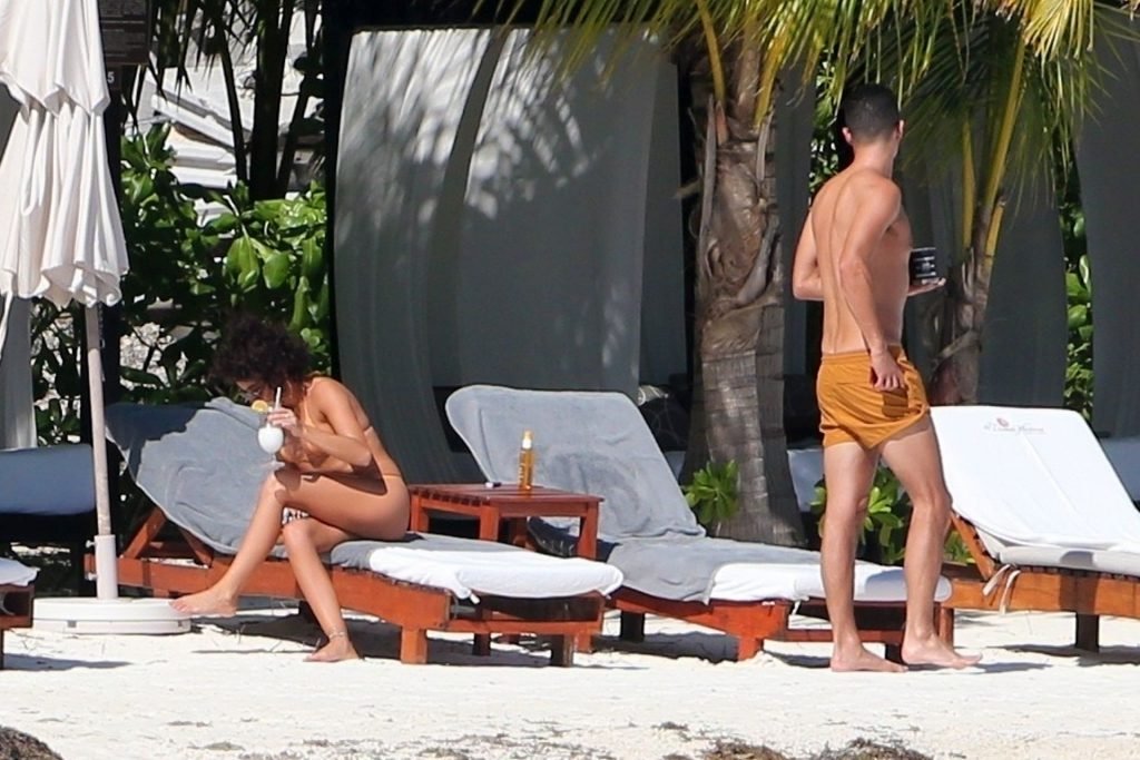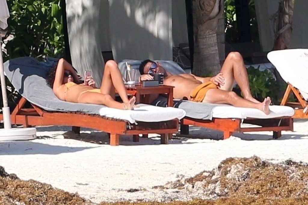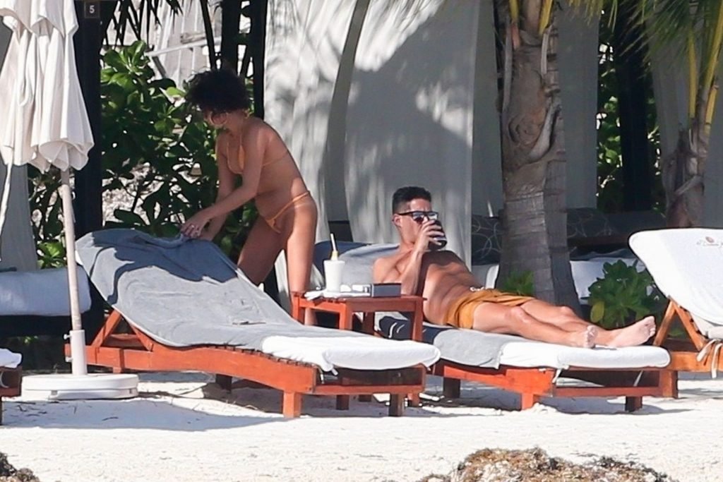 “Modern Family” y la estrella de The Fappening muestran su figura delgada en un bikini, mientras ella y su novio disfrutan de bebidas frías en la playa de su hotel juntos, 01/04/2019.