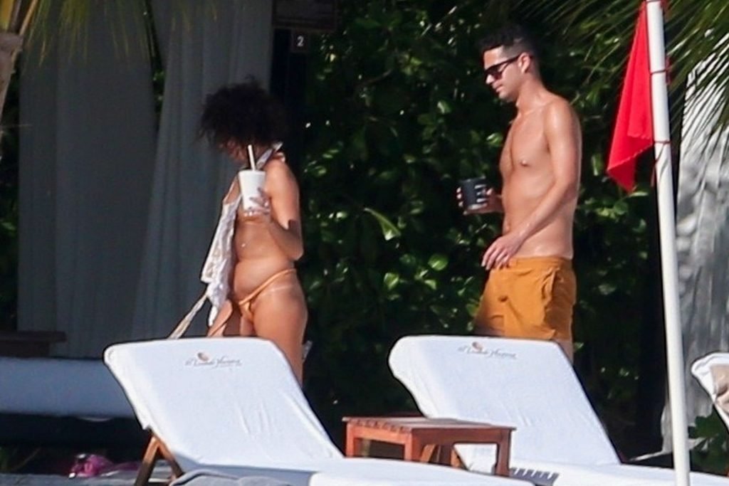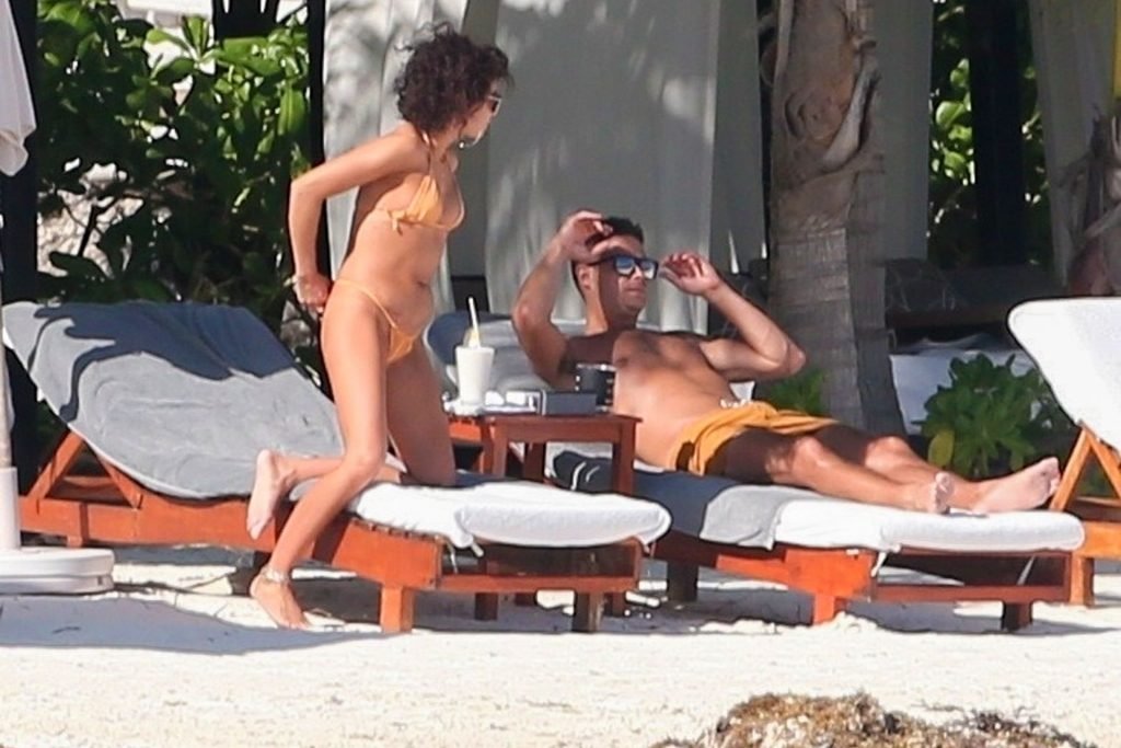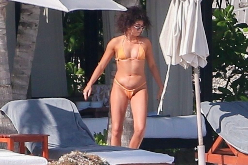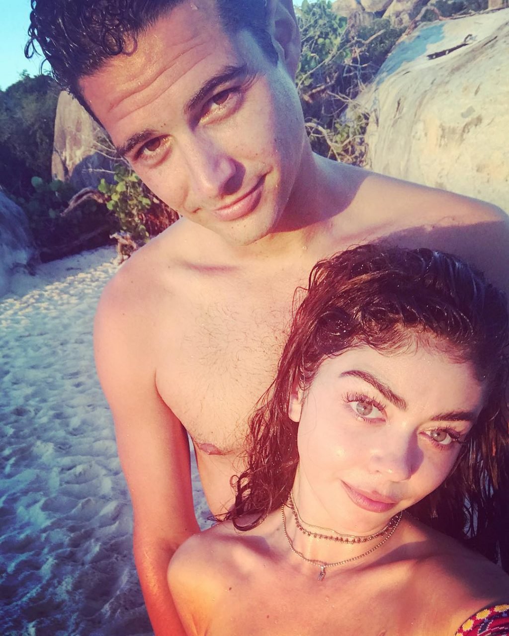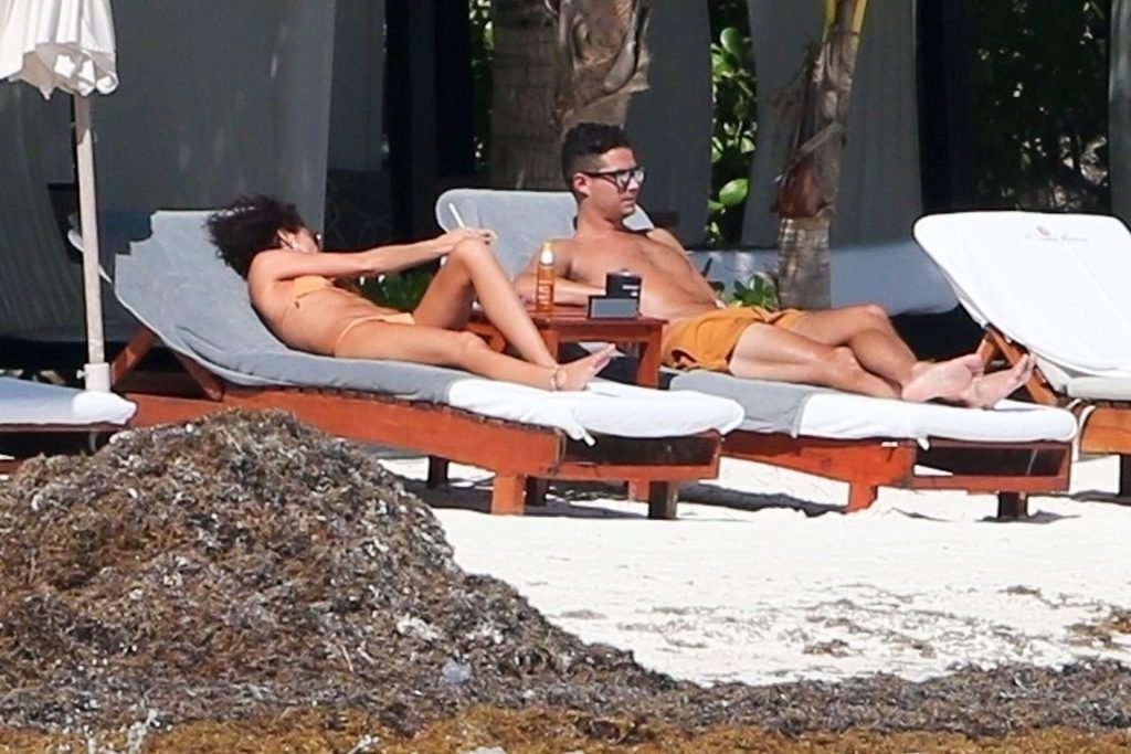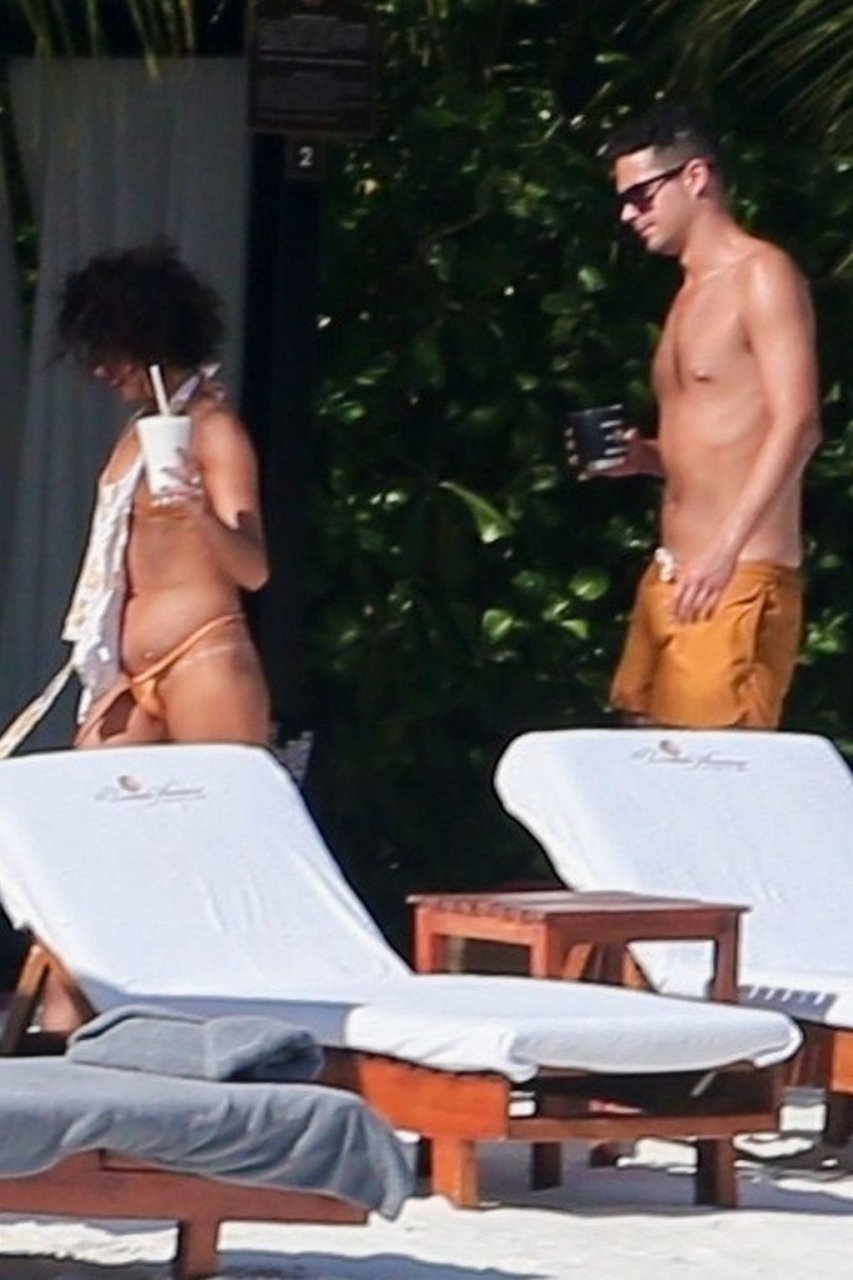 “Modern Family” y la estrella de The Fappening muestran su figura delgada en un bikini, mientras ella y su novio disfrutan de bebidas frías en la playa de su hotel juntos, 01/04/2019.