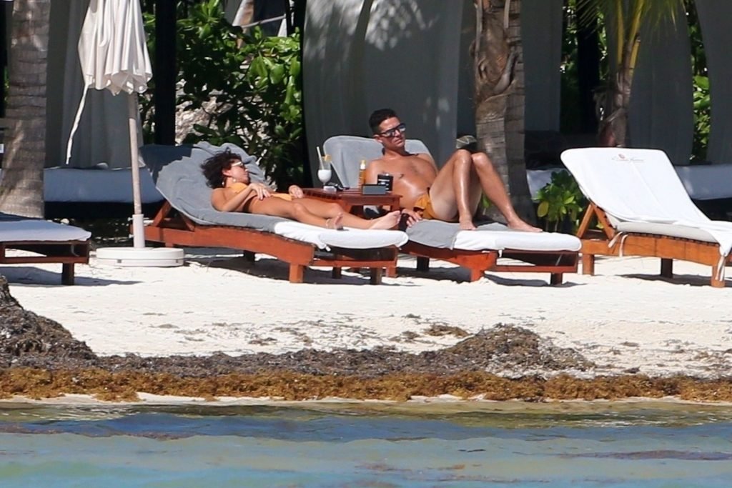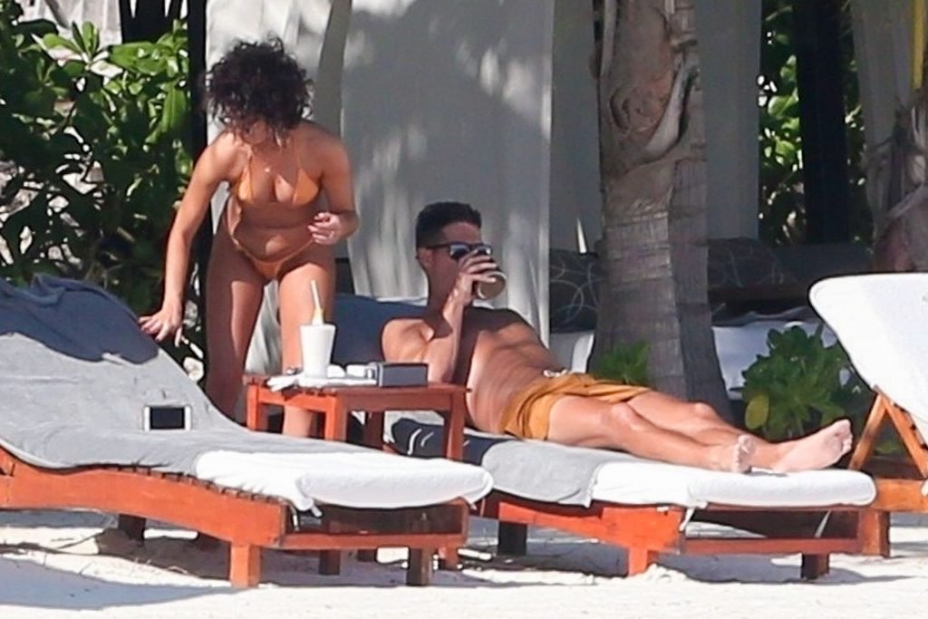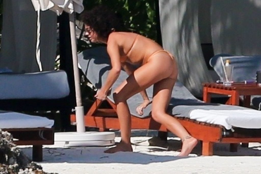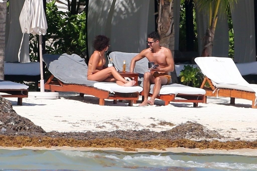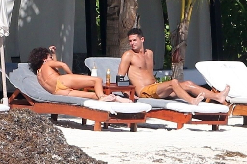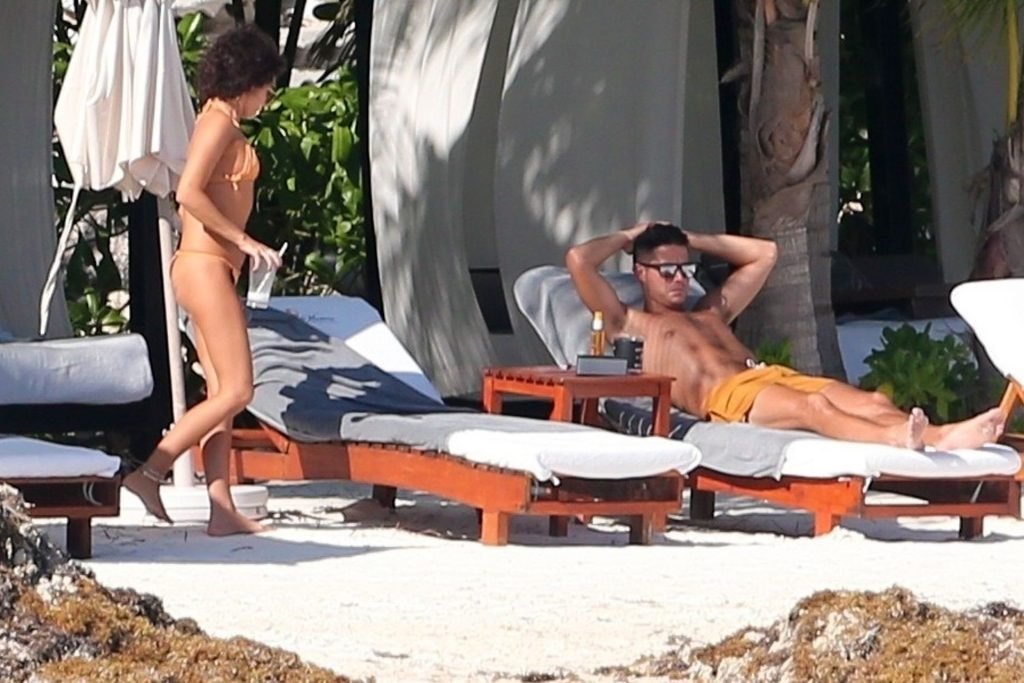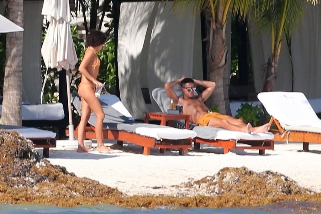 “Modern Family” y la estrella de The Fappening muestran su figura delgada en un bikini, mientras ella y su novio disfrutan de bebidas frías en la playa de su hotel juntos, 01/04/2019.