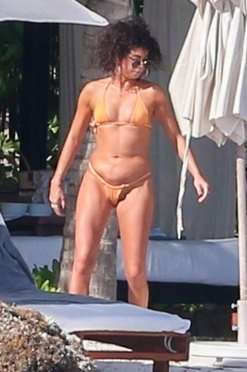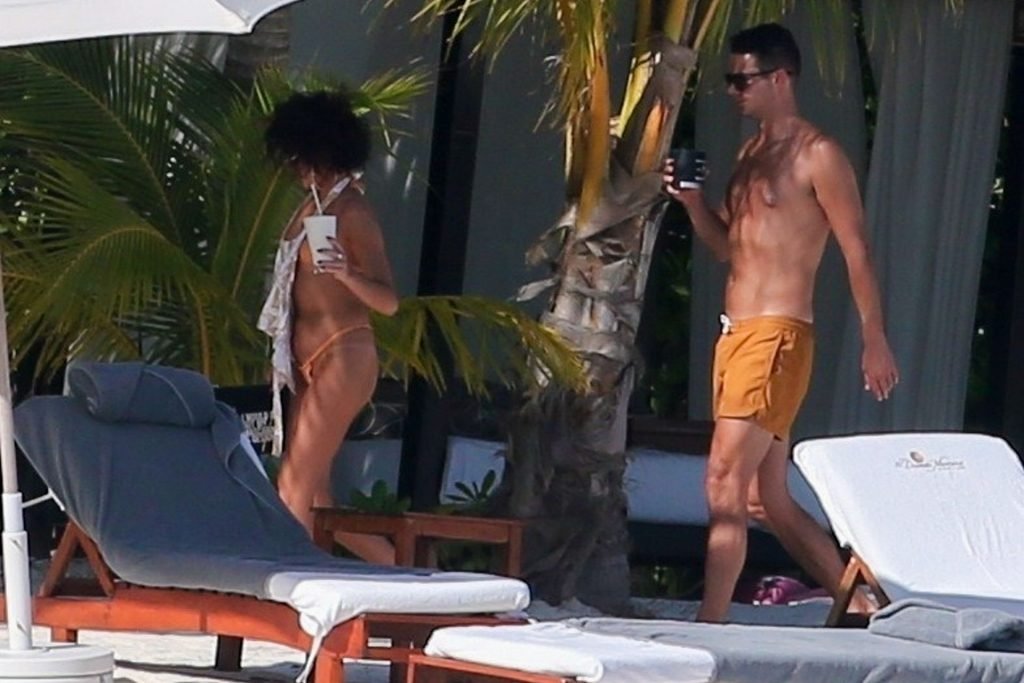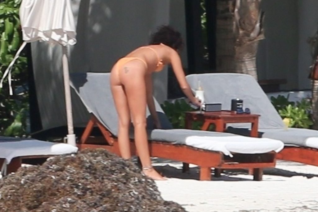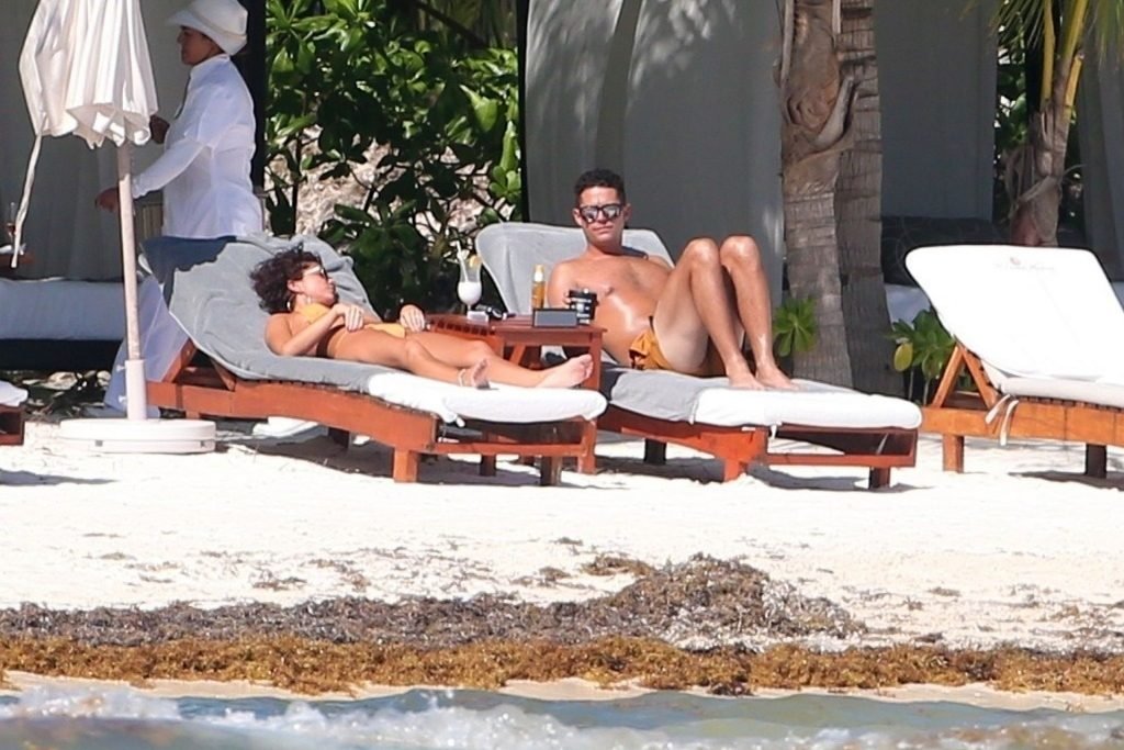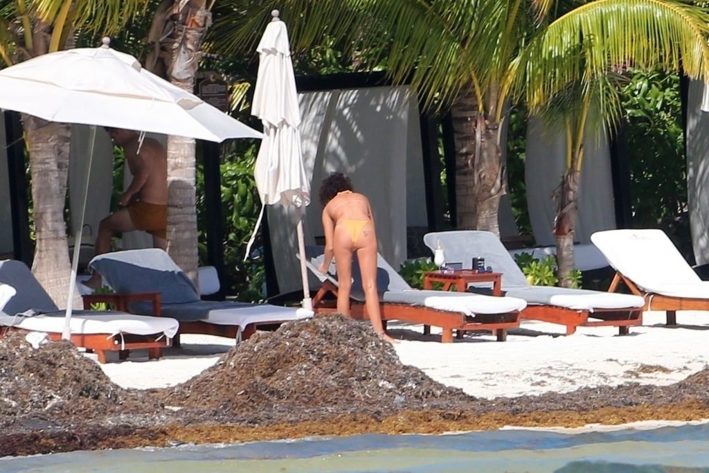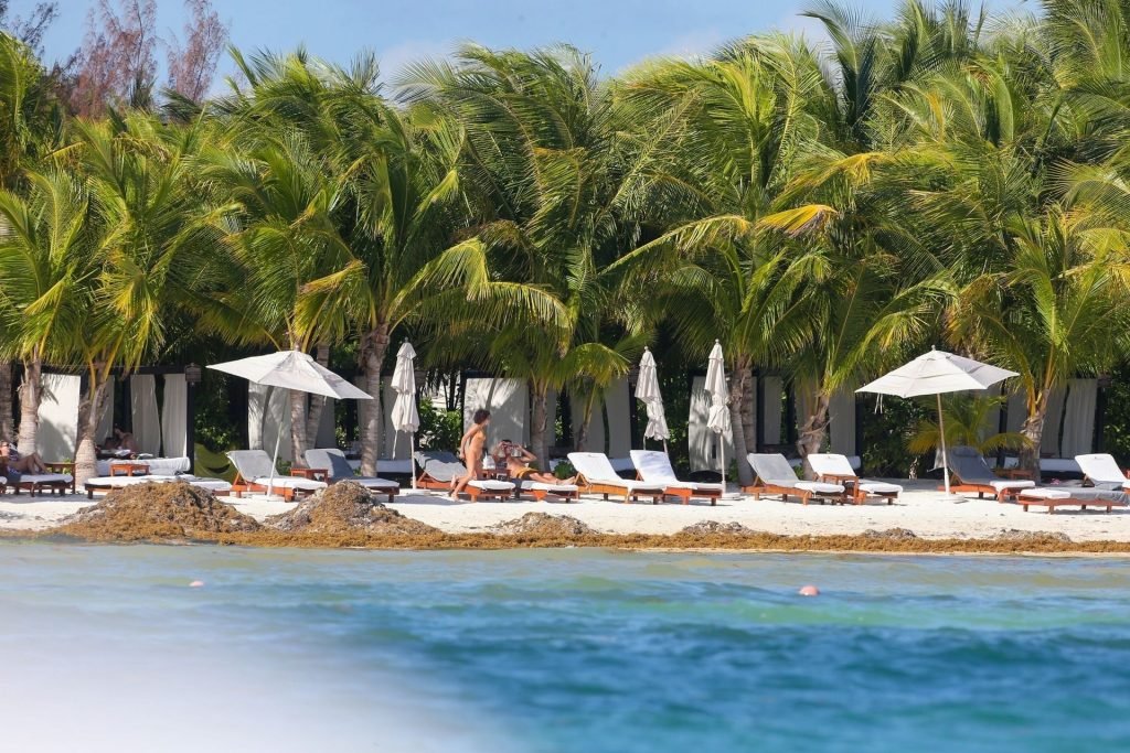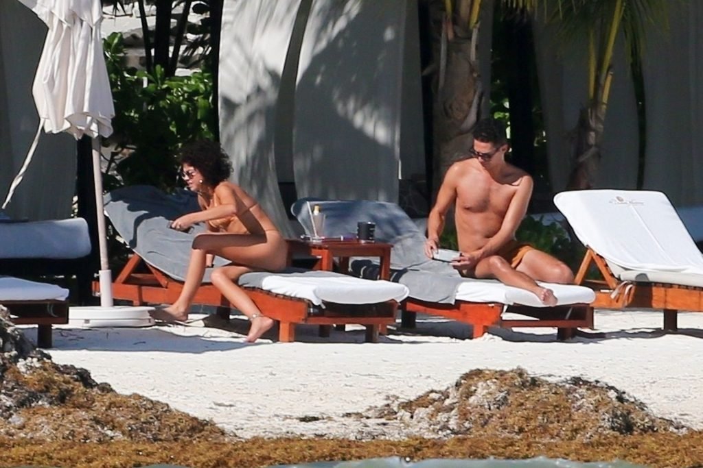 “Modern Family” y la estrella de The Fappening muestran su figura delgada en un bikini, mientras ella y su novio disfrutan de bebidas frías en la playa de su hotel juntos, 01/04/2019.